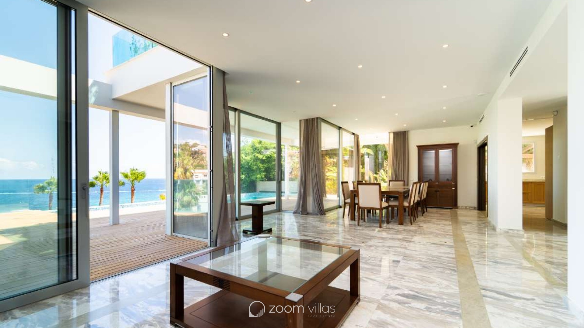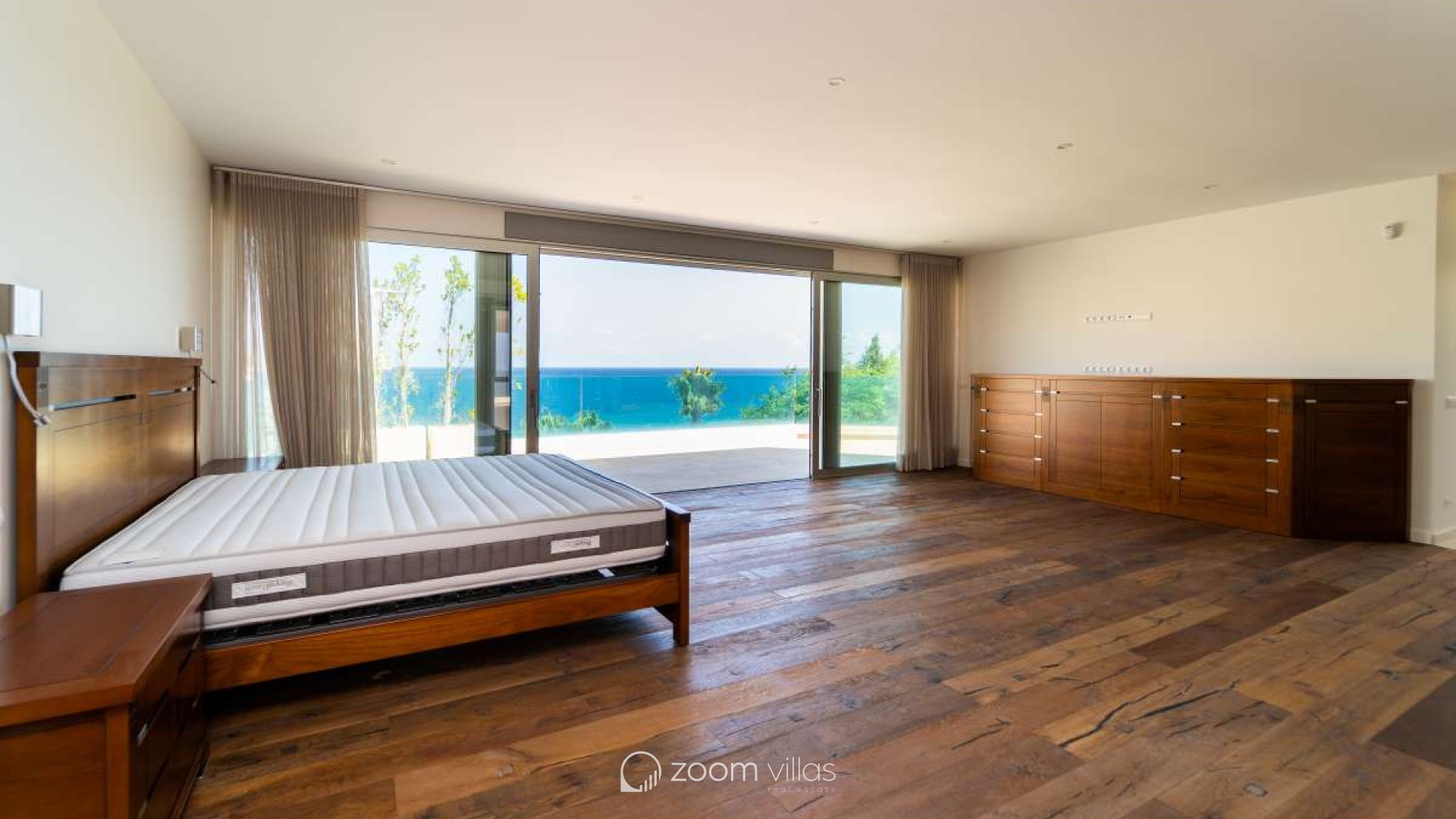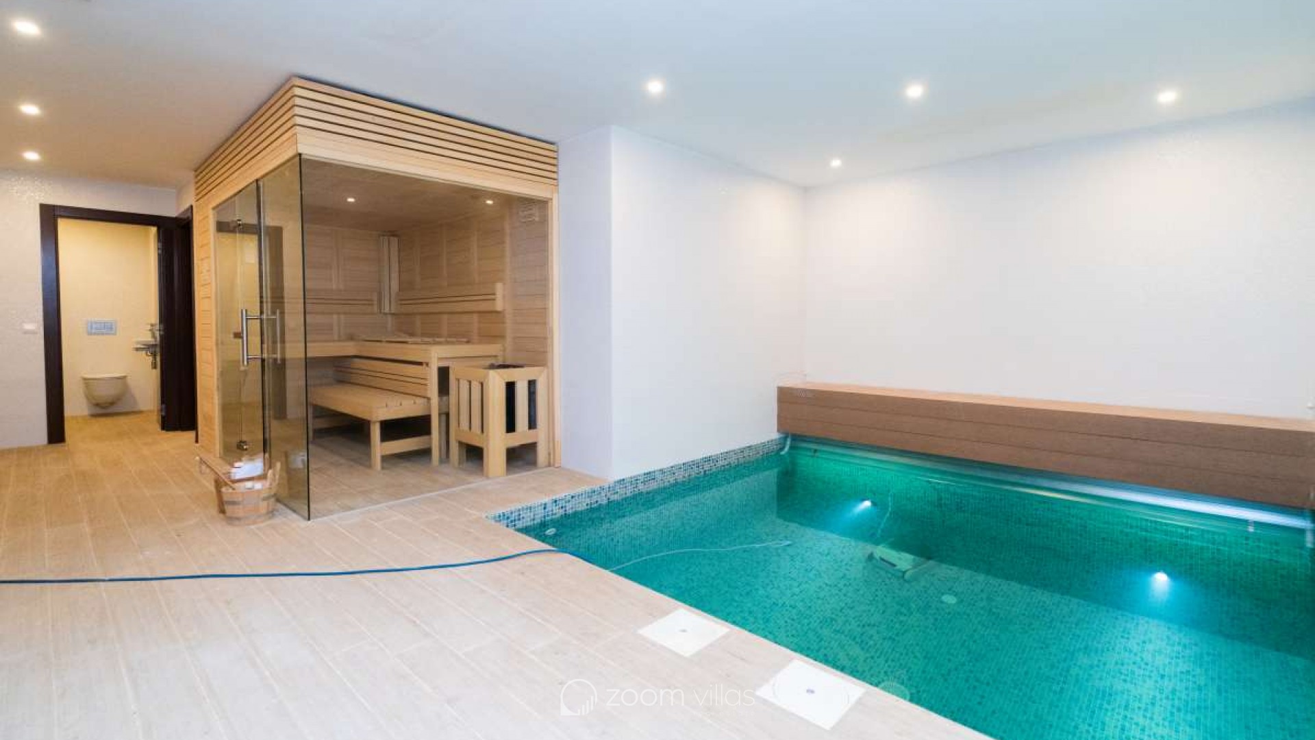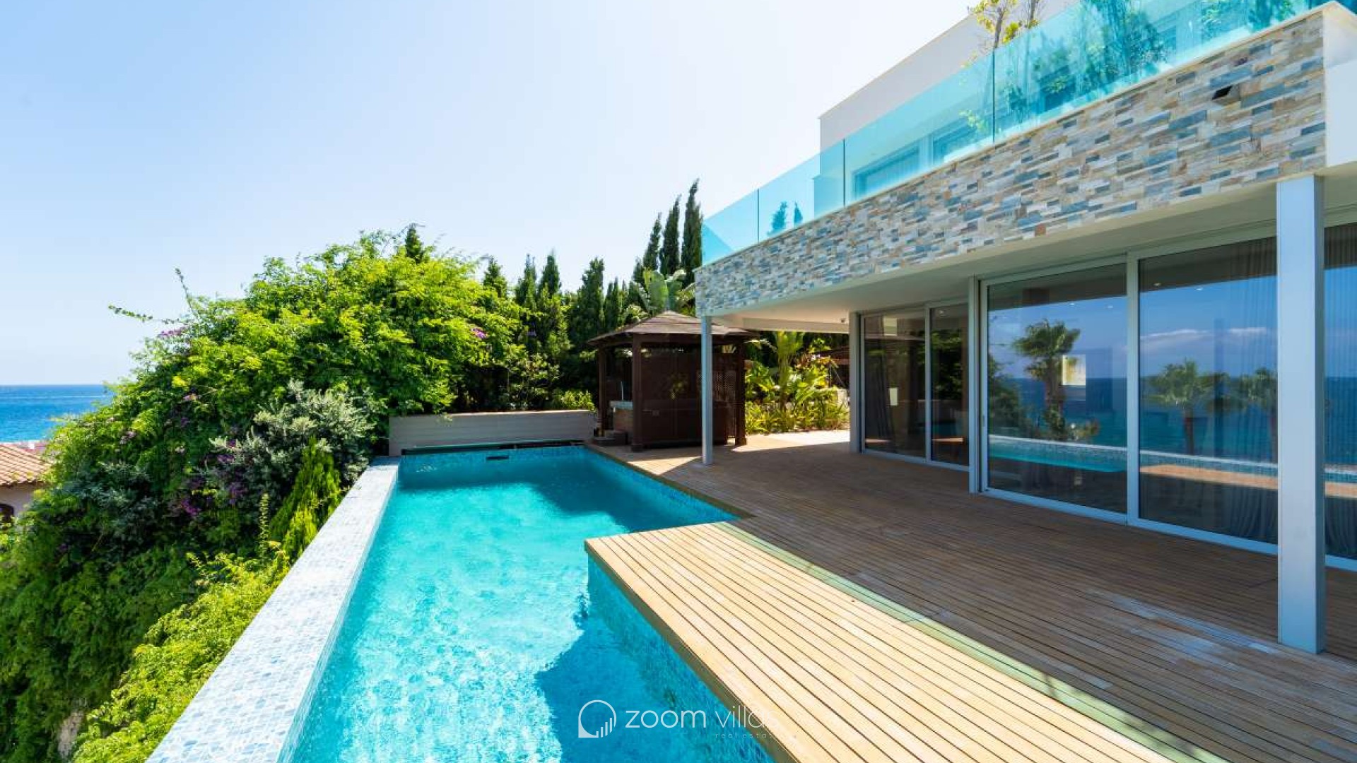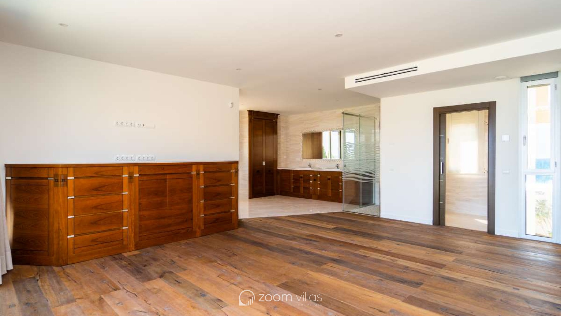 Auf der Hauptetage finden Sie eine große, voll ausgestattete Küche, ein Wohn-Esszimmer, das sich durch große Türen/Fenster zum Infinity-Pool öffnet, und einen gemütlichen Entspannungsbereich mit Jacuzzi. Die Junior-Suite hat direkten Zugang zum Poolbereich, der mit dünnen Holzleisten verkleidet ist.