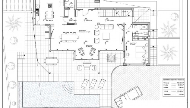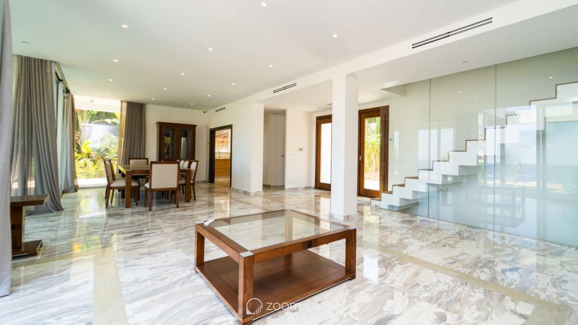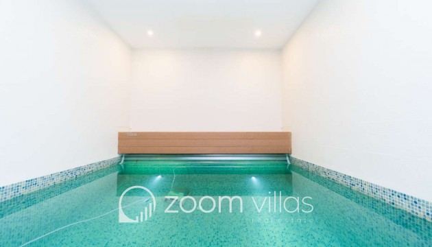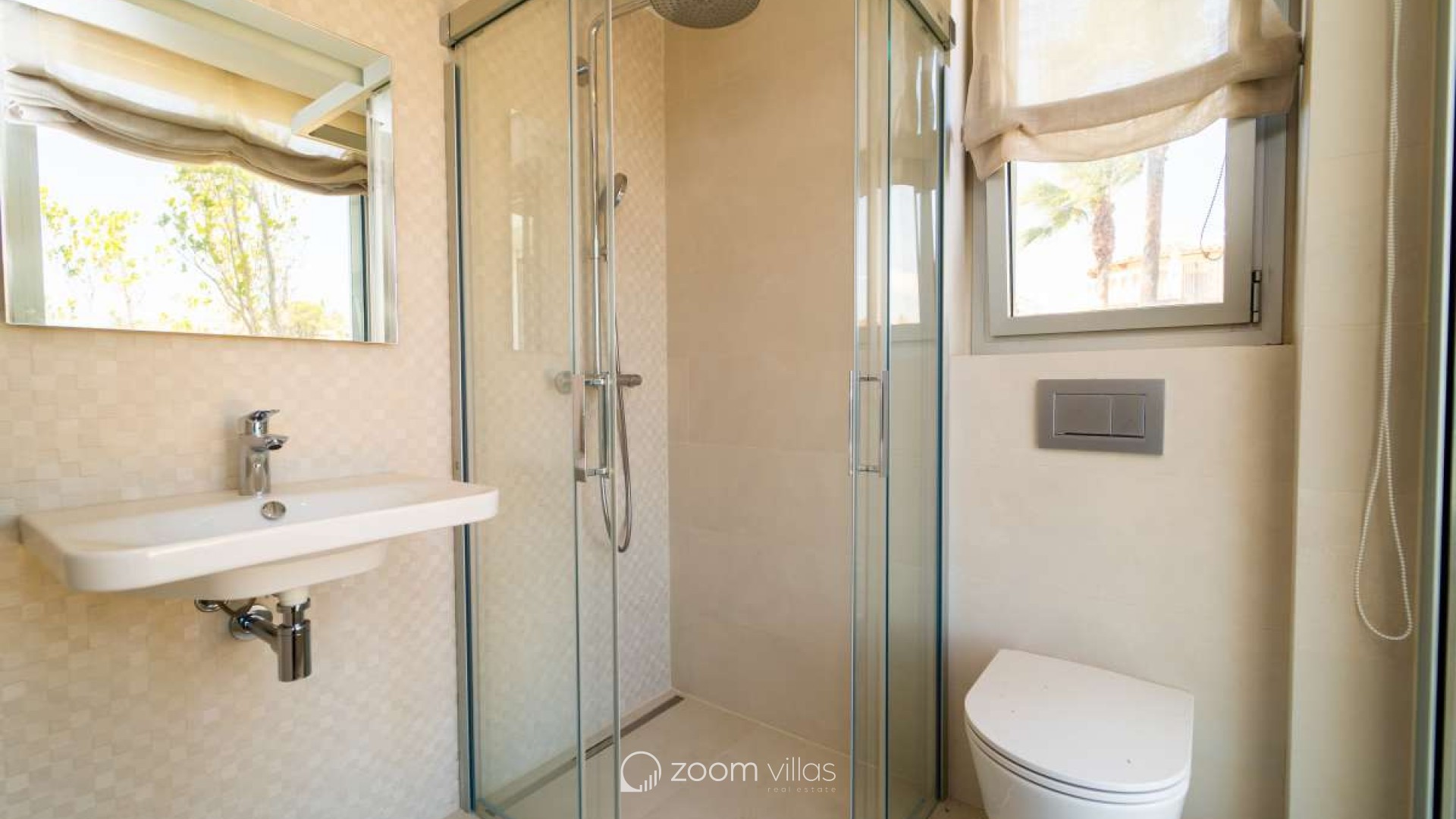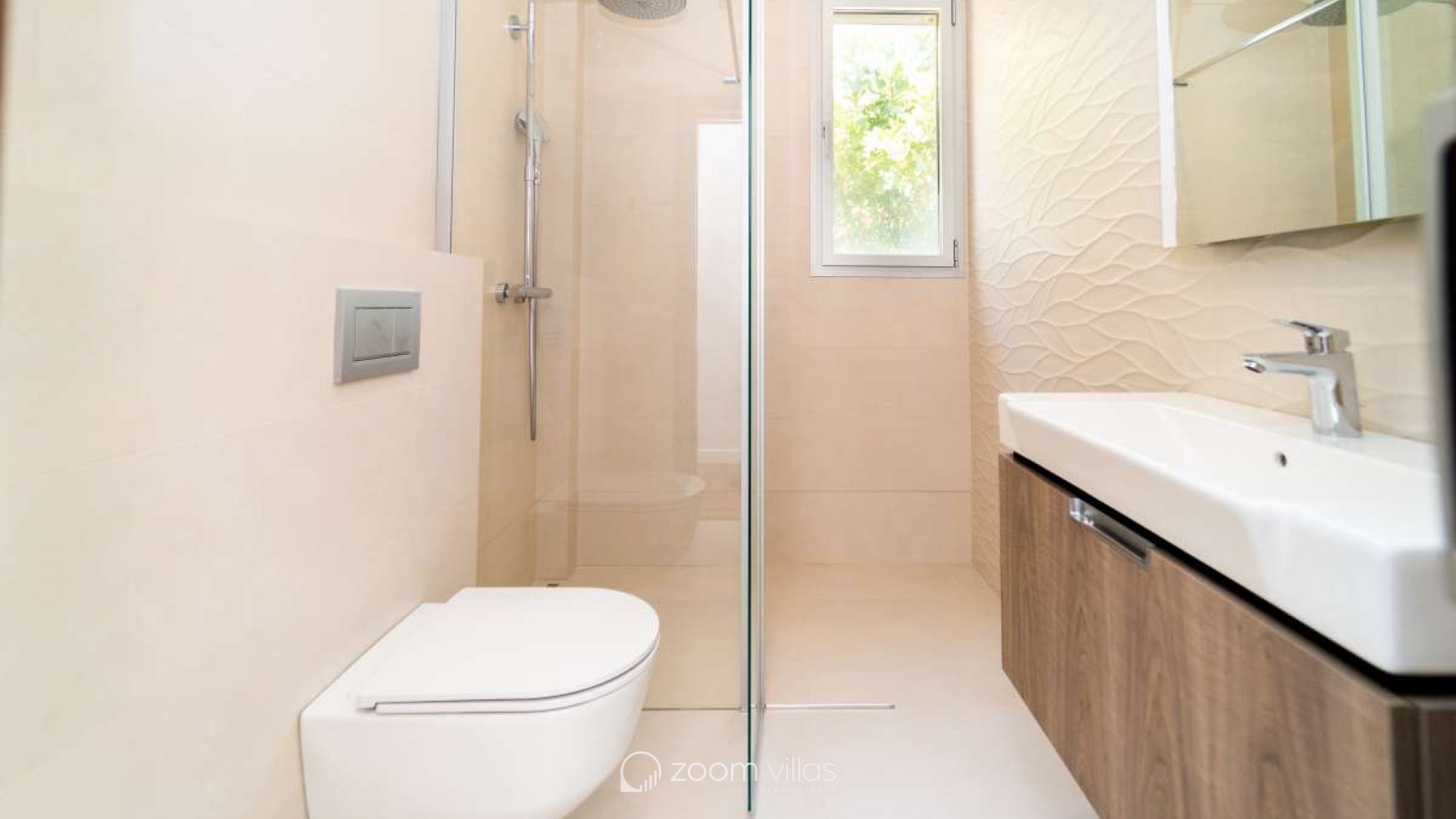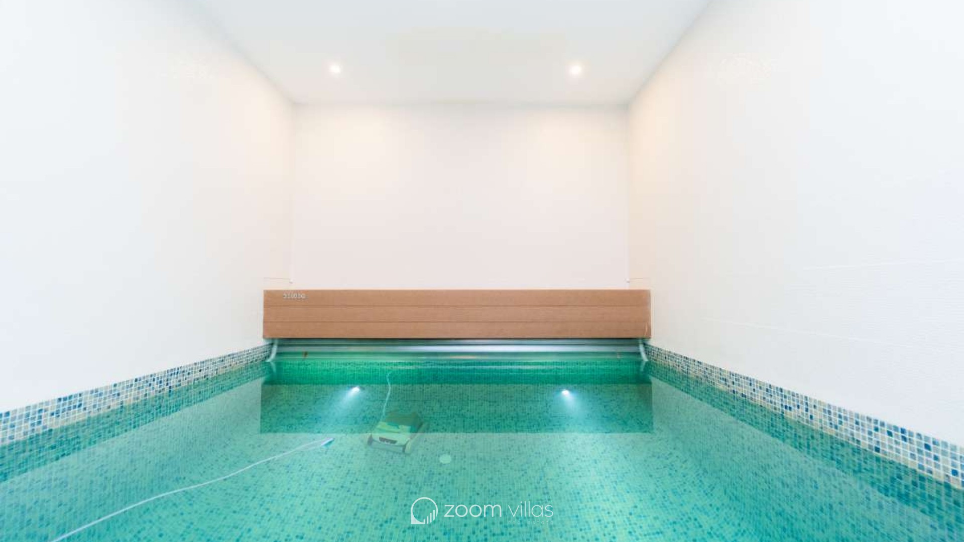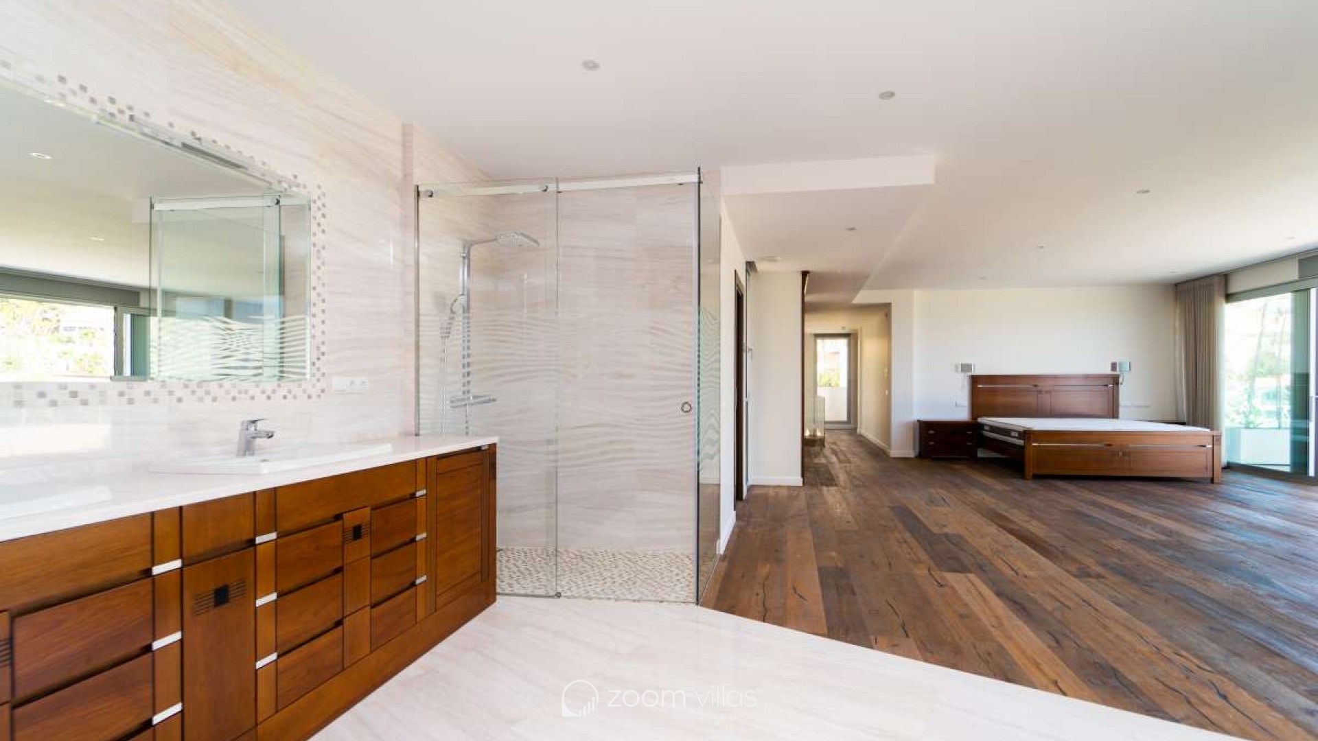Auf der Hauptetage finden Sie eine große, voll ausgestattete Küche, ein Wohn-Esszimmer, das sich durch große Türen/Fenster zum Infinity-Pool öffnet, und einen gemütlichen Entspannungsbereich mit Jacuzzi. Die Junior-Suite hat direkten Zugang zum Poolbereich, der mit dünnen Holzleisten verkleidet ist.