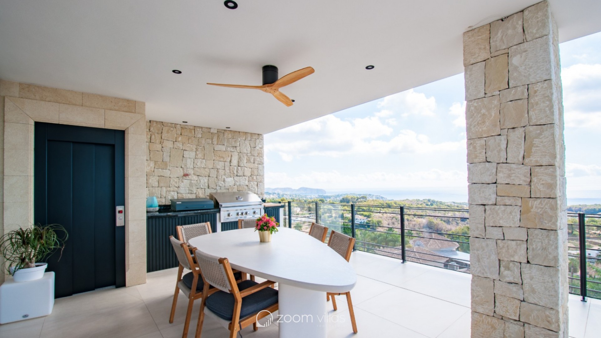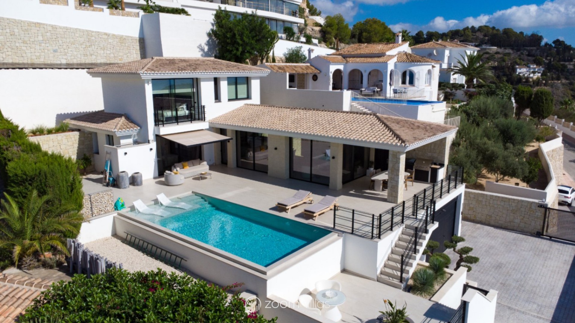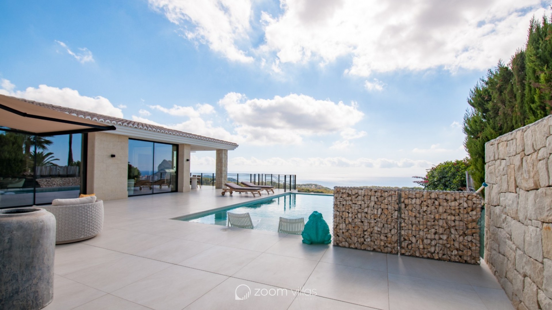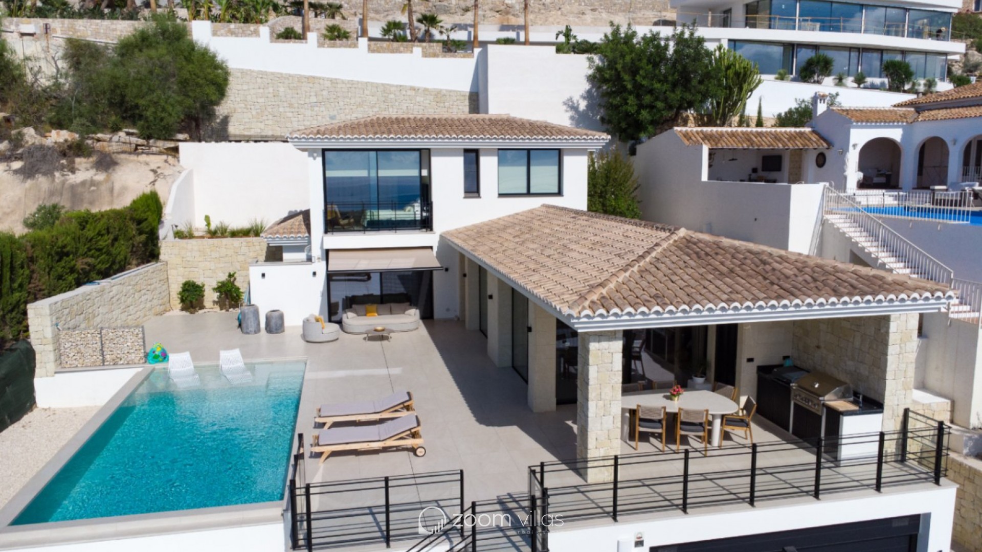 Luxusvilla zum Verkauf in Benissa mit Panoramablick auf das Meer. Sie verfügt über 3 Schlafzimmer, 2 Badezimmer, einen 9x4 m großen Pool, eine 145 m² große Terrasse, eine Außenküche und eine 60 m² große Garage. Sie beinhaltet Fußbodenheizung, zentralisierte Klimaanlage, Solarpanelen und hochwertige Ausstattungen. Sie liegt nur 5 Minuten von Cala La Fustera entfernt.