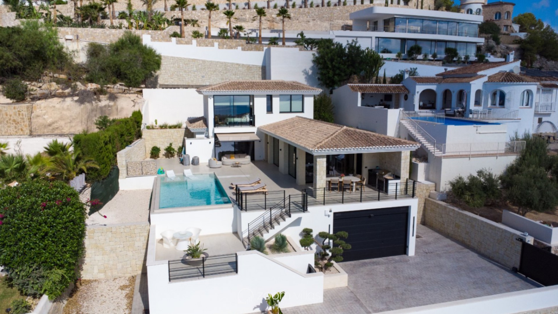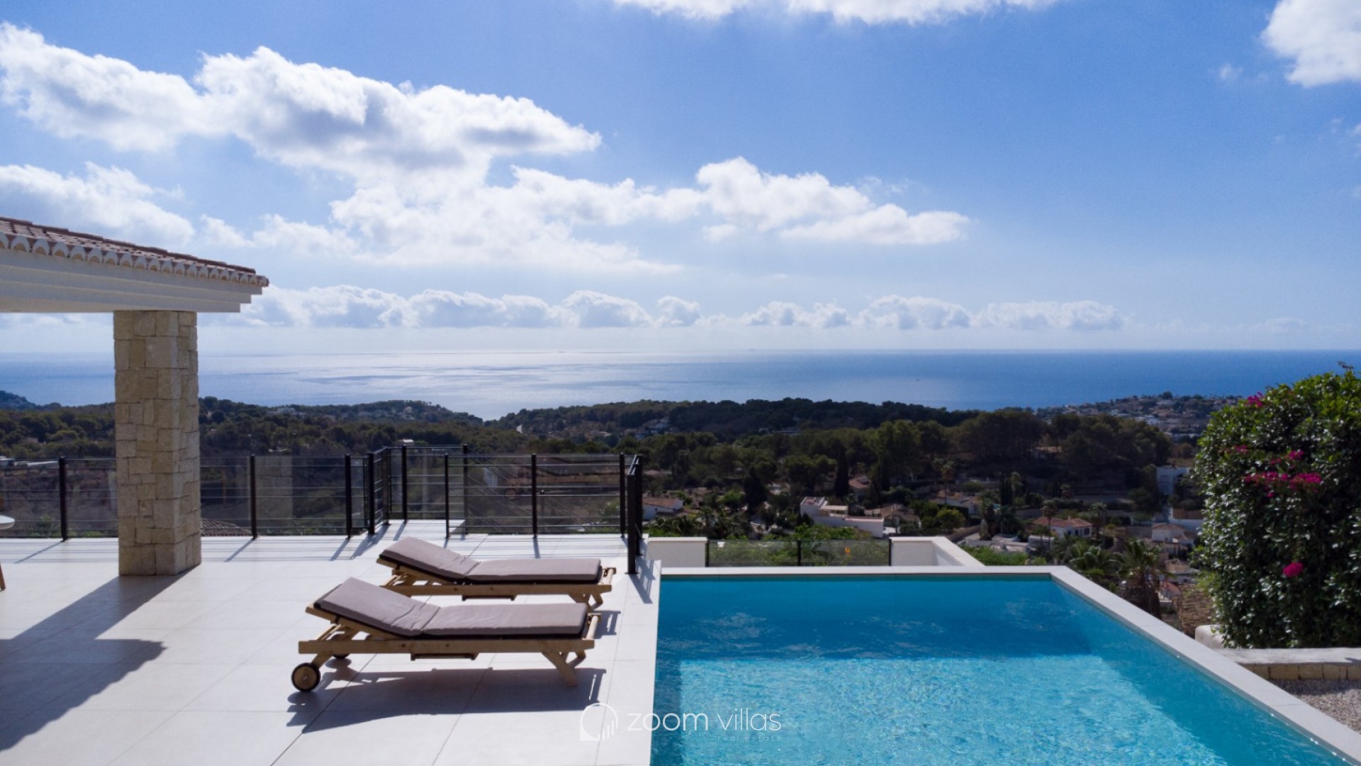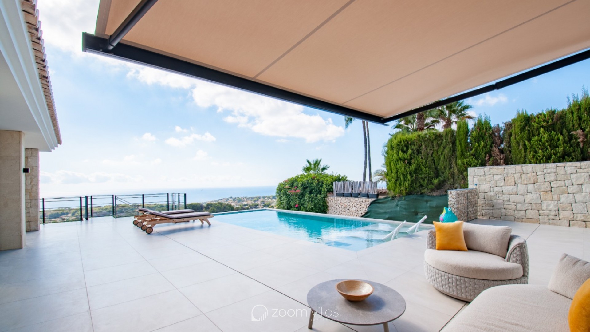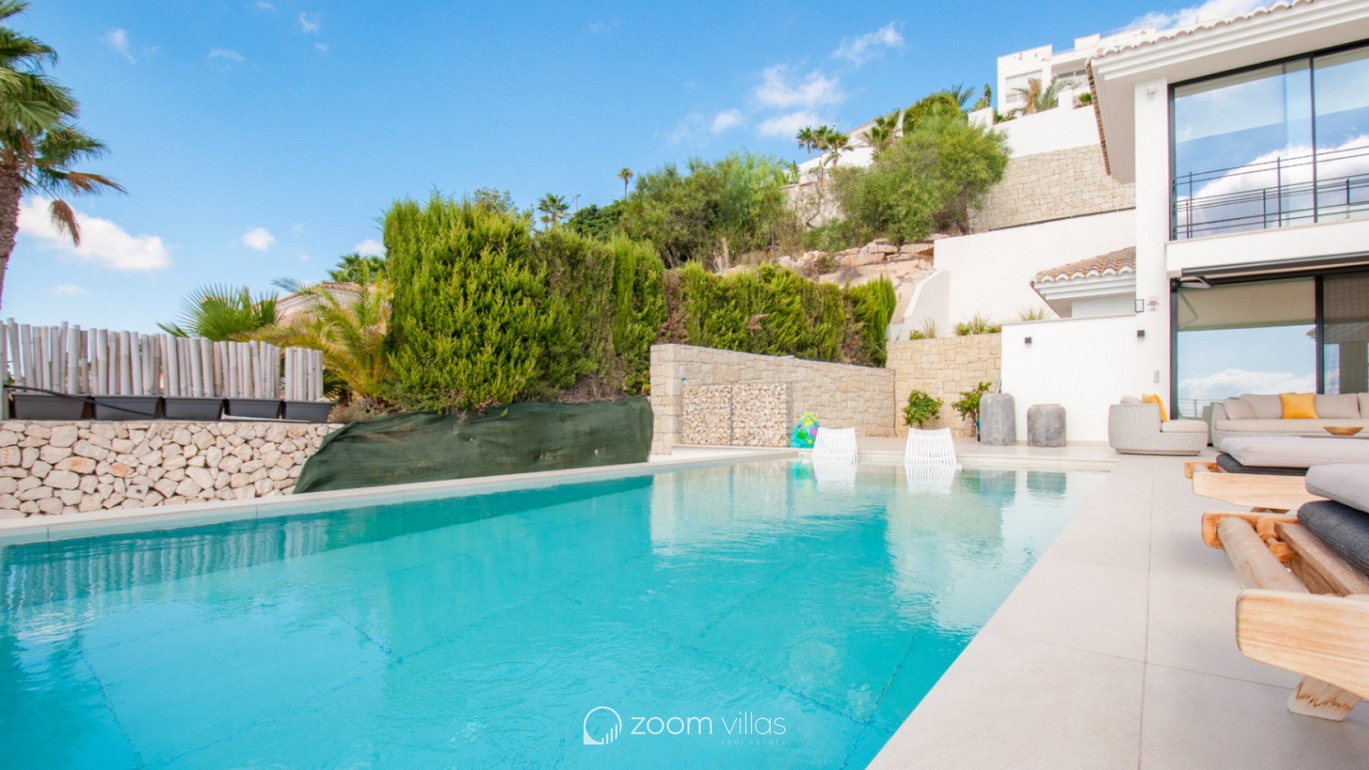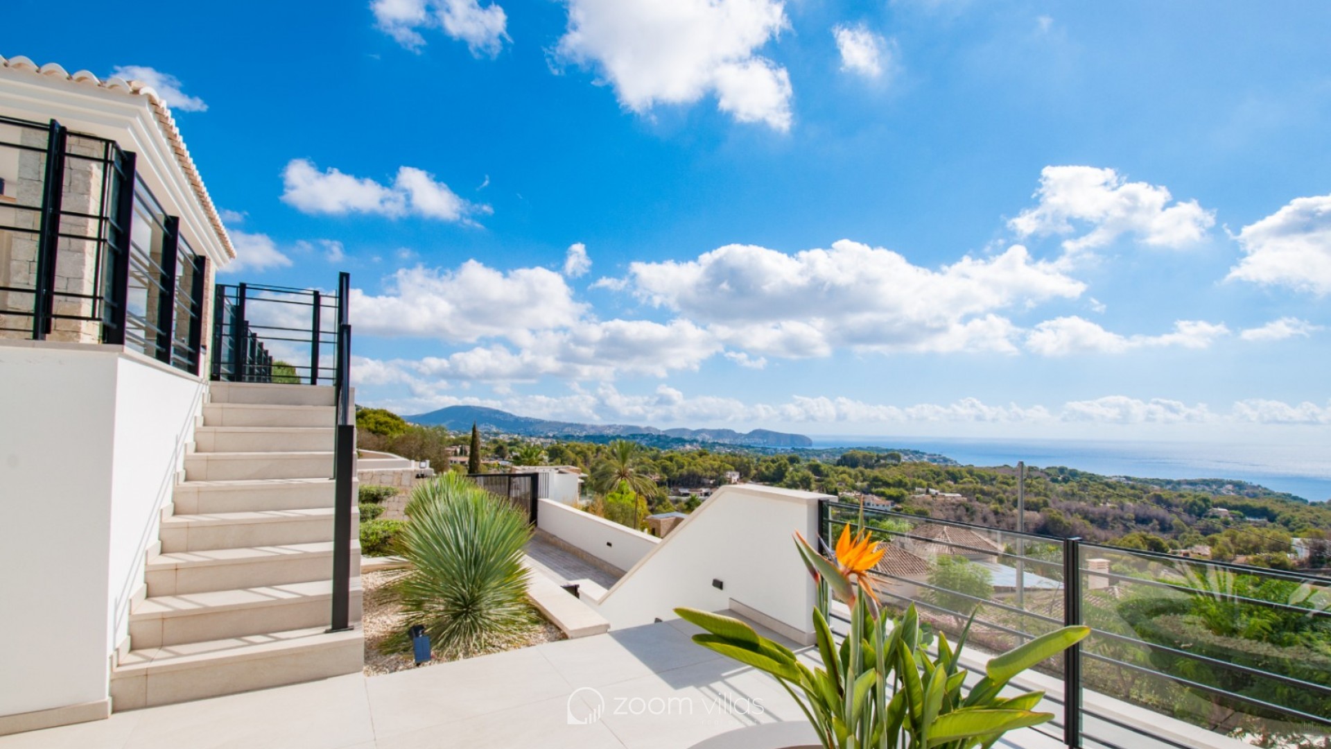 Luxusvilla zum Verkauf in Benissa mit Panoramablick auf das Meer. Sie verfügt über 3 Schlafzimmer, 2 Badezimmer, einen 9x4 m großen Pool, eine 145 m² große Terrasse, eine Außenküche und eine 60 m² große Garage. Sie beinhaltet Fußbodenheizung, zentralisierte Klimaanlage, Solarpanelen und hochwertige Ausstattungen. Sie liegt nur 5 Minuten von Cala La Fustera entfernt.