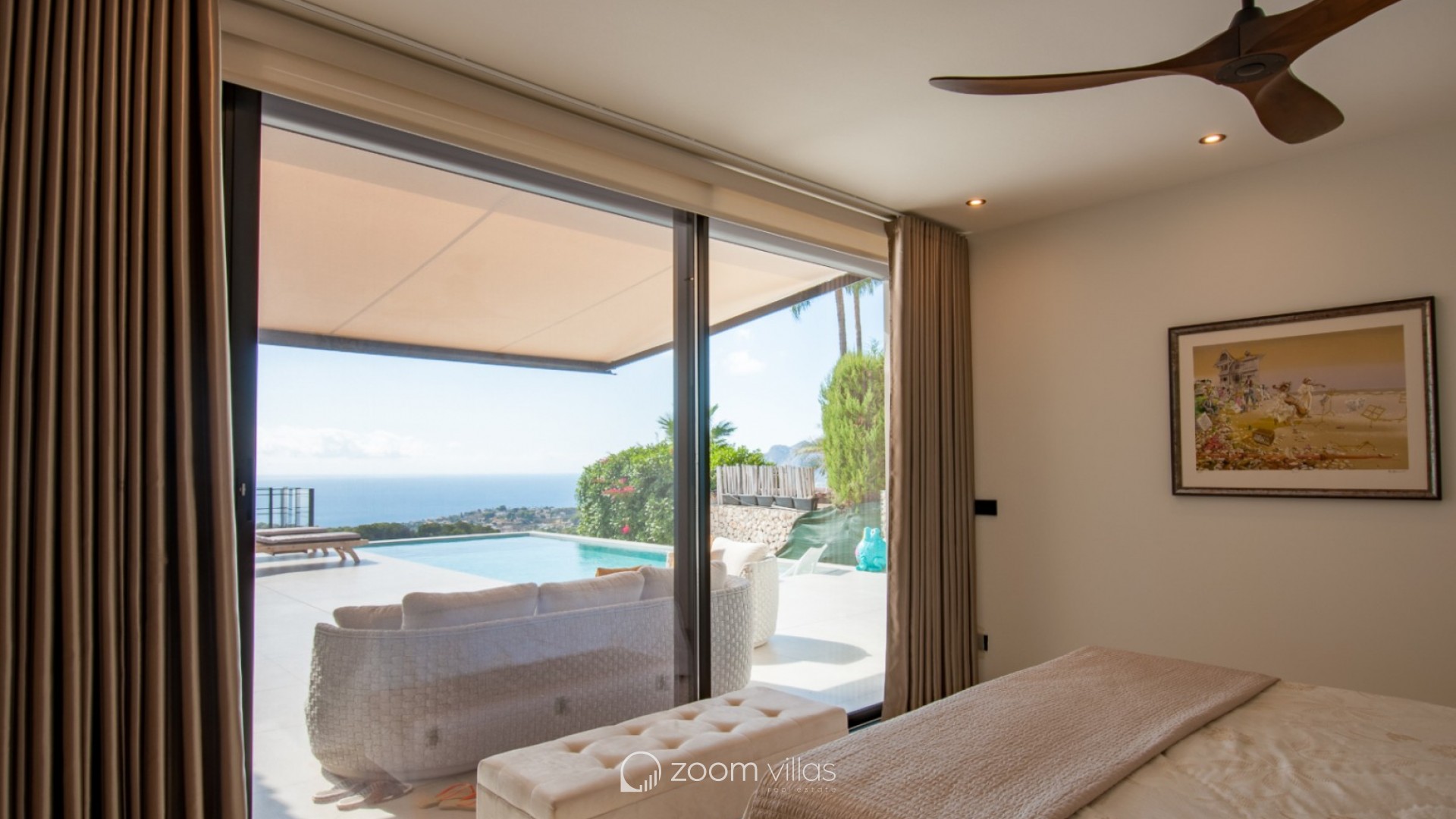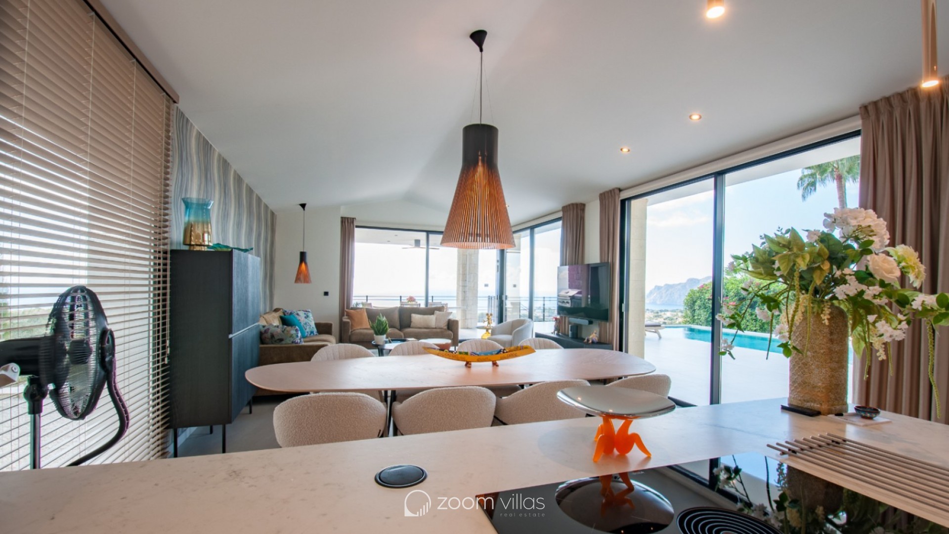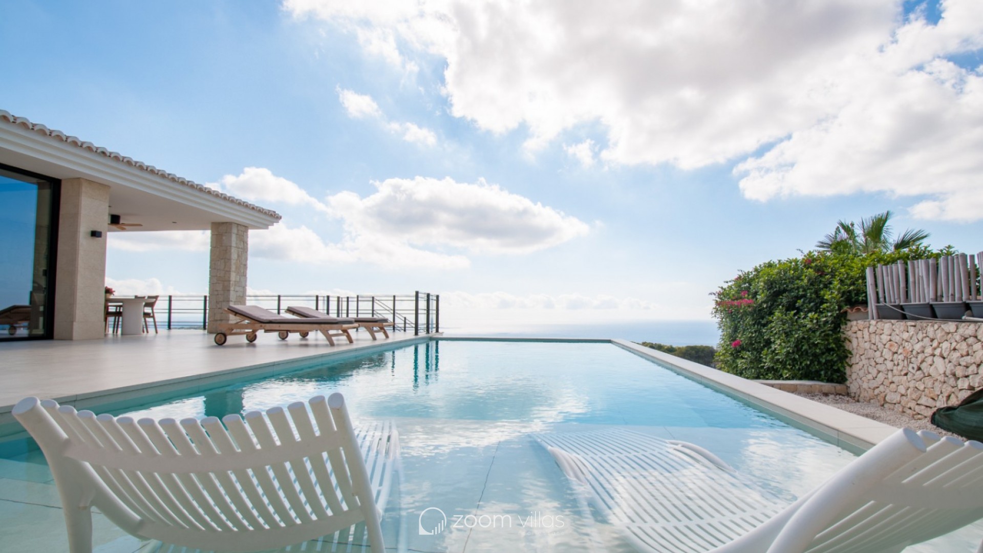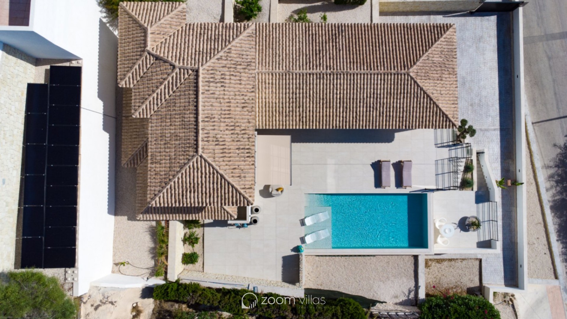 Luxusvilla zum Verkauf in Benissa mit Panoramablick auf das Meer. Sie verfügt über 3 Schlafzimmer, 2 Badezimmer, einen 9x4 m großen Pool, eine 145 m² große Terrasse, eine Außenküche und eine 60 m² große Garage. Sie beinhaltet Fußbodenheizung, zentralisierte Klimaanlage, Solarpanelen und hochwertige Ausstattungen. Sie liegt nur 5 Minuten von Cala La Fustera entfernt.