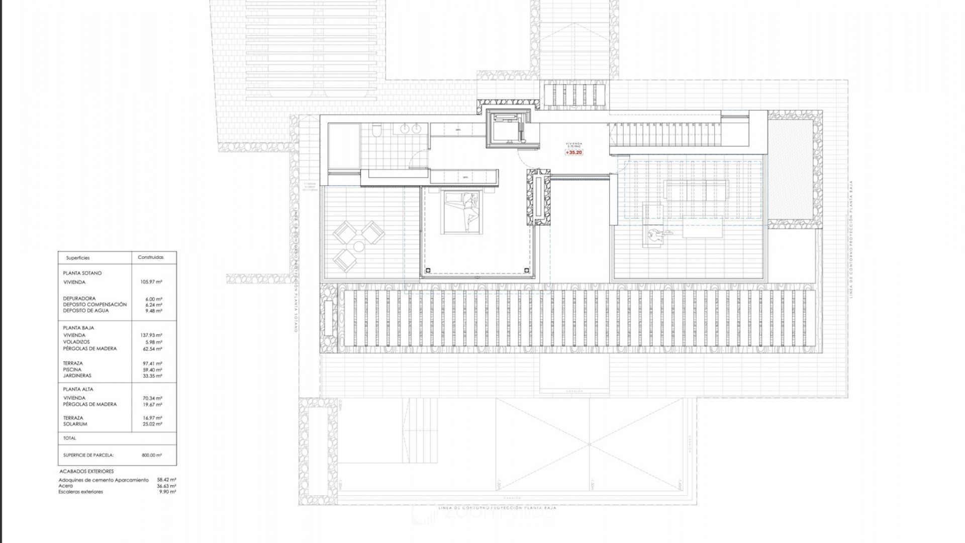 Das 105,97 m² große Untergeschoss wurde sowohl für den praktischen Gebrauch als auch zur Entspannung konzipiert. Auf dieser Etage befinden sich ein voll ausgestatteter Fitnessraum, eine Waschküche und Technikräume. Darüber hinaus besteht die Möglichkeit, zusätzliche Räume in einen Weinkeller, ein Kino oder einen multifunktionalen Raum umzuwandeln. Hier befinden sich auch das Filtersystem des Swimmingpools und die Wassertanks, die den effizienten Betrieb aller technischen Anlagen gewährleisten. Das Erdgeschoss mit einer Fläche von 137,93 m² ist als heller, offener Wohnraum konzipiert, der den mediterranen Lebensstil perfekt widerspiegelt.