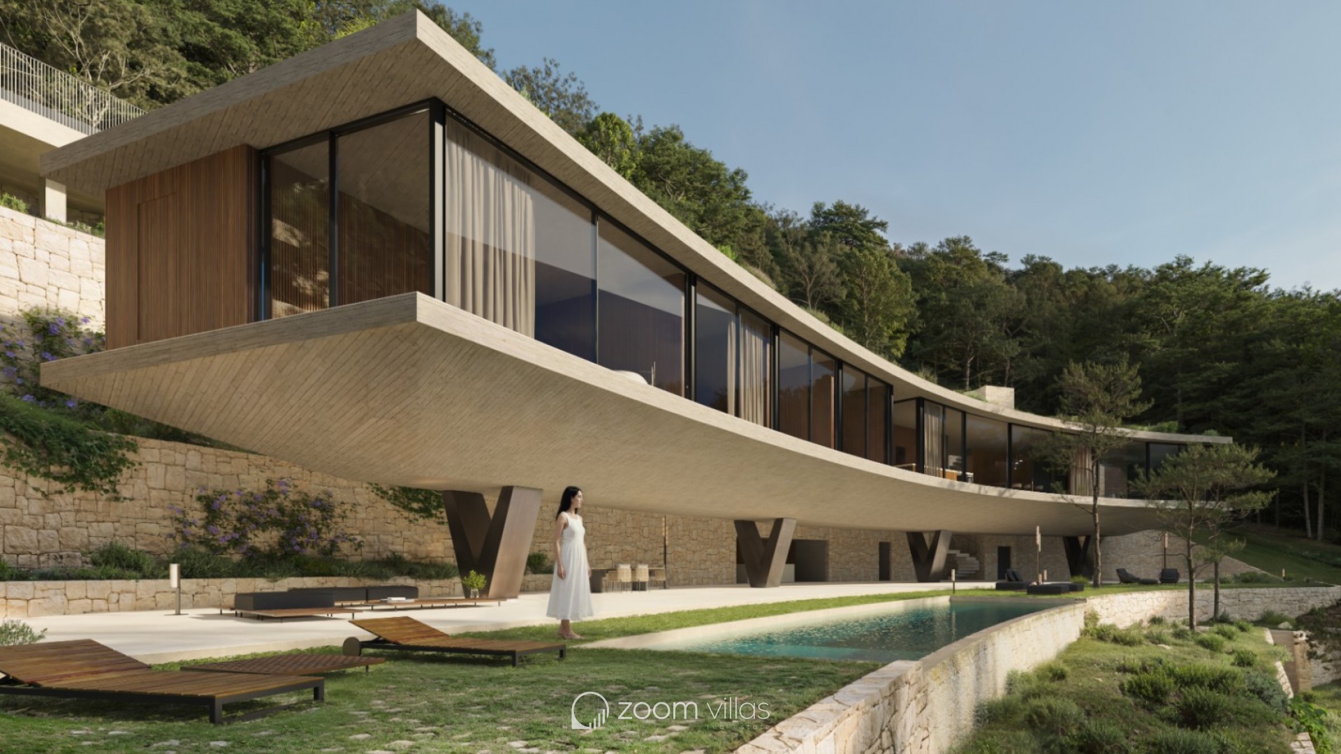 Destacamos no solo su estructura única sobre 5 conjuntos de pilares, sino también su diseño único y minimalista con materiales naturales como paredes de piedra natural y hormigón totalmente integrados en el paisaje. La amplitud y luminosidad tanto del espacioso salón-comedor como del dormitorio principal con terraza privada hacen que esta villa sea aún más especial.