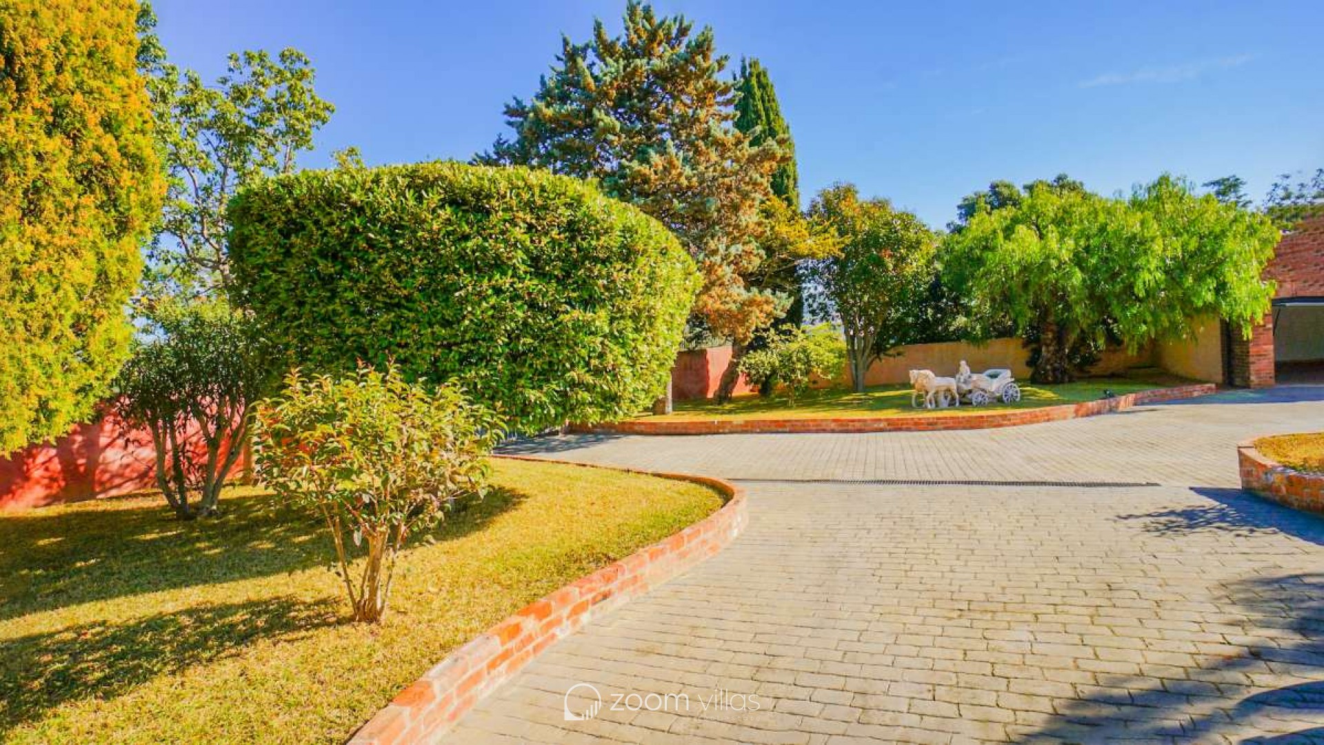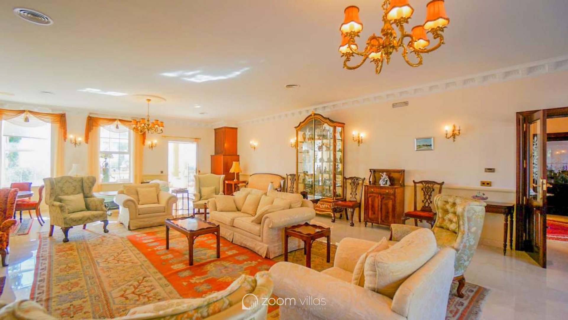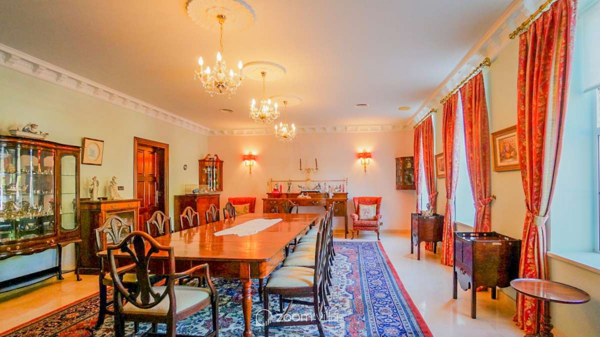 Con una majestuosa entrada sostenida por pilares, la casa cuenta con una amplia sala de estar que se ilumina mágicamente con una mezcla de exquisitas lámparas de araña y luz natural que entra por las numerosas ventanas y puertas. Una hermosa chimenea inyecta una sensación acogedora en el ambiente, lo que atenúa el ambiente. Un gran comedor que puede sentar a un gran número de personas también está presente. Piensa en una cena real sin la parte seria con pintorescas lámparas que añaden un aire de intimidad.