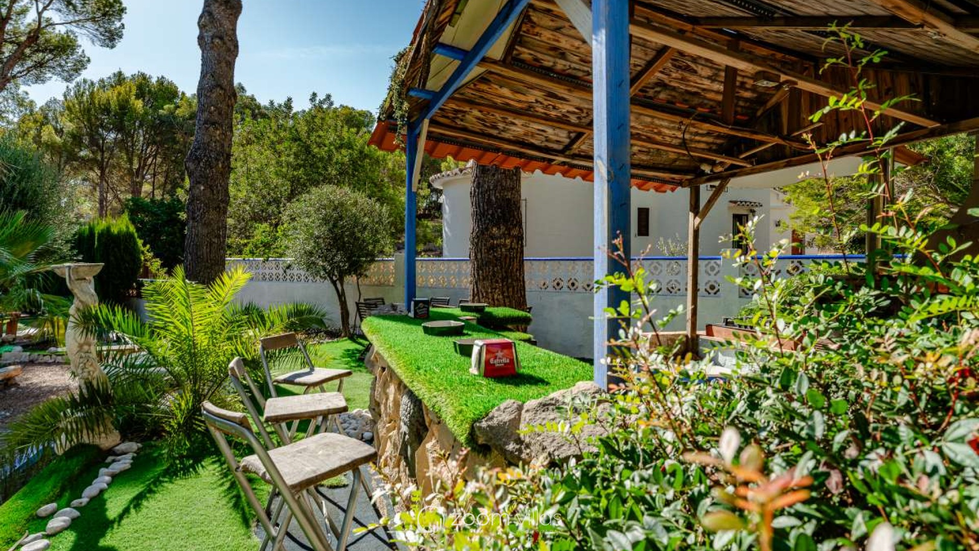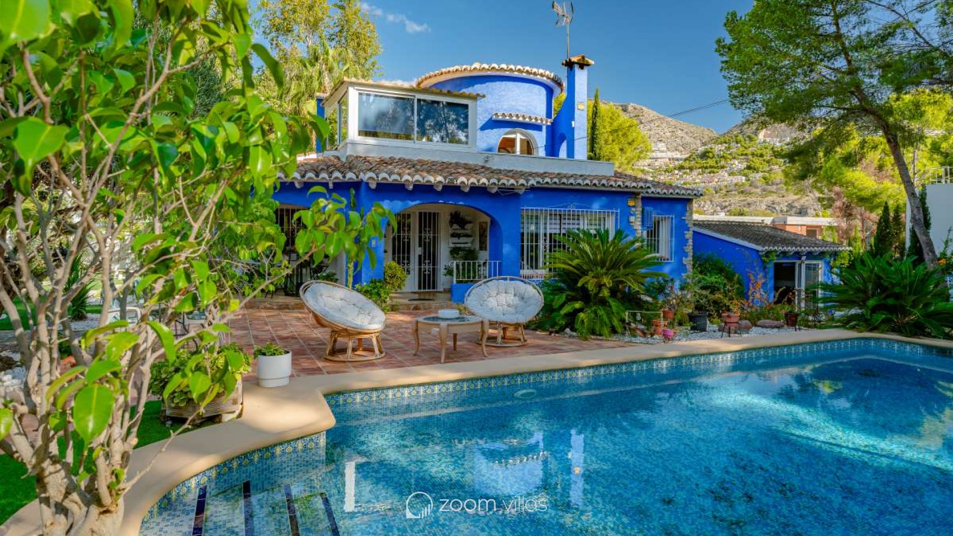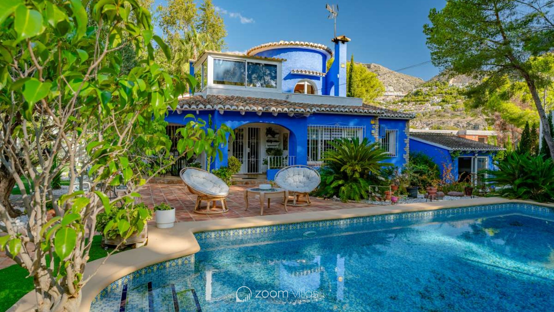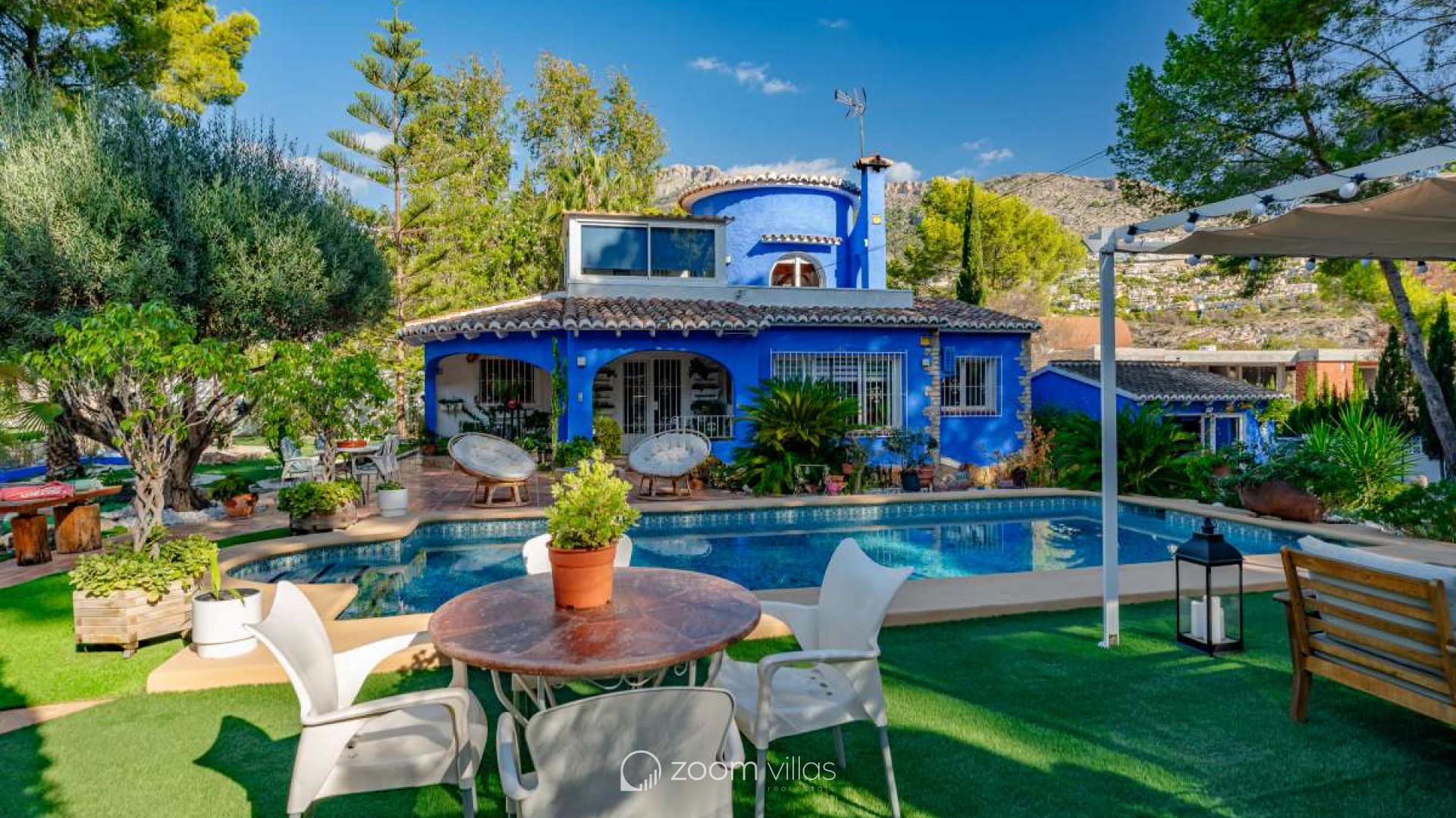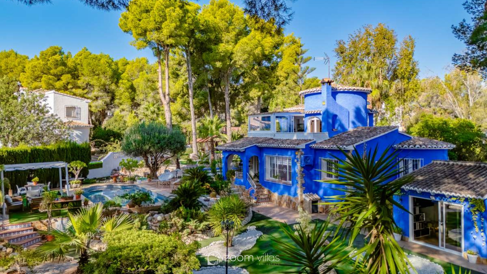 br>Ubicada en una generosa parcela de 1.377 m², esta elegante villa se encuentra rodeada de exuberantes jardines y un césped impecable. Construida en 1990, la casa destaca por sus suaves paredes exteriores de color azul cielo, un vibrante contraste con las tradicionales tejas de terracota y los detalles rústicos, que le confieren un carácter mediterráneo único.br>br> Ubicada en un entorno natural tranquilo, la villa se distribuye en dos plantas y combina comodidad con elegancia atemporal.br>br> Planta bajabr>br> La entrada da la bienvenida a una cocina abierta, perfectamente conectada con las salas de estar principales, creando un ambiente cálido y espacioso. Un práctico trastero ofrece espacio adicional para los artículos esenciales del día a día. En el corazón de la casa se encuentra el salón con una acogedora chimenea, ideal para veladas íntimas. Esta planta también ofrece dos amplios dormitorios y un baño completo, lo que garantiza funcionalidad y comodidad para la familia y los invitados.br>br> Piso superiorbr> El segundo nivel está dedicado a la lujosa suite principal, con baño en suite para una privacidad total. Un amplio armario ofrece amplio espacio de almacenamiento, mientras que la terraza privada invita a disfrutar de vistas panorámicas a la vegetación circundante. Una sala multiusos adicional sirve como oficina en casa o estudio creativo, con vistas tranquilas al jardín.br> Vida al aire librebr>br> El exterior de la propiedad está diseñado para la relajación y el entretenimiento. Una casa de huéspedes ofrece alojamiento confortable para los visitantes. Los jardines enmarcan una piscina privada de agua salada. Un amplio patio permite cenar al aire libre y disfrutar de reuniones sociales bajo el cielo mediterráneo. El aparcamiento para varios vehículos aumenta la comodidad de la villa.br>