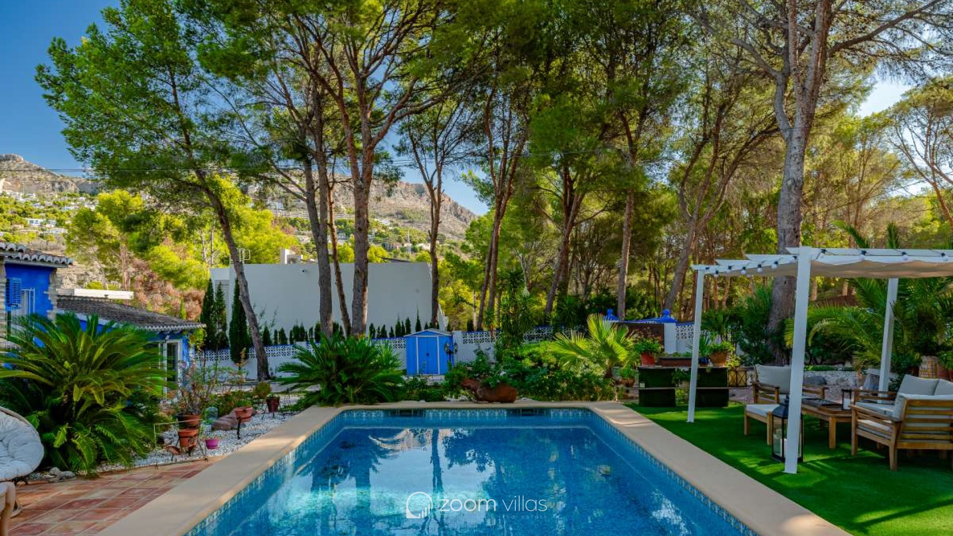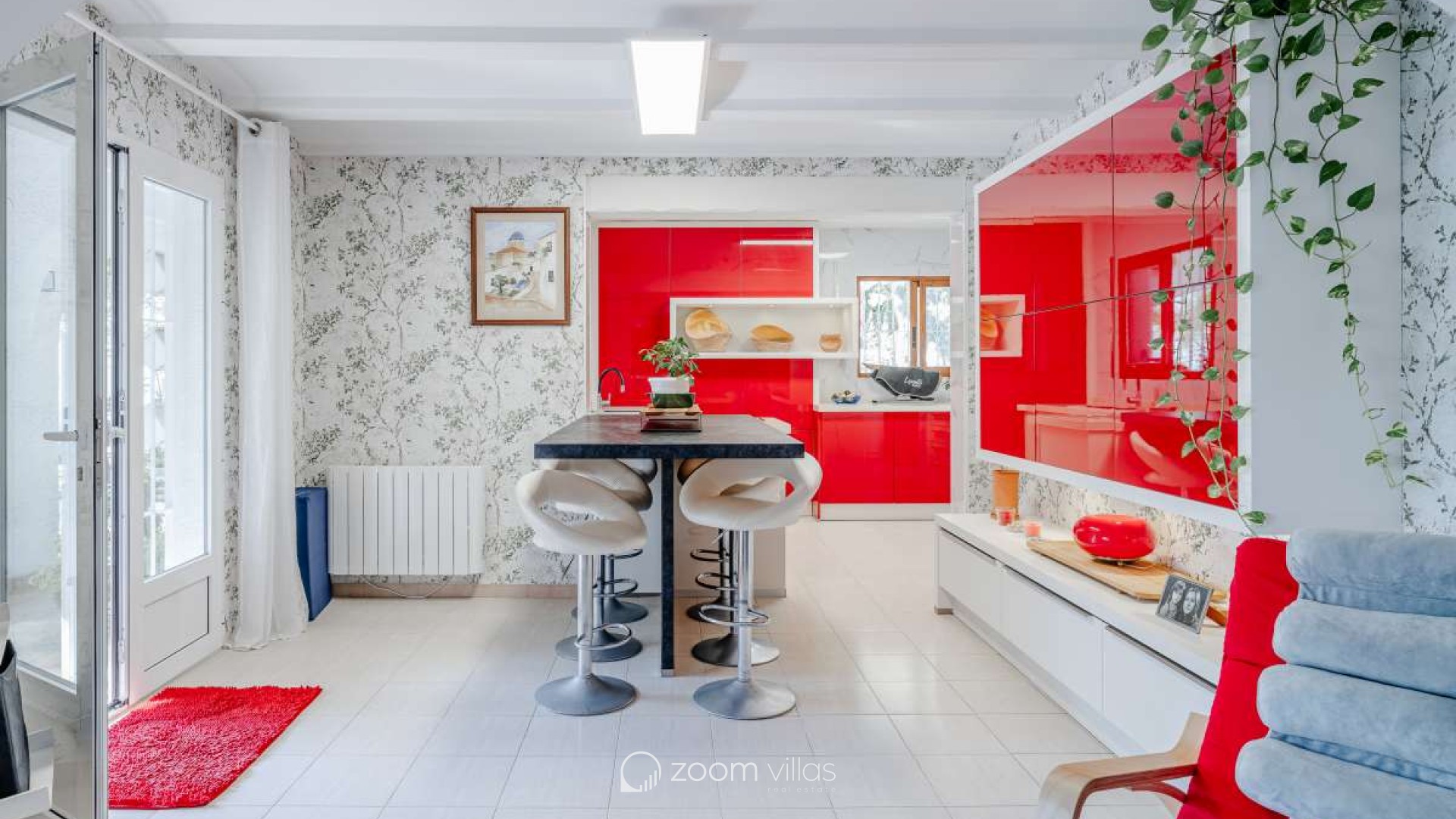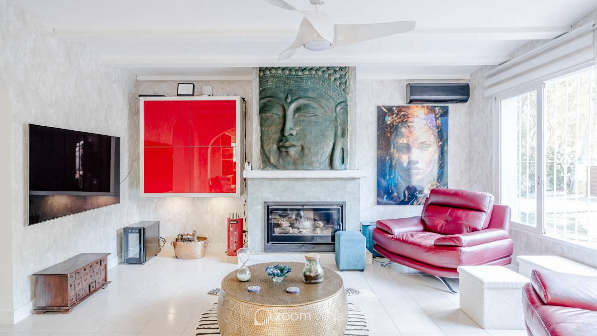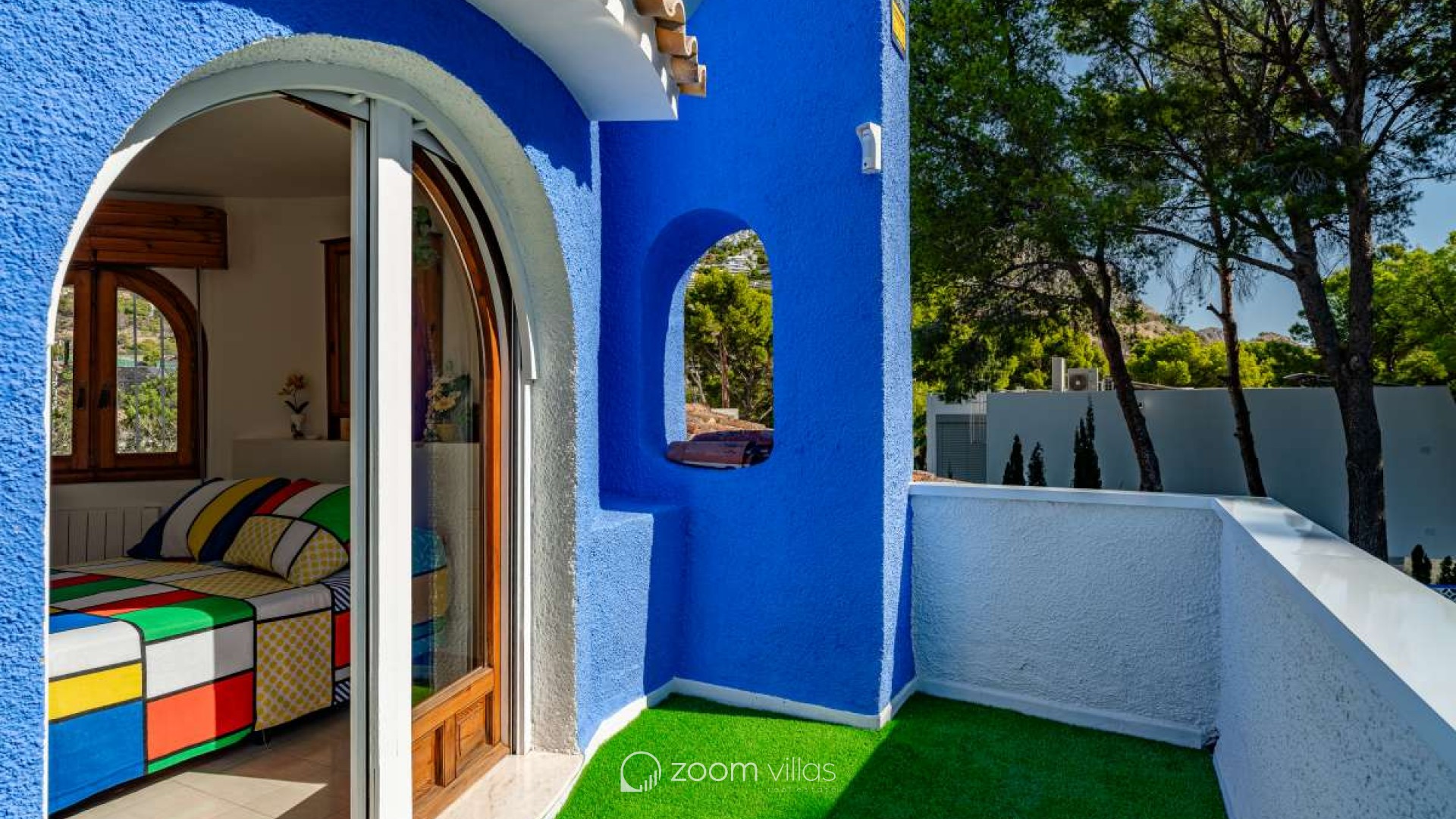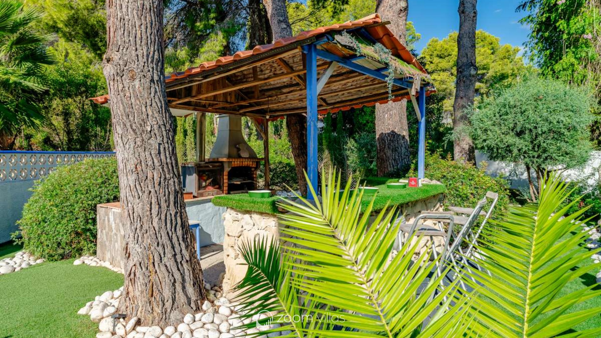 br>Ubicada en una generosa parcela de 1.377 m², esta elegante villa se encuentra rodeada de exuberantes jardines y un césped impecable. Construida en 1990, la casa destaca por sus suaves paredes exteriores de color azul cielo, un vibrante contraste con las tradicionales tejas de terracota y los detalles rústicos, que le confieren un carácter mediterráneo único.br>br> Ubicada en un entorno natural tranquilo, la villa se distribuye en dos plantas y combina comodidad con elegancia atemporal.br>br> Planta bajabr>br> La entrada da la bienvenida a una cocina abierta, perfectamente conectada con las salas de estar principales, creando un ambiente cálido y espacioso. Un práctico trastero ofrece espacio adicional para los artículos esenciales del día a día. En el corazón de la casa se encuentra el salón con una acogedora chimenea, ideal para veladas íntimas. Esta planta también ofrece dos amplios dormitorios y un baño completo, lo que garantiza funcionalidad y comodidad para la familia y los invitados.br>br> Piso superiorbr> El segundo nivel está dedicado a la lujosa suite principal, con baño en suite para una privacidad total. Un amplio armario ofrece amplio espacio de almacenamiento, mientras que la terraza privada invita a disfrutar de vistas panorámicas a la vegetación circundante. Una sala multiusos adicional sirve como oficina en casa o estudio creativo, con vistas tranquilas al jardín.br> Vida al aire librebr>br> El exterior de la propiedad está diseñado para la relajación y el entretenimiento. Una casa de huéspedes ofrece alojamiento confortable para los visitantes. Los jardines enmarcan una piscina privada de agua salada. Un amplio patio permite cenar al aire libre y disfrutar de reuniones sociales bajo el cielo mediterráneo. El aparcamiento para varios vehículos aumenta la comodidad de la villa.br>