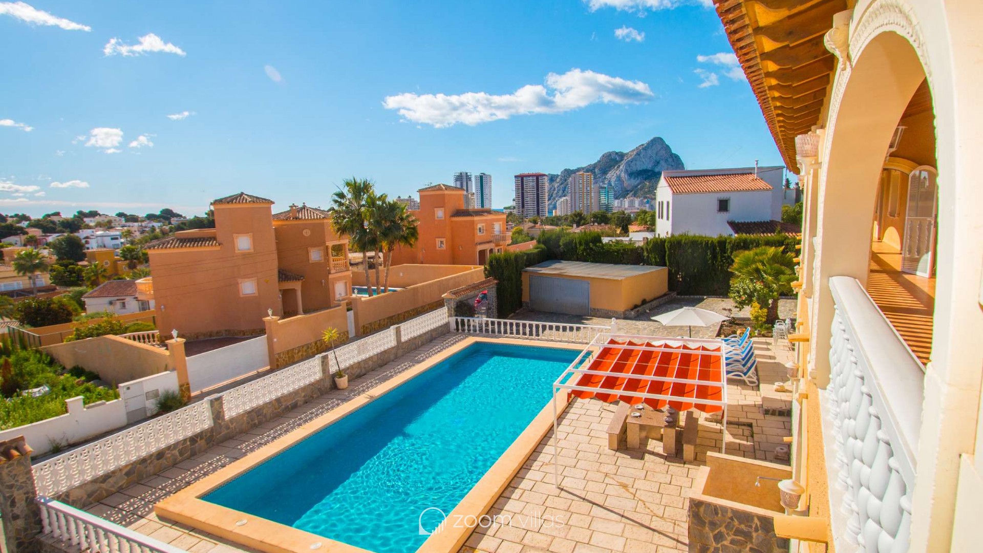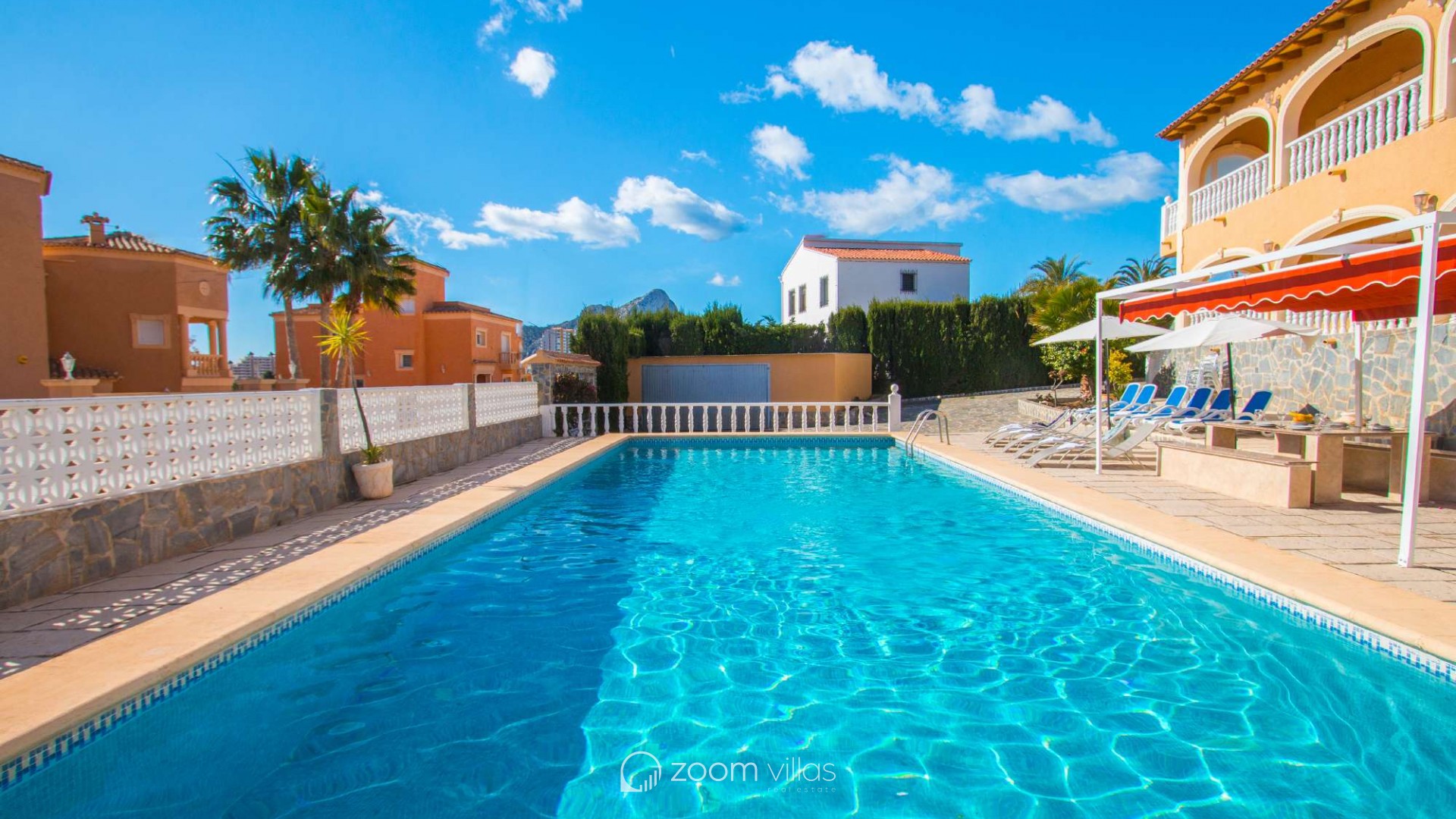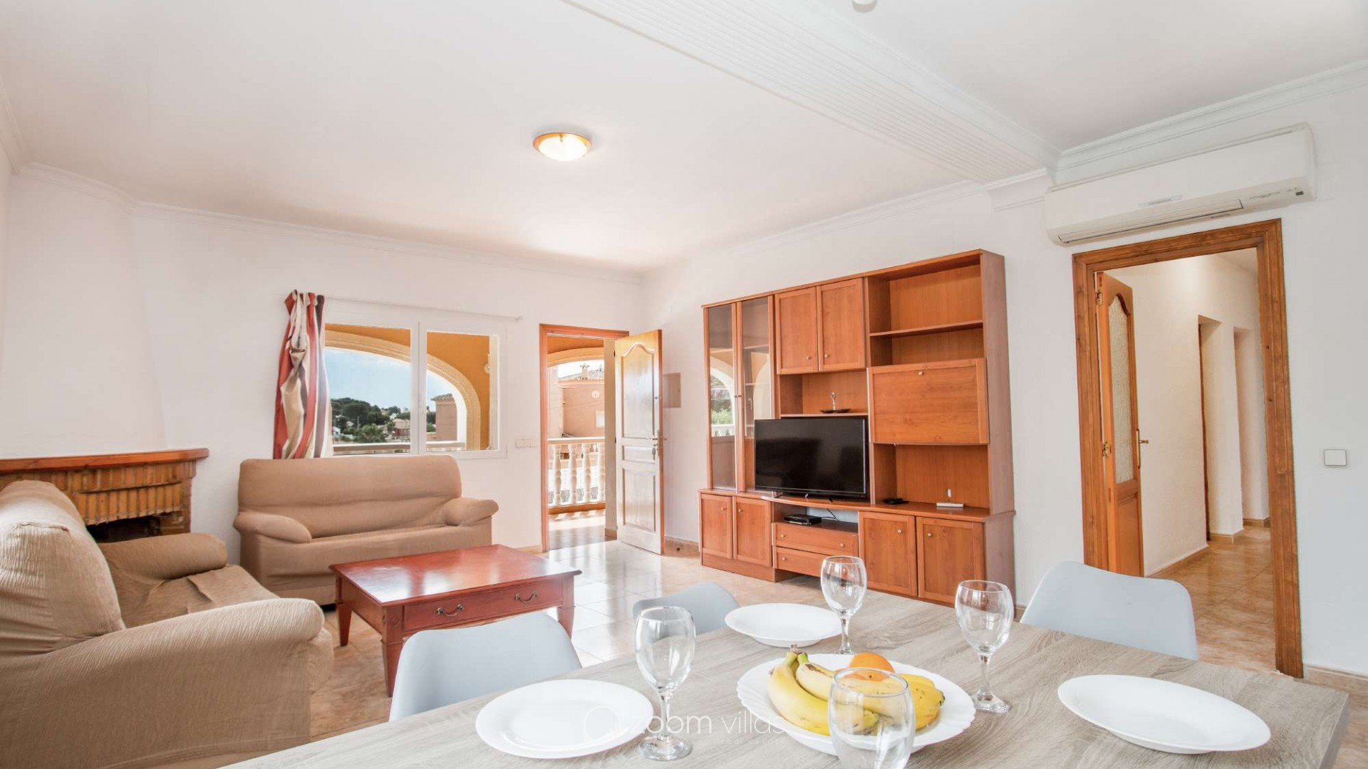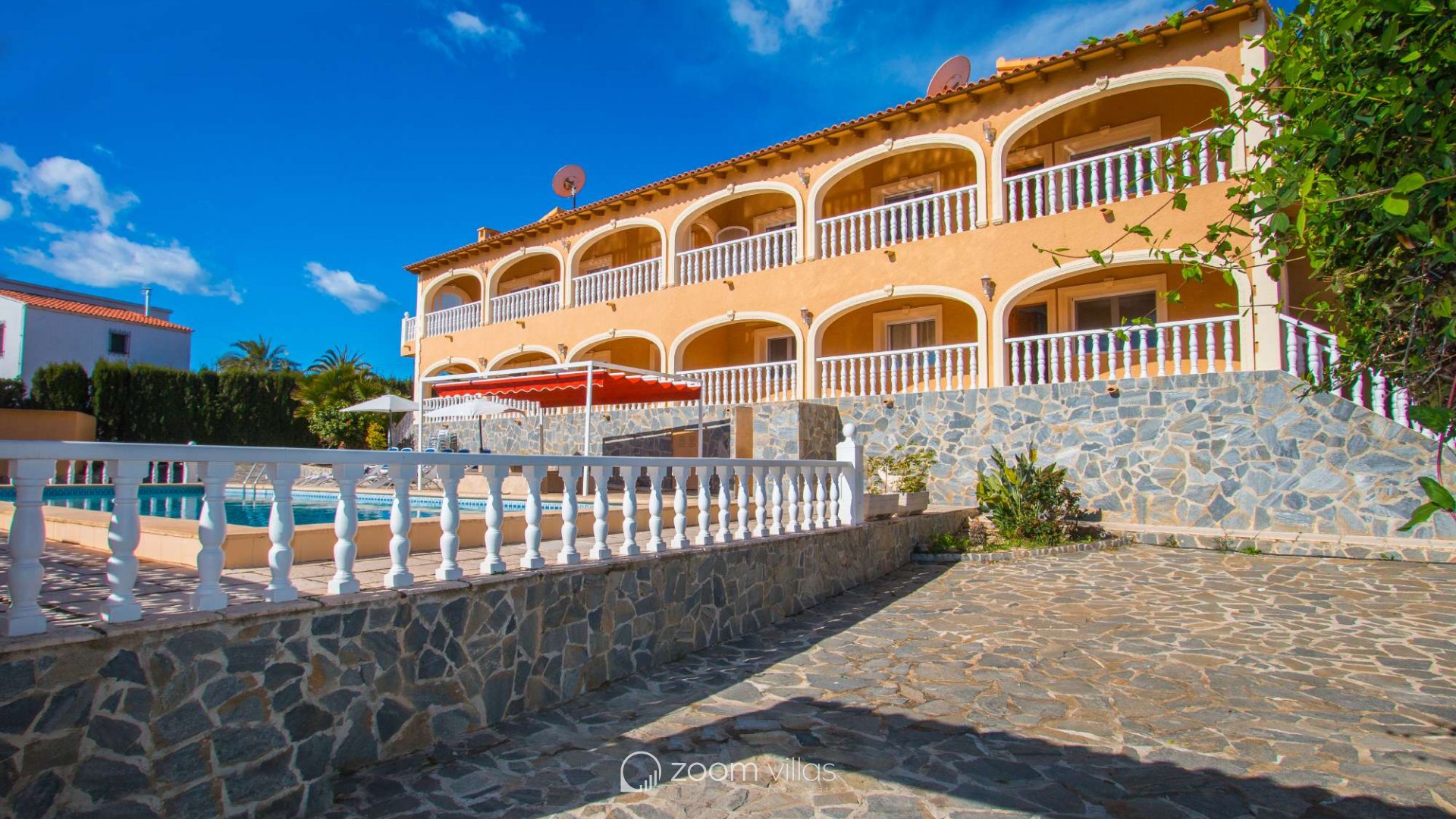 Villa con piscina privada en Calpe (Costa Blanca). La villa se encuentra ubicada en la urbanización residencial Costeres, zona privilegiada por su cercanía a la playa. Esta amplia villa, está formada por cuatro apartamentos independientes. Cada apartamento posee 120 m2 distribuidos en salón-comedor, cocina y tres dormitorios (en total doce dormitorios). INTERIOR: Planta baja: La planta baja está compuesta por dos apartamentos con entrada independiente en cada uno de ellos. Apartamento 1: (acceso por escalones desde zona de parking) Salón-comedor con mobiliario confortable, TV TDT/Sat, aire acondicionado y salida a terraza cubierta. Cocina independiente totalmente equipada. Tres dormitorios con aire acondicionado, uno de ellos con una cama de matrimonio y los otros dos con dos camas individuales. un baño con bañera, lavabo y wc. un aseo con lavabo y wc. Apartamento 2: Salón-comedor con mobiliario confortable, TV TDT/Sat, aire acondicionado y salida a terraza cubierta. Cocina independiente totalmente equipada. Tres dormitorios con aire acondicionado, los tres con dos camas individuales. Un baño con bañera, lavabo y wc. Y un aseo con lavabo y wc. Apartamento 3: (acceso por escalones desde zona de parking) Salón-comedor con mobiliario confortable, TV TDT/Sat, aire acondicionado y salida a terraza cubierta. Cocina independiente totalmente equipada. Tres dormitorios con aire acondicionado, uno de ellos con una cama de matrimonio y los otros dos con dos camas individuales. un baño con bañera, lavabo y wc. un aseo con lavabo y wc. Primera Planta: (Acceso por escaleras exteriores) La planta alta está compuesta por dos apartamentos con entrada independiente en cada uno de ellos. Apartamento 4: Salón-comedor con mobiliario confortable, TV TDT/Sat, aire acondicionado y salida a terraza cubierta. Cocina independiente totalmente equipada. Tres dormitorios con aire acondicionado, los tres con dos camas individuales. Un baño con bañera, lavabo y wc. Y un baño con ducha, lavabo y wc. EXTERIOR: La villa posee una parcela cerrada de 1450 m2, en la que se encuentra una extensa piscina con una zona de terraza llana. Ducha exterior. La villa dispone de una barbacoa de obra para realizar comidas. Parking dentro de la misma parcela para cinco-seis vehículos. UBICACIÓN: Ubicada a 1,8 km aproximadamente de la playa, paseo marítimo y todos los servicios. Calpe pueblo se encuentra a 3,5 km aproximadamente.