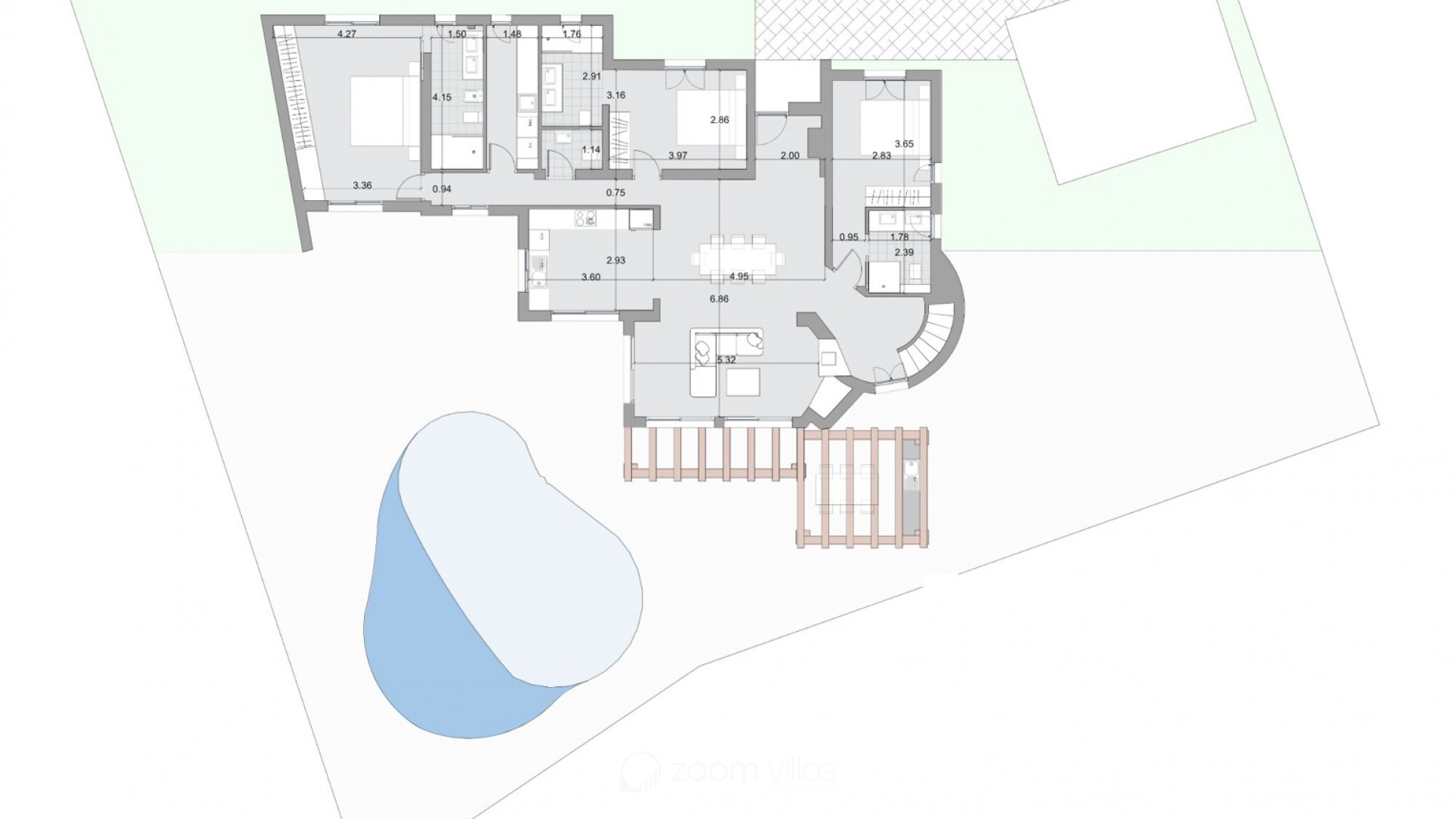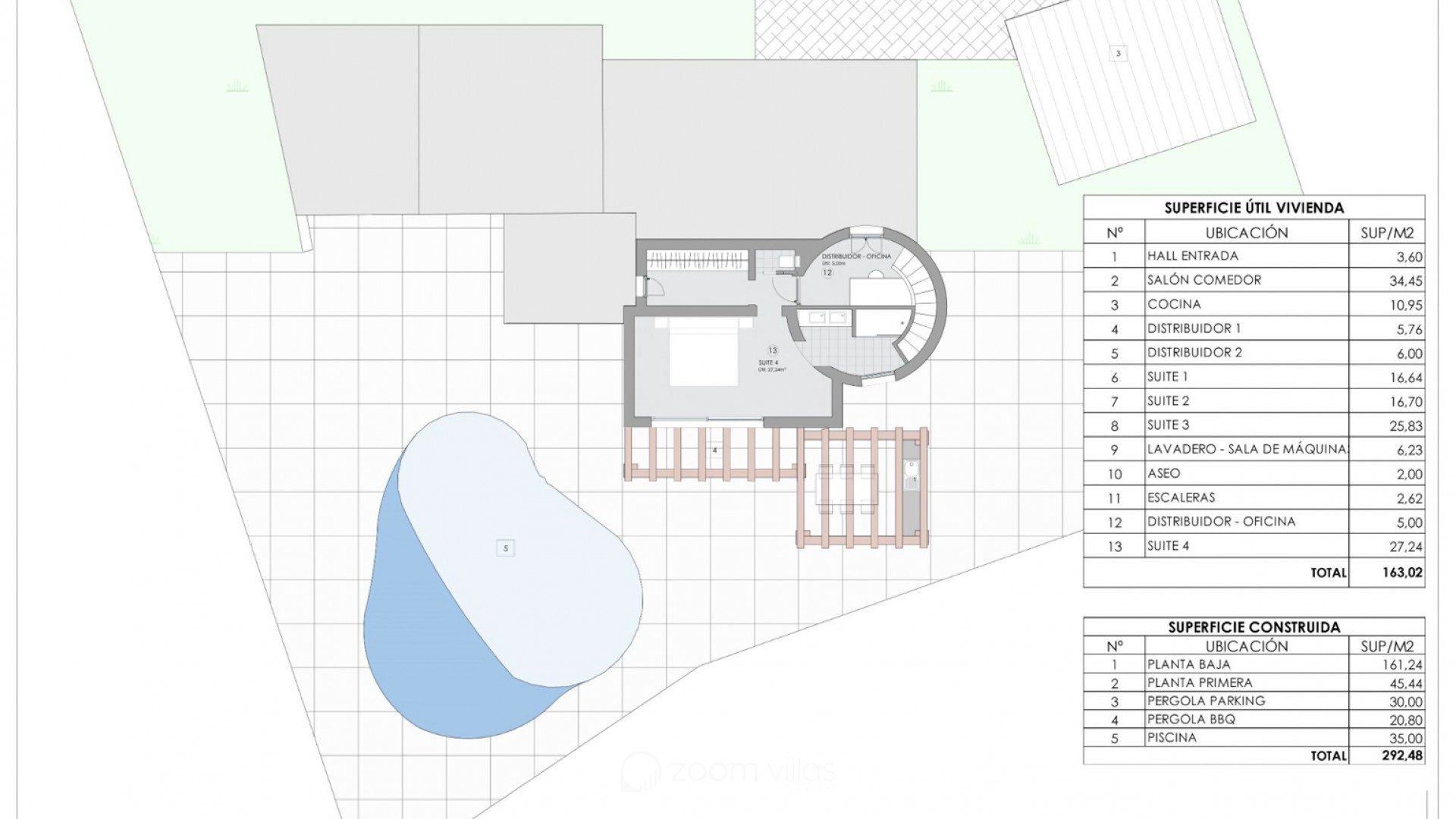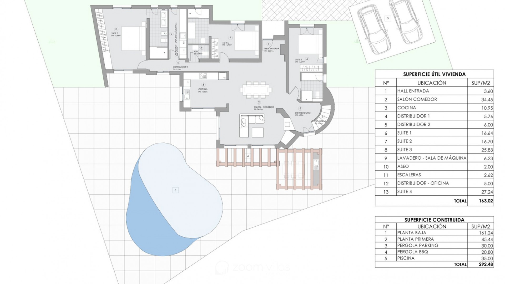 La villa contará con cuatro dormitorios, todos con baño en suite, así como un aseo de invitados. La distribución ha sido cuidadosamente diseñada para proporcionar tanto privacidad como amplitud, con zonas de estar diáfanas que conectan a la perfección con el exterior.