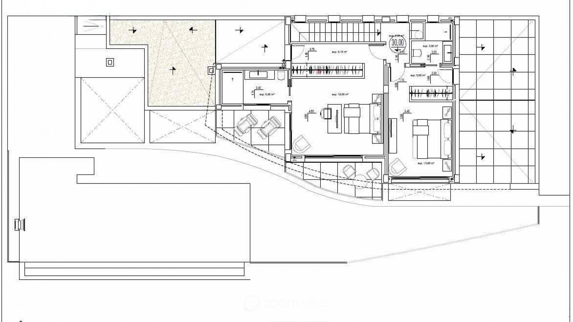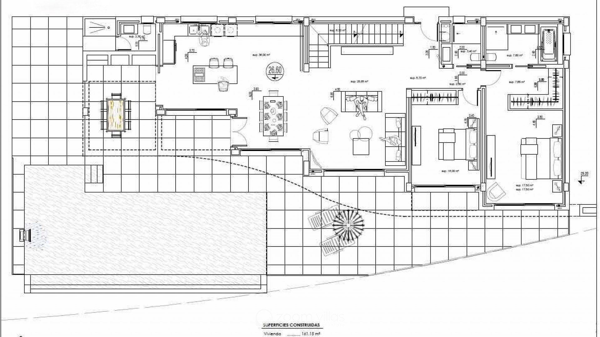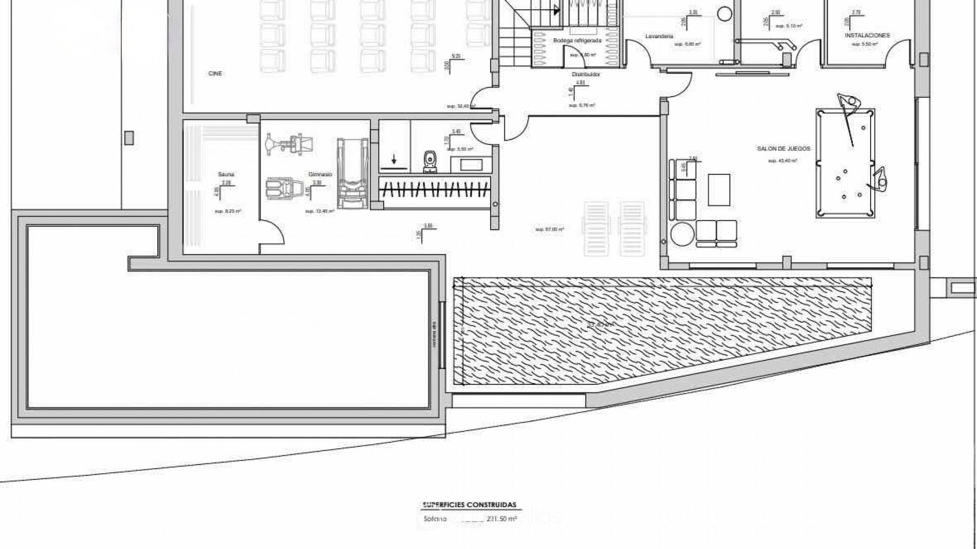 Au rez-de-chaussée, d'une superficie de plus de 200 m2, vous trouverez une piscine intérieure chauffée, un sauna, une salle de cinéma, une salle de jeux et une buanderie. Vous y trouverez également des toilettes séparées. Au rez-de-chaussée se trouvent le salon, la cuisine et la spacieuse piscine à débordement. Elle offre une vue magnifique sur la mer et sur Moraira tout au long de la journée. Un magnifique jardin avec des plantes tropicales sera également aménagé autour de cette villa exclusive ! À l'extérieur, il y aura également un porche et une cuisine extérieure. Les deux premières chambres à coucher, les deux salles de bains et les toilettes séparées se trouvent au même étage.