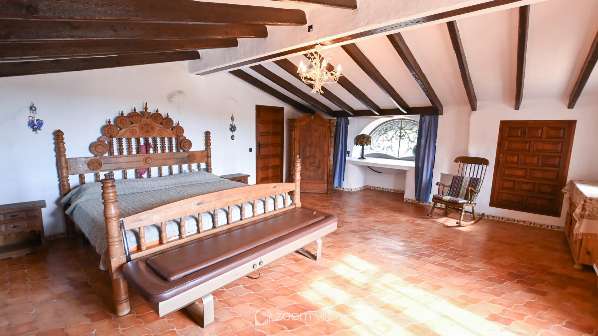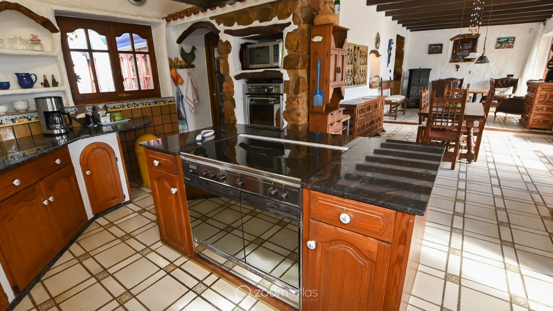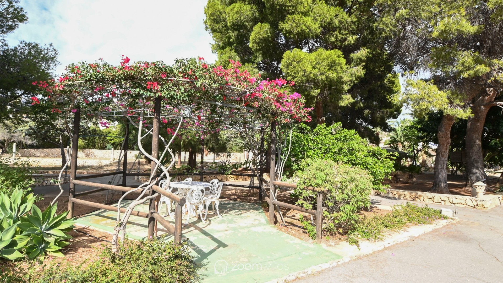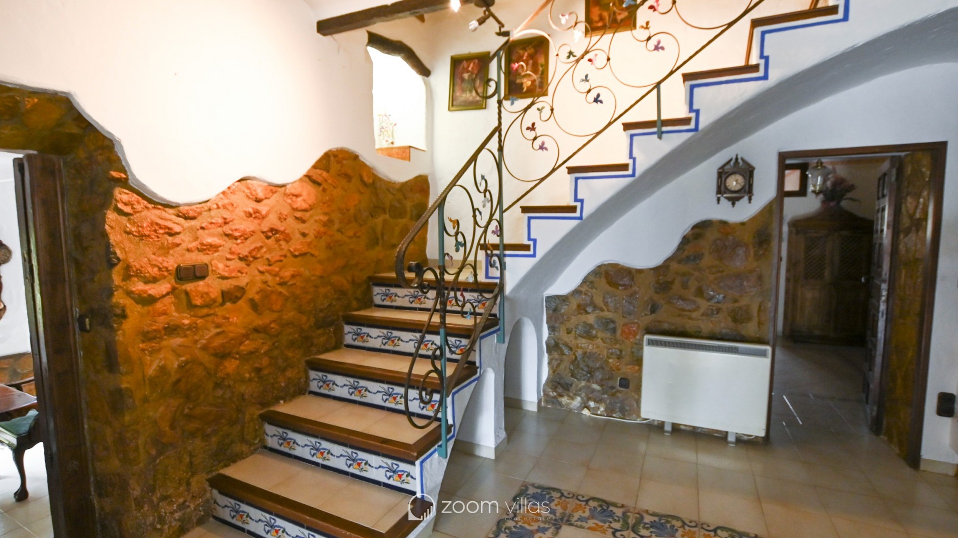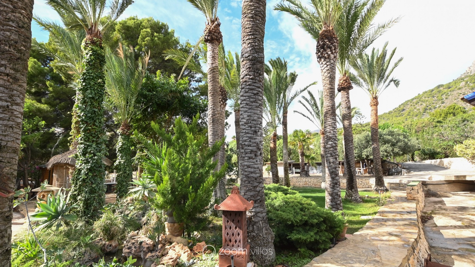 Magnifique et unique finca de plus de 200 ans, rénovée au début des années 90. Elle a une surface habitable de 400m2 sur un terrain rustique de 11.000m2. La propriété a deux étages, reliés par un escalier intérieur. A l´étage : Chambre principale de 36m2 avec air conditionné, TV, armoires encastrées et accès à une terrasse avec une belle vue sur la mer. De la chambre, on accède à la salle de bains attenante avec baignoire, douche, double lavabo, WC et bidet. La salle de bain se trouve juste sous le toit, elle a donc une partie basse, attention à la tête. Chambre double de 25m2 avec air conditionné, sortie sur le balcon et salle de bain attenante avec douche, bidet, lavabo et WC. En bas : 1 chambre double avec lits superposés pour enfants, air conditionné et sortie sur la terrasse extérieure avec vue sur la palmeraie. Salle de bain avec baignoire, bidet, lavabo et WC. 1 chambre double avec climatisation et salle de bain attenante avec douche, lavabo et WC. Salon de 49m2 avec cheminée et accès à un bureau. Salle de jeux. Salle à manger principale de 20m2. Cuisine ouverte avec four, plaque de cuisson au gaz, lave-vaisselle, micro-ondes et coin repas avec vue sur la piscine et la mer. Coin salon à côté de la salle à manger. Buanderie (derrière la maison) avec réfrigérateur et machine à laver. Toilettes. La finca est meublée dans un style rustique avec des meubles et une décoration provenant d´Amérique latine, en particulier de Bolivie, du Chili et du Mexique. Extérieur : Piscine (non clôturée) avec île au milieu, 17m x 9m de large (forme irrégulière), avec des marches romaines, belles vues sur la mer et le Peñon d´Ifach. A côté de la piscine il y a une pelouse avec des palmiers et des vues dégagées. La piscine est entourée d´une grande terrasse avec des meubles d´extérieur, un barbecue intégré, un parasol et une salle à manger intégrée. Zone de palmiers avec cascade, pelouse et grande table ronde pour 8-10 personnes. Parc avec route asphaltée, pins, bougainvilliers, aires de repos et vues dégagées sur la mer. Le jardin est un paradis et entoure la villa. Vous pouvez vous promener entre les sentiers du parc et autour de la propriété. Terrain de pétanque. Douche extérieure juste à côté de la piscine. Murs en pierre naturelle. Parking pour plusieurs voitures (1 couvert). La maison est équipée d´une alarme, de l´éclairage de la piscine, de moustiquaires aux fenêtres des chambres et d´un coffre-fort. A l´extérieur, il y a plusieurs pièces de rangement et un garage. Située à 1,2km de Puerto Blanco, 2,5km du centre de Calpe et 3km de la plage de sable. Supermarché à 2,5km, pharmacie à 2km et restaurant le plus proche à 1km. Aéroport d´Alicante à 70 km et aéroport de Valence à 120 km.