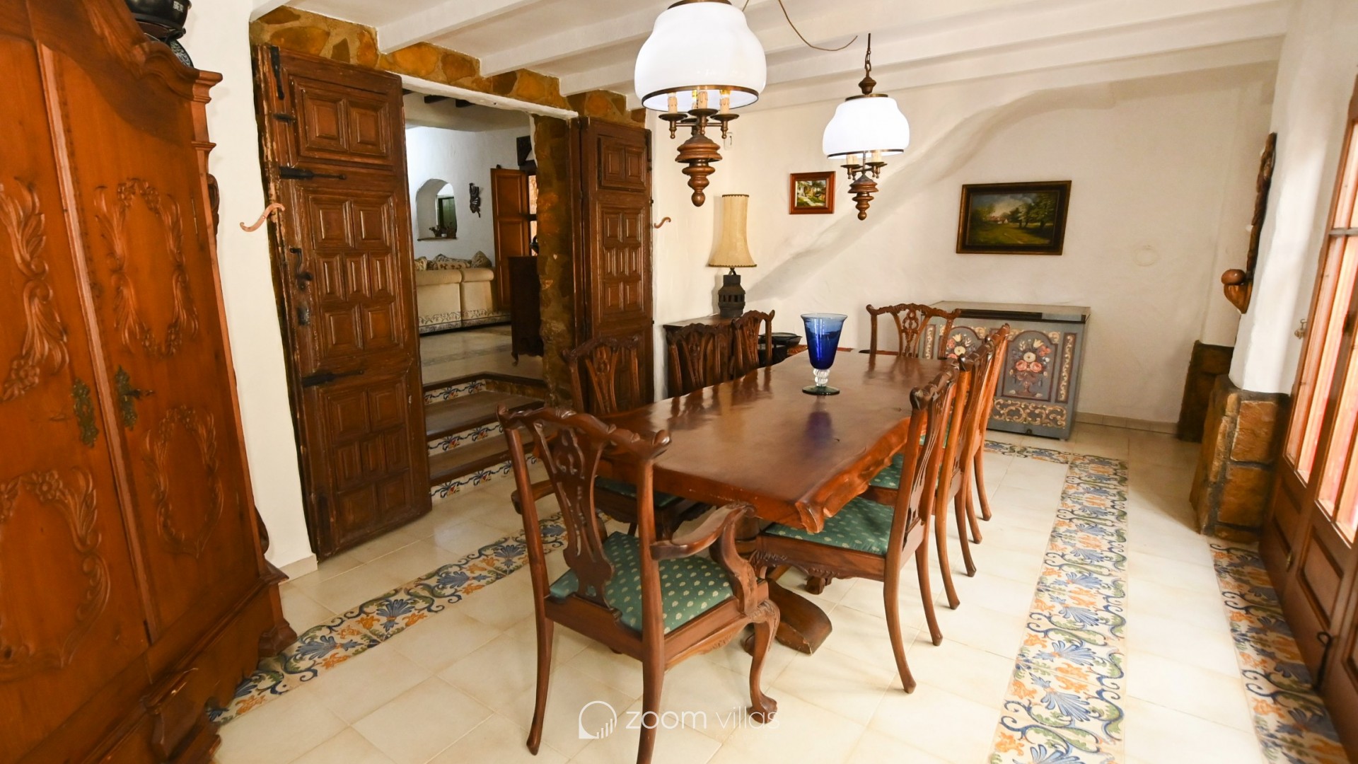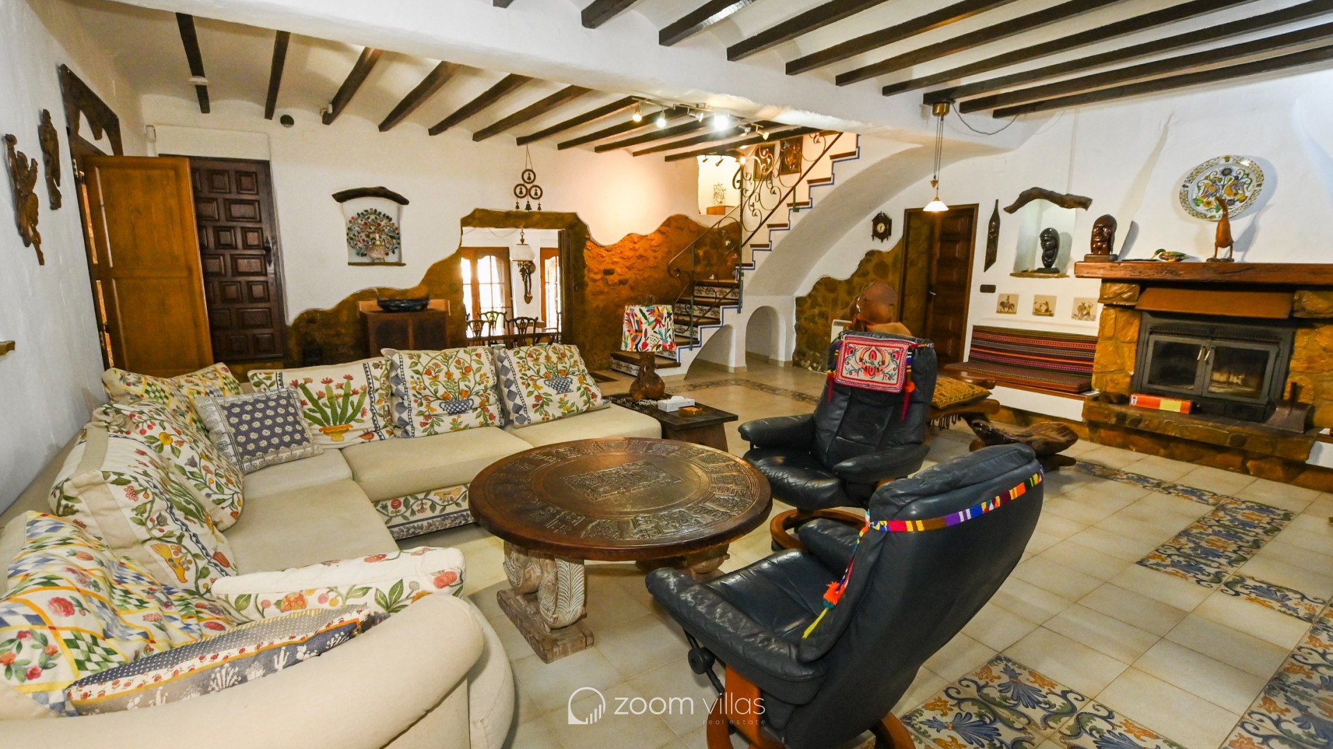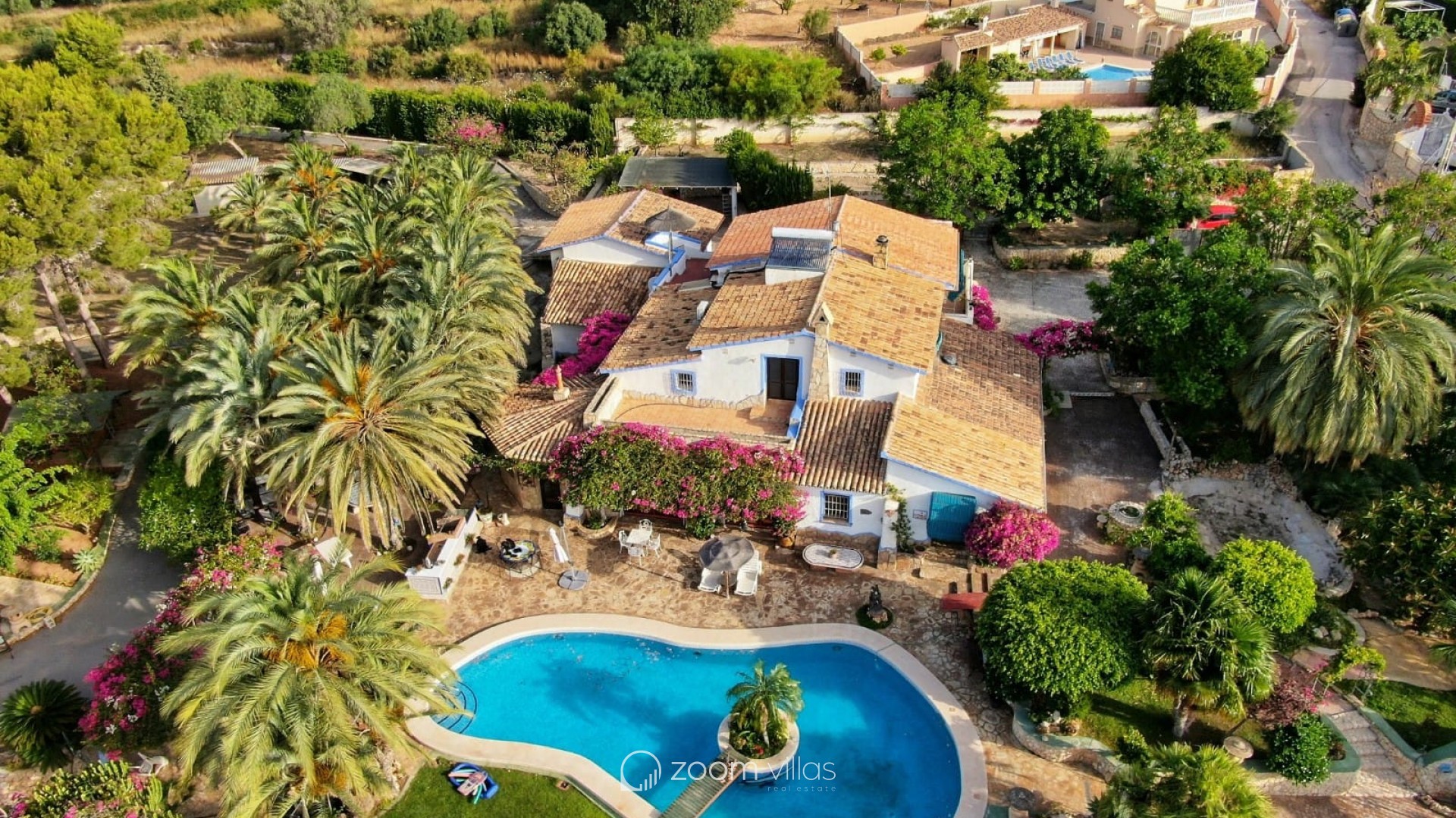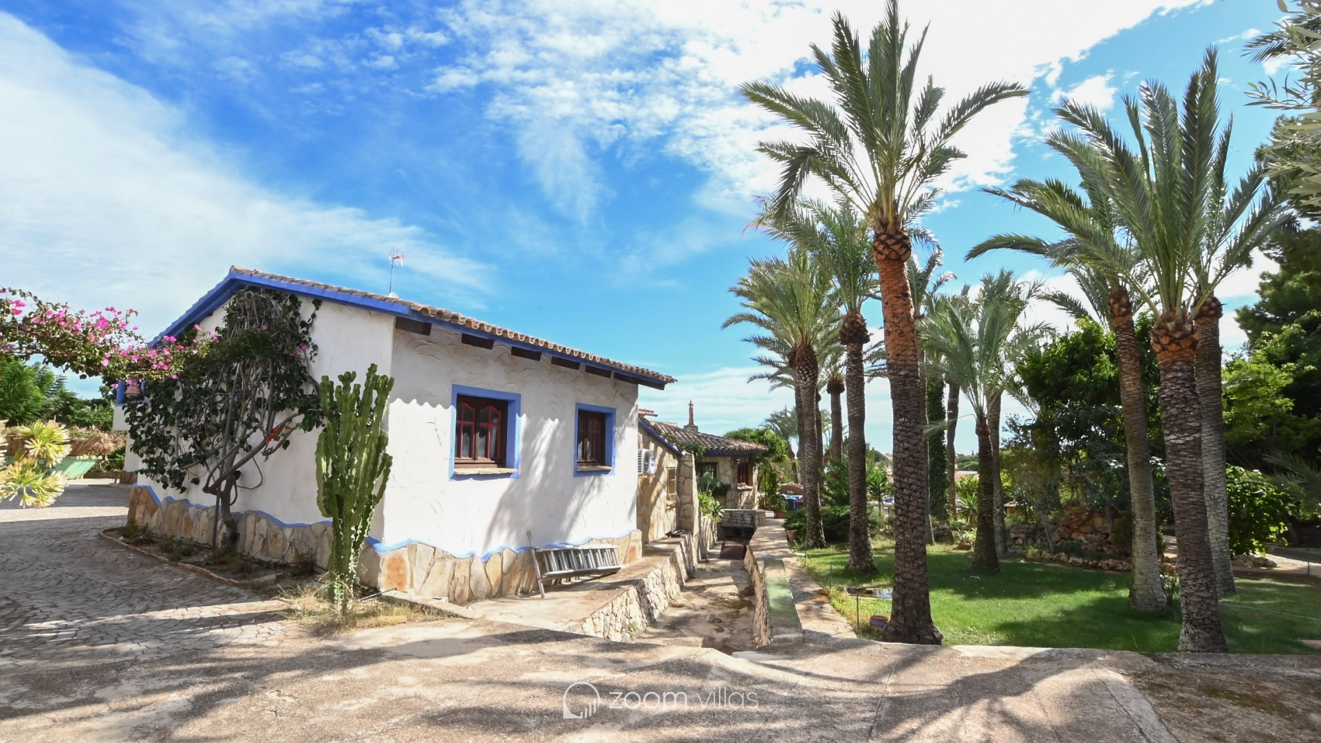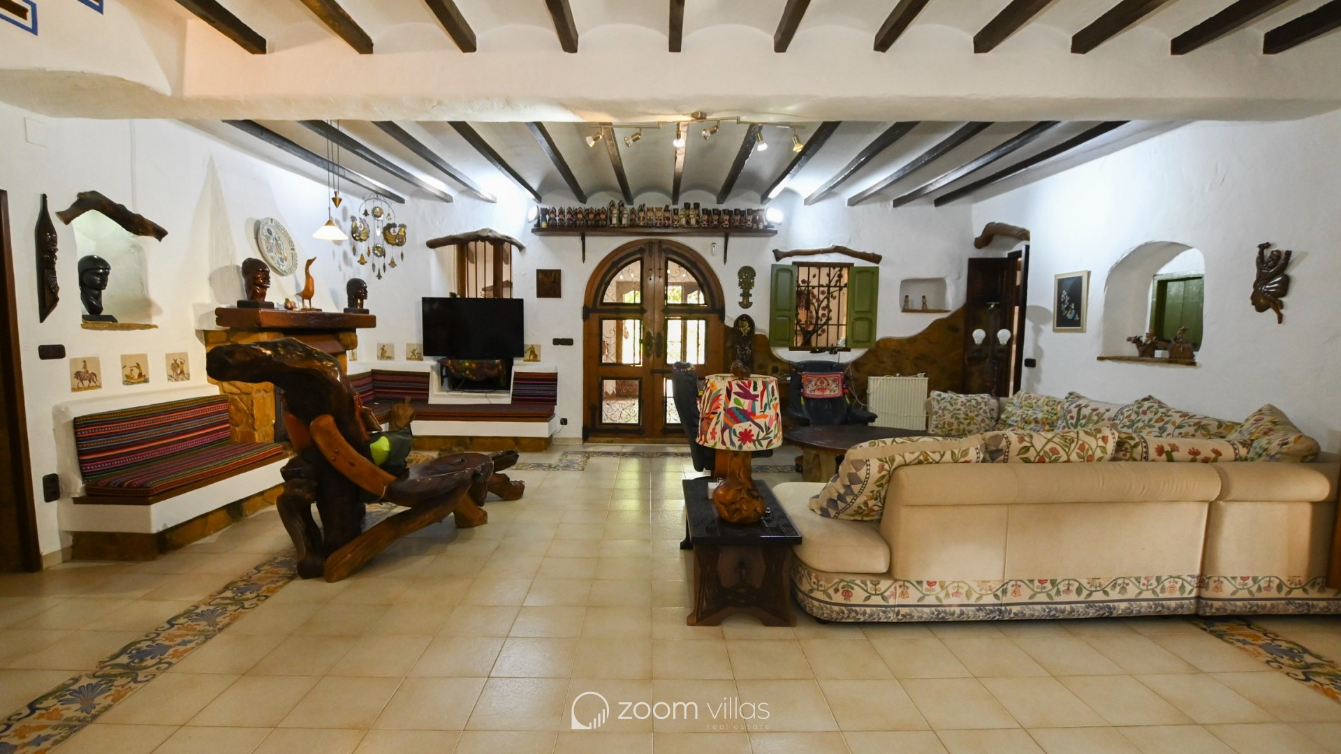 Magnifique et unique finca de plus de 200 ans, rénovée au début des années 90. Elle a une surface habitable de 400m2 sur un terrain rustique de 11.000m2. La propriété a deux étages, reliés par un escalier intérieur. A l´étage : Chambre principale de 36m2 avec air conditionné, TV, armoires encastrées et accès à une terrasse avec une belle vue sur la mer. De la chambre, on accède à la salle de bains attenante avec baignoire, douche, double lavabo, WC et bidet. La salle de bain se trouve juste sous le toit, elle a donc une partie basse, attention à la tête. Chambre double de 25m2 avec air conditionné, sortie sur le balcon et salle de bain attenante avec douche, bidet, lavabo et WC. En bas : 1 chambre double avec lits superposés pour enfants, air conditionné et sortie sur la terrasse extérieure avec vue sur la palmeraie. Salle de bain avec baignoire, bidet, lavabo et WC. 1 chambre double avec climatisation et salle de bain attenante avec douche, lavabo et WC. Salon de 49m2 avec cheminée et accès à un bureau. Salle de jeux. Salle à manger principale de 20m2. Cuisine ouverte avec four, plaque de cuisson au gaz, lave-vaisselle, micro-ondes et coin repas avec vue sur la piscine et la mer. Coin salon à côté de la salle à manger. Buanderie (derrière la maison) avec réfrigérateur et machine à laver. Toilettes. La finca est meublée dans un style rustique avec des meubles et une décoration provenant d´Amérique latine, en particulier de Bolivie, du Chili et du Mexique. Extérieur : Piscine (non clôturée) avec île au milieu, 17m x 9m de large (forme irrégulière), avec des marches romaines, belles vues sur la mer et le Peñon d´Ifach. A côté de la piscine il y a une pelouse avec des palmiers et des vues dégagées. La piscine est entourée d´une grande terrasse avec des meubles d´extérieur, un barbecue intégré, un parasol et une salle à manger intégrée. Zone de palmiers avec cascade, pelouse et grande table ronde pour 8-10 personnes. Parc avec route asphaltée, pins, bougainvilliers, aires de repos et vues dégagées sur la mer. Le jardin est un paradis et entoure la villa. Vous pouvez vous promener entre les sentiers du parc et autour de la propriété. Terrain de pétanque. Douche extérieure juste à côté de la piscine. Murs en pierre naturelle. Parking pour plusieurs voitures (1 couvert). La maison est équipée d´une alarme, de l´éclairage de la piscine, de moustiquaires aux fenêtres des chambres et d´un coffre-fort. A l´extérieur, il y a plusieurs pièces de rangement et un garage. Située à 1,2km de Puerto Blanco, 2,5km du centre de Calpe et 3km de la plage de sable. Supermarché à 2,5km, pharmacie à 2km et restaurant le plus proche à 1km. Aéroport d´Alicante à 70 km et aéroport de Valence à 120 km.