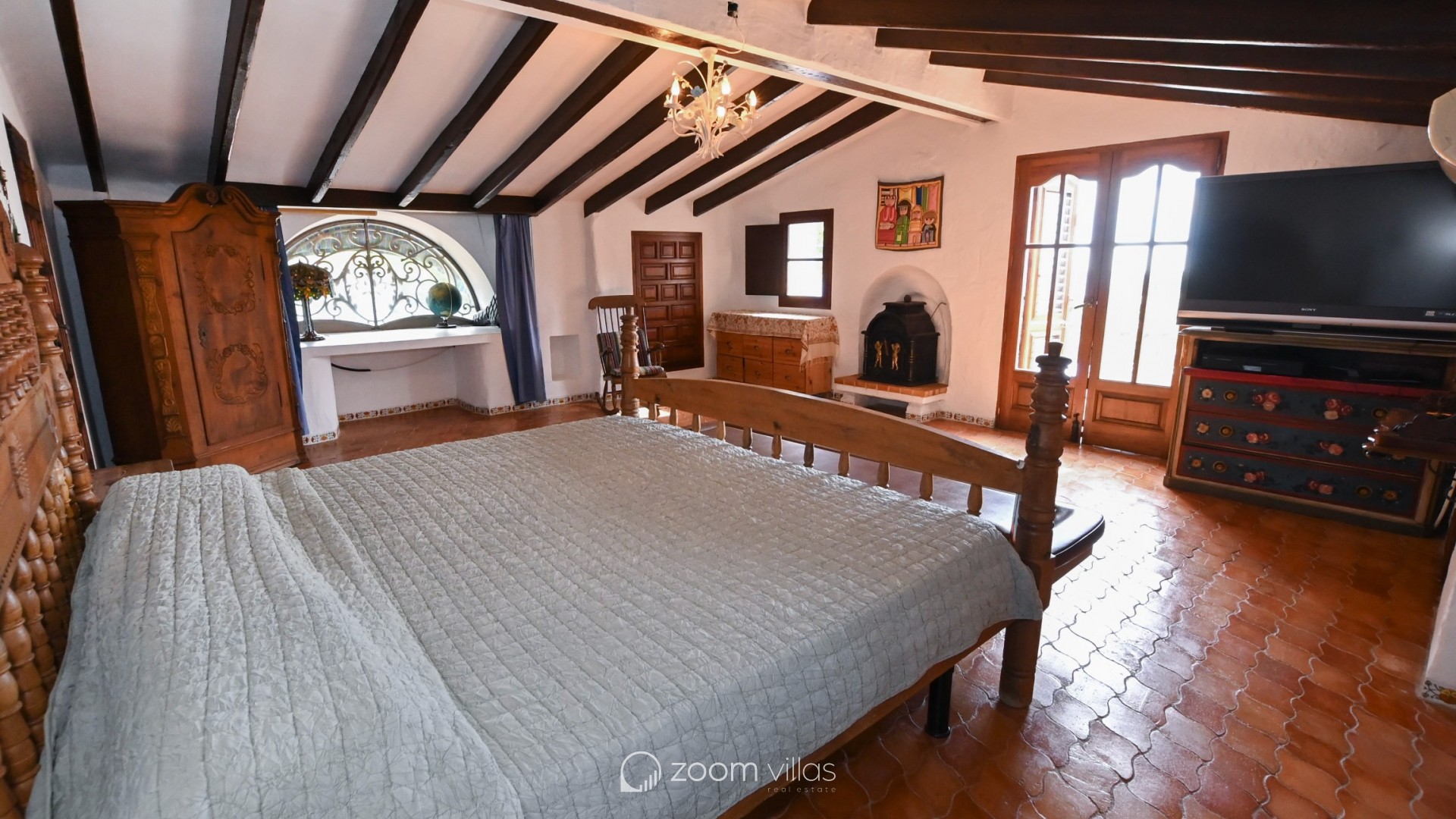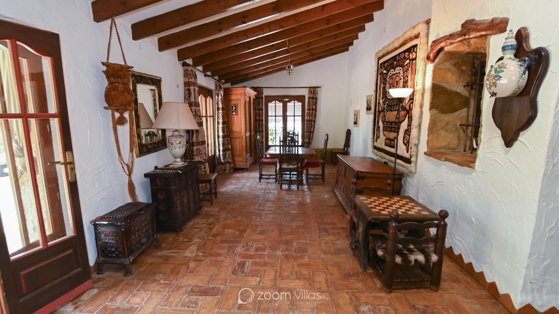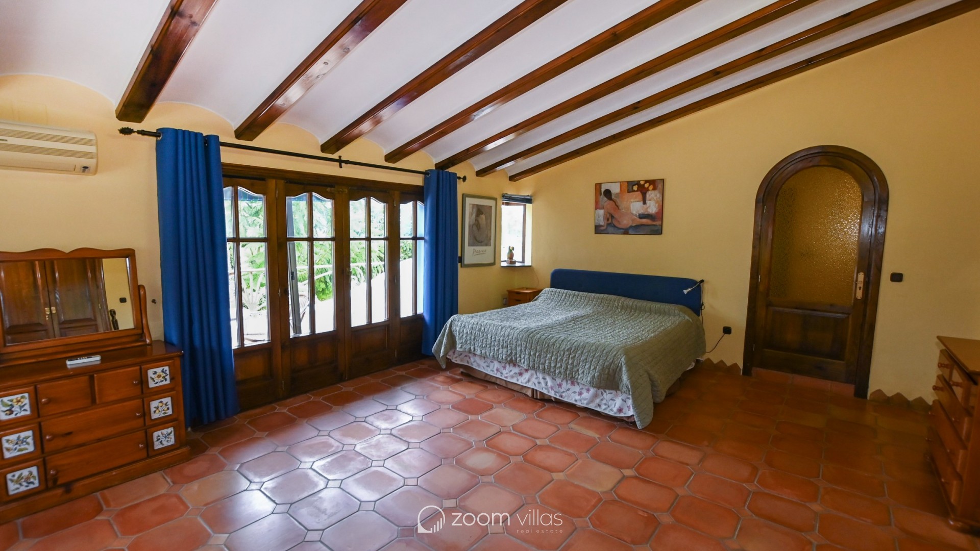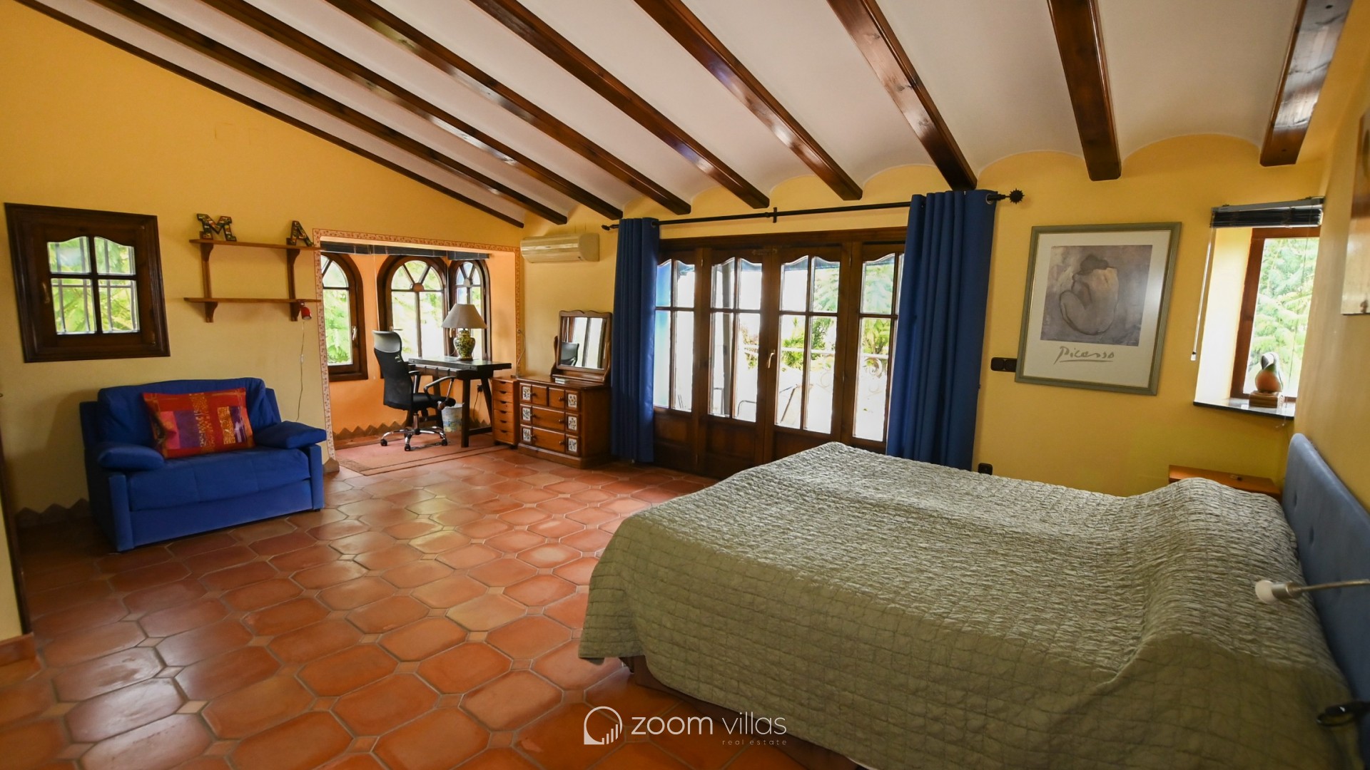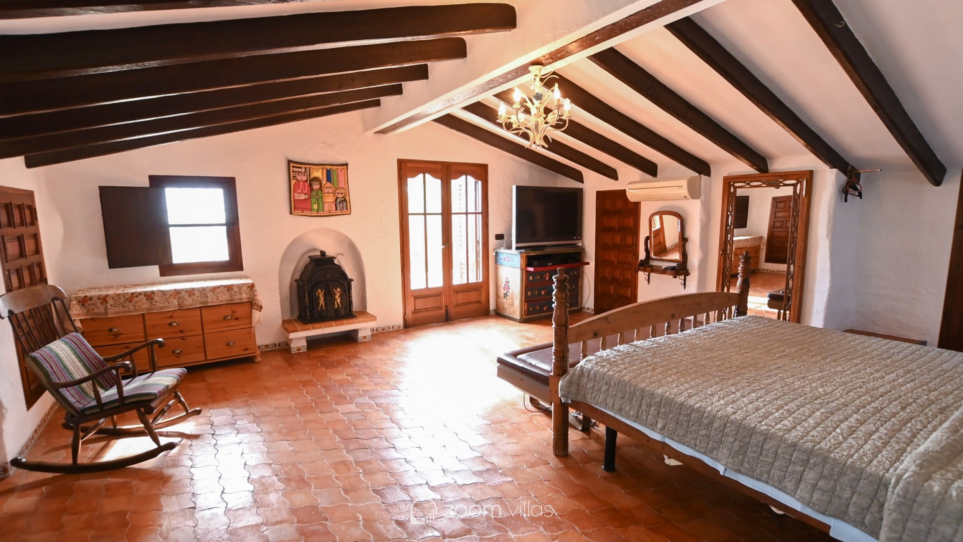 Magnifique et unique finca de plus de 200 ans, rénovée au début des années 90. Elle a une surface habitable de 400m2 sur un terrain rustique de 11.000m2. La propriété a deux étages, reliés par un escalier intérieur. A l´étage : Chambre principale de 36m2 avec air conditionné, TV, armoires encastrées et accès à une terrasse avec une belle vue sur la mer. De la chambre, on accède à la salle de bains attenante avec baignoire, douche, double lavabo, WC et bidet. La salle de bain se trouve juste sous le toit, elle a donc une partie basse, attention à la tête. Chambre double de 25m2 avec air conditionné, sortie sur le balcon et salle de bain attenante avec douche, bidet, lavabo et WC. En bas : 1 chambre double avec lits superposés pour enfants, air conditionné et sortie sur la terrasse extérieure avec vue sur la palmeraie. Salle de bain avec baignoire, bidet, lavabo et WC. 1 chambre double avec climatisation et salle de bain attenante avec douche, lavabo et WC. Salon de 49m2 avec cheminée et accès à un bureau. Salle de jeux. Salle à manger principale de 20m2. Cuisine ouverte avec four, plaque de cuisson au gaz, lave-vaisselle, micro-ondes et coin repas avec vue sur la piscine et la mer. Coin salon à côté de la salle à manger. Buanderie (derrière la maison) avec réfrigérateur et machine à laver. Toilettes. La finca est meublée dans un style rustique avec des meubles et une décoration provenant d´Amérique latine, en particulier de Bolivie, du Chili et du Mexique. Extérieur : Piscine (non clôturée) avec île au milieu, 17m x 9m de large (forme irrégulière), avec des marches romaines, belles vues sur la mer et le Peñon d´Ifach. A côté de la piscine il y a une pelouse avec des palmiers et des vues dégagées. La piscine est entourée d´une grande terrasse avec des meubles d´extérieur, un barbecue intégré, un parasol et une salle à manger intégrée. Zone de palmiers avec cascade, pelouse et grande table ronde pour 8-10 personnes. Parc avec route asphaltée, pins, bougainvilliers, aires de repos et vues dégagées sur la mer. Le jardin est un paradis et entoure la villa. Vous pouvez vous promener entre les sentiers du parc et autour de la propriété. Terrain de pétanque. Douche extérieure juste à côté de la piscine. Murs en pierre naturelle. Parking pour plusieurs voitures (1 couvert). La maison est équipée d´une alarme, de l´éclairage de la piscine, de moustiquaires aux fenêtres des chambres et d´un coffre-fort. A l´extérieur, il y a plusieurs pièces de rangement et un garage. Située à 1,2km de Puerto Blanco, 2,5km du centre de Calpe et 3km de la plage de sable. Supermarché à 2,5km, pharmacie à 2km et restaurant le plus proche à 1km. Aéroport d´Alicante à 70 km et aéroport de Valence à 120 km.
