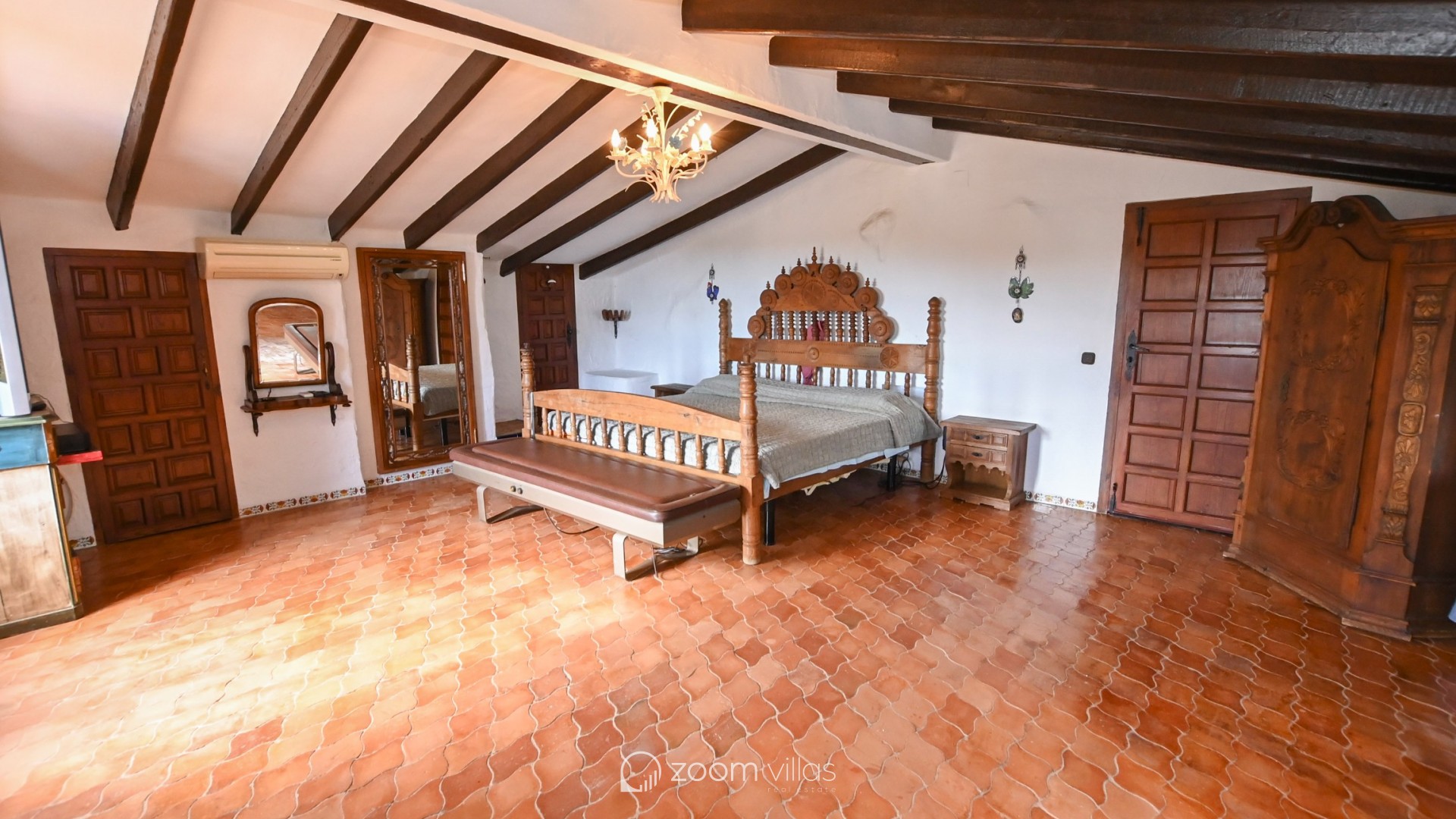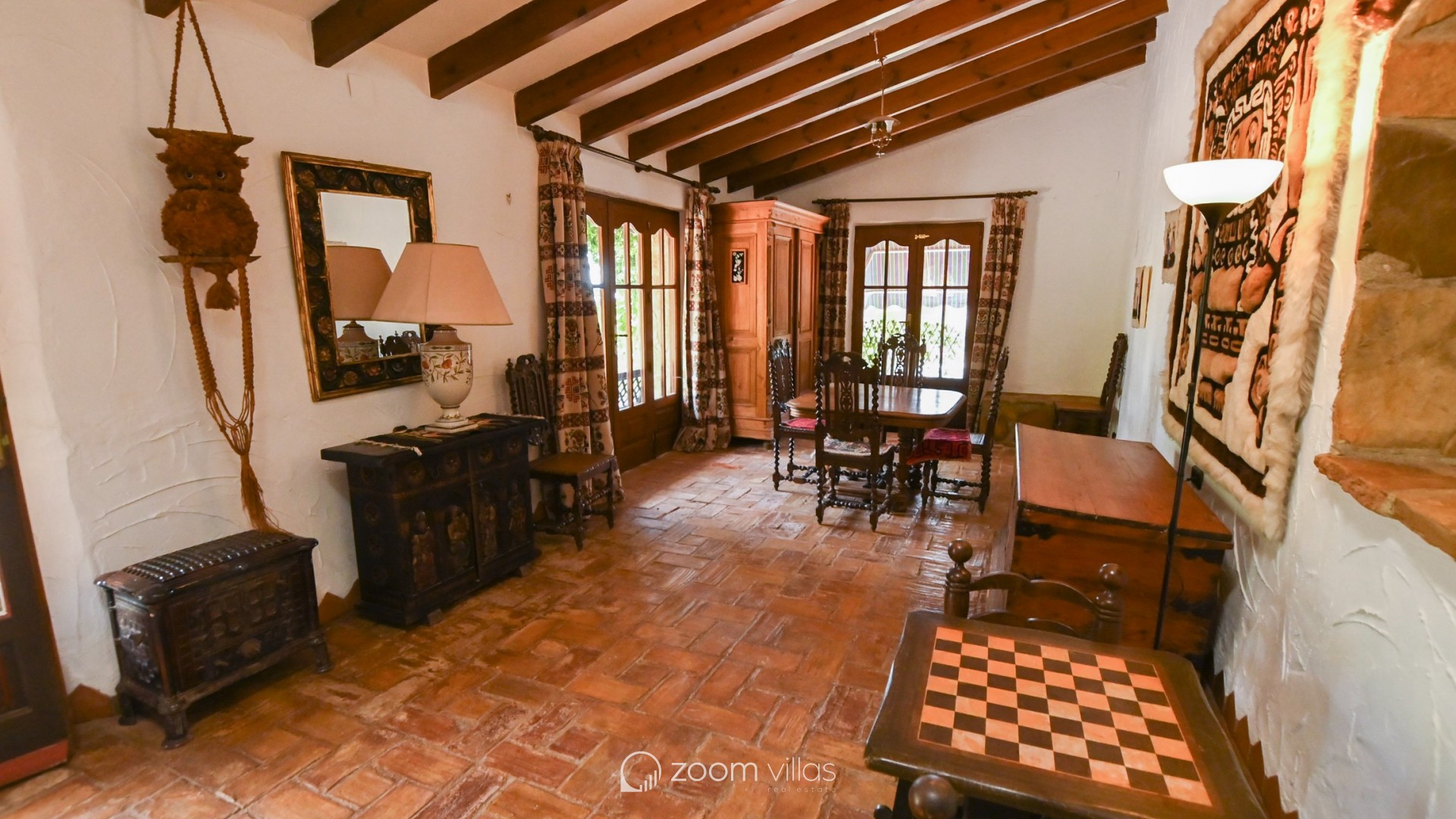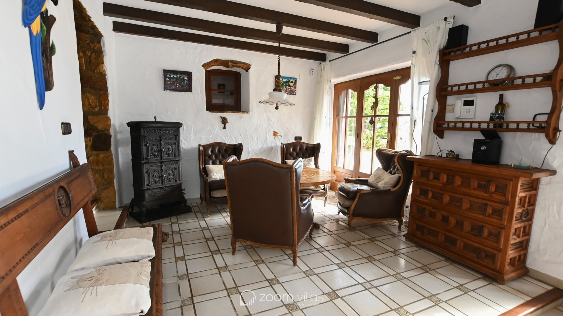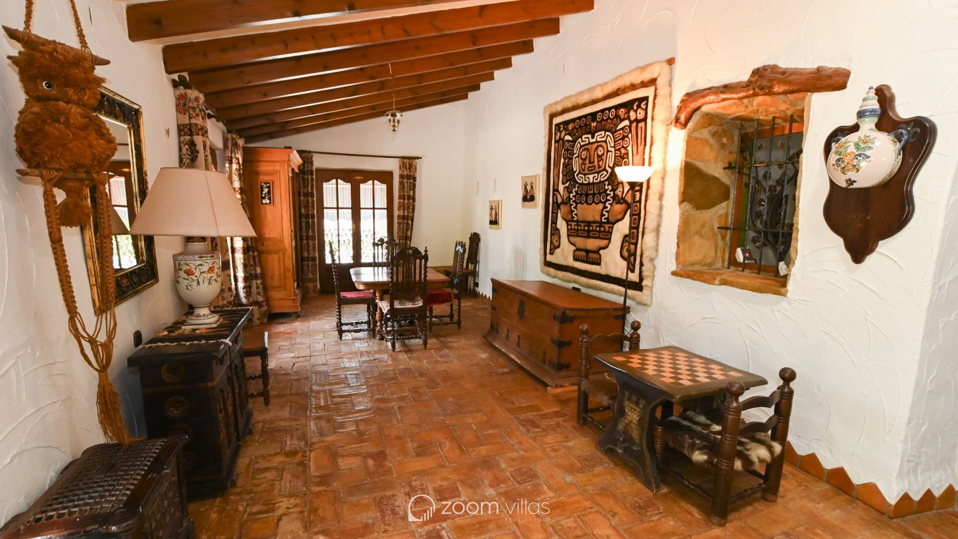 Magnifique et unique finca de plus de 200 ans, rénovée au début des années 90. Elle a une surface habitable de 400m2 sur un terrain rustique de 11.000m2. La propriété a deux étages, reliés par un escalier intérieur. A l´étage : Chambre principale de 36m2 avec air conditionné, TV, armoires encastrées et accès à une terrasse avec une belle vue sur la mer. De la chambre, on accède à la salle de bains attenante avec baignoire, douche, double lavabo, WC et bidet. La salle de bain se trouve juste sous le toit, elle a donc une partie basse, attention à la tête. Chambre double de 25m2 avec air conditionné, sortie sur le balcon et salle de bain attenante avec douche, bidet, lavabo et WC. En bas : 1 chambre double avec lits superposés pour enfants, air conditionné et sortie sur la terrasse extérieure avec vue sur la palmeraie. Salle de bain avec baignoire, bidet, lavabo et WC. 1 chambre double avec climatisation et salle de bain attenante avec douche, lavabo et WC. Salon de 49m2 avec cheminée et accès à un bureau. Salle de jeux. Salle à manger principale de 20m2. Cuisine ouverte avec four, plaque de cuisson au gaz, lave-vaisselle, micro-ondes et coin repas avec vue sur la piscine et la mer. Coin salon à côté de la salle à manger. Buanderie (derrière la maison) avec réfrigérateur et machine à laver. Toilettes. La finca est meublée dans un style rustique avec des meubles et une décoration provenant d´Amérique latine, en particulier de Bolivie, du Chili et du Mexique. Extérieur : Piscine (non clôturée) avec île au milieu, 17m x 9m de large (forme irrégulière), avec des marches romaines, belles vues sur la mer et le Peñon d´Ifach. A côté de la piscine il y a une pelouse avec des palmiers et des vues dégagées. La piscine est entourée d´une grande terrasse avec des meubles d´extérieur, un barbecue intégré, un parasol et une salle à manger intégrée. Zone de palmiers avec cascade, pelouse et grande table ronde pour 8-10 personnes. Parc avec route asphaltée, pins, bougainvilliers, aires de repos et vues dégagées sur la mer. Le jardin est un paradis et entoure la villa. Vous pouvez vous promener entre les sentiers du parc et autour de la propriété. Terrain de pétanque. Douche extérieure juste à côté de la piscine. Murs en pierre naturelle. Parking pour plusieurs voitures (1 couvert). La maison est équipée d´une alarme, de l´éclairage de la piscine, de moustiquaires aux fenêtres des chambres et d´un coffre-fort. A l´extérieur, il y a plusieurs pièces de rangement et un garage. Située à 1,2km de Puerto Blanco, 2,5km du centre de Calpe et 3km de la plage de sable. Supermarché à 2,5km, pharmacie à 2km et restaurant le plus proche à 1km. Aéroport d´Alicante à 70 km et aéroport de Valence à 120 km.