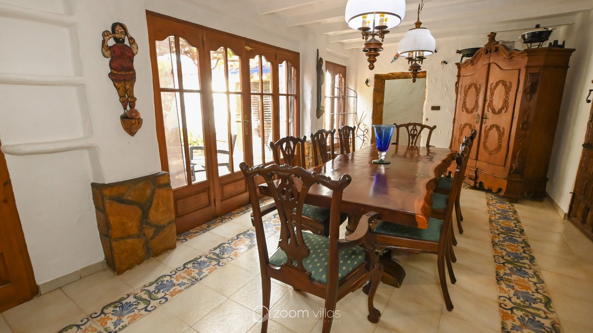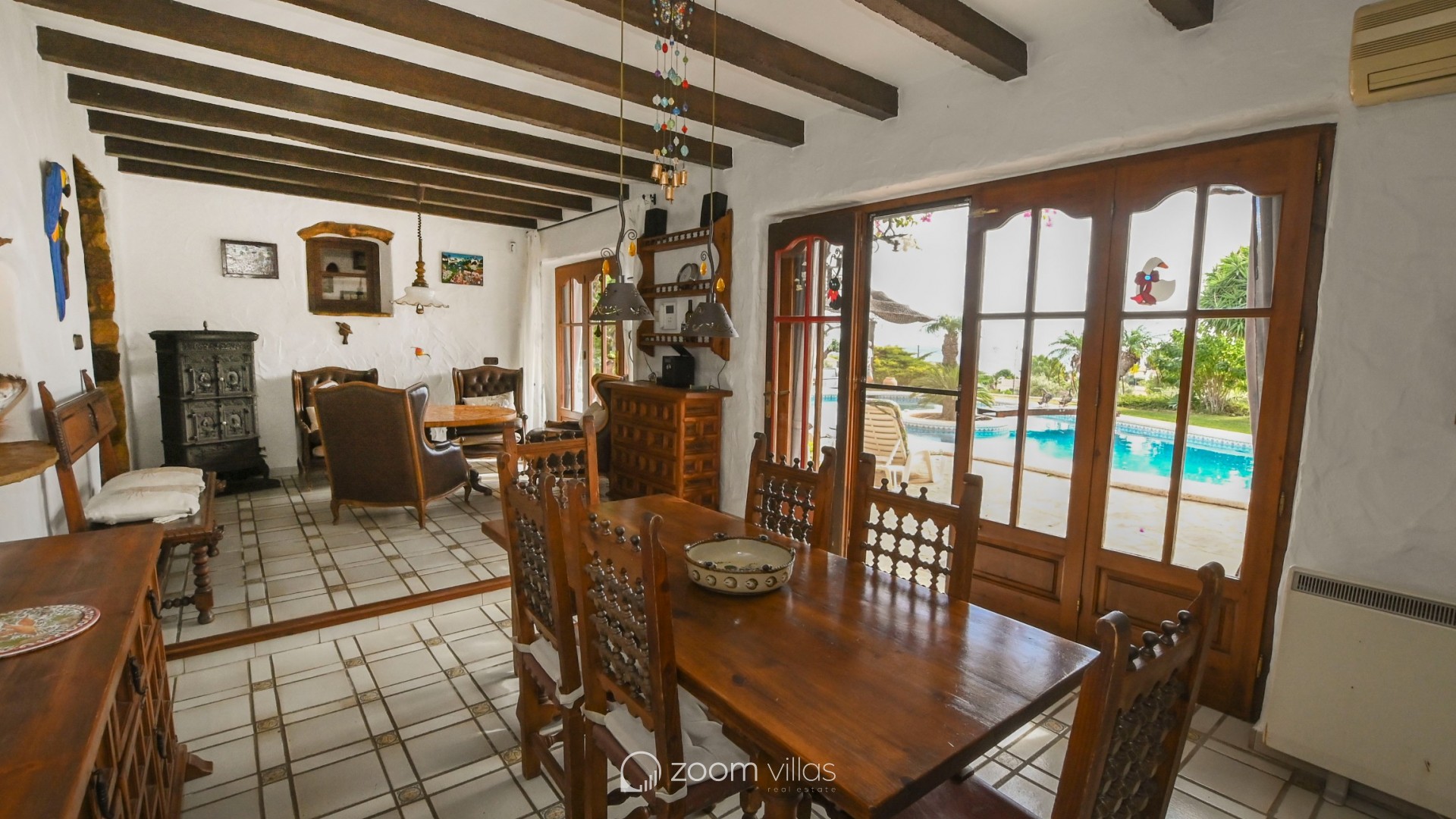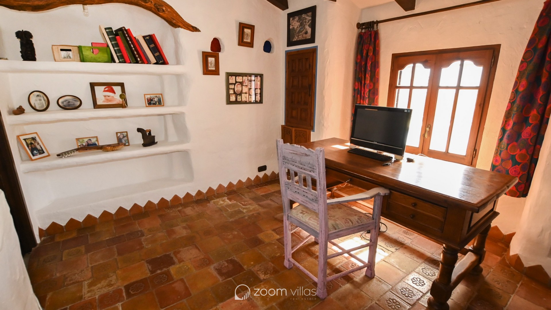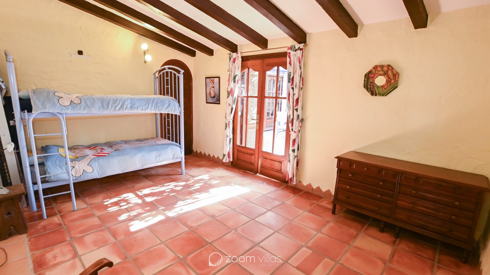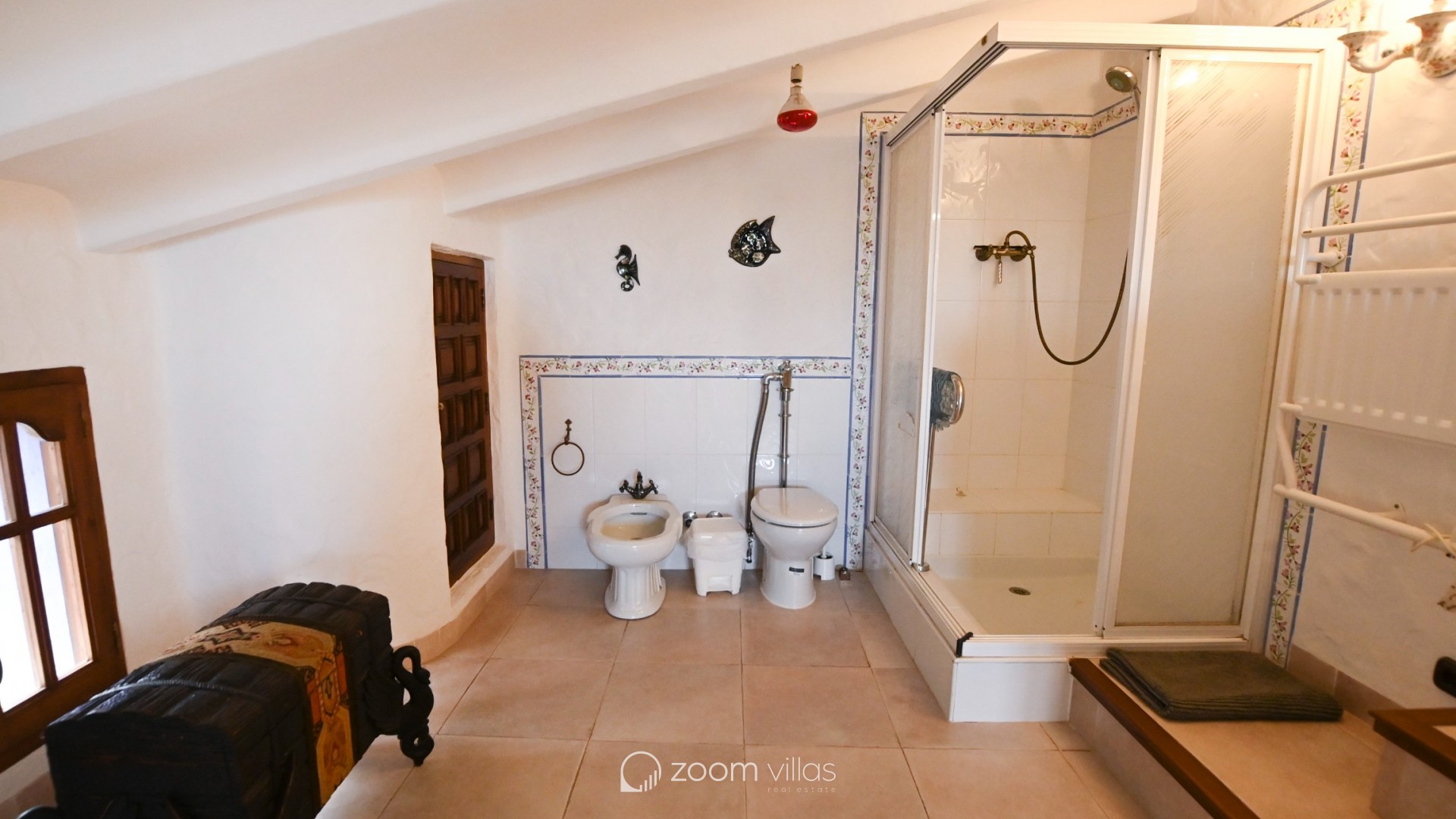 Magnifique et unique finca de plus de 200 ans, rénovée au début des années 90. Elle a une surface habitable de 400m2 sur un terrain rustique de 11.000m2. La propriété a deux étages, reliés par un escalier intérieur. A l´étage : Chambre principale de 36m2 avec air conditionné, TV, armoires encastrées et accès à une terrasse avec une belle vue sur la mer. De la chambre, on accède à la salle de bains attenante avec baignoire, douche, double lavabo, WC et bidet. La salle de bain se trouve juste sous le toit, elle a donc une partie basse, attention à la tête. Chambre double de 25m2 avec air conditionné, sortie sur le balcon et salle de bain attenante avec douche, bidet, lavabo et WC. En bas : 1 chambre double avec lits superposés pour enfants, air conditionné et sortie sur la terrasse extérieure avec vue sur la palmeraie. Salle de bain avec baignoire, bidet, lavabo et WC. 1 chambre double avec climatisation et salle de bain attenante avec douche, lavabo et WC. Salon de 49m2 avec cheminée et accès à un bureau. Salle de jeux. Salle à manger principale de 20m2. Cuisine ouverte avec four, plaque de cuisson au gaz, lave-vaisselle, micro-ondes et coin repas avec vue sur la piscine et la mer. Coin salon à côté de la salle à manger. Buanderie (derrière la maison) avec réfrigérateur et machine à laver. Toilettes. La finca est meublée dans un style rustique avec des meubles et une décoration provenant d´Amérique latine, en particulier de Bolivie, du Chili et du Mexique. Extérieur : Piscine (non clôturée) avec île au milieu, 17m x 9m de large (forme irrégulière), avec des marches romaines, belles vues sur la mer et le Peñon d´Ifach. A côté de la piscine il y a une pelouse avec des palmiers et des vues dégagées. La piscine est entourée d´une grande terrasse avec des meubles d´extérieur, un barbecue intégré, un parasol et une salle à manger intégrée. Zone de palmiers avec cascade, pelouse et grande table ronde pour 8-10 personnes. Parc avec route asphaltée, pins, bougainvilliers, aires de repos et vues dégagées sur la mer. Le jardin est un paradis et entoure la villa. Vous pouvez vous promener entre les sentiers du parc et autour de la propriété. Terrain de pétanque. Douche extérieure juste à côté de la piscine. Murs en pierre naturelle. Parking pour plusieurs voitures (1 couvert). La maison est équipée d´une alarme, de l´éclairage de la piscine, de moustiquaires aux fenêtres des chambres et d´un coffre-fort. A l´extérieur, il y a plusieurs pièces de rangement et un garage. Située à 1,2km de Puerto Blanco, 2,5km du centre de Calpe et 3km de la plage de sable. Supermarché à 2,5km, pharmacie à 2km et restaurant le plus proche à 1km. Aéroport d´Alicante à 70 km et aéroport de Valence à 120 km.