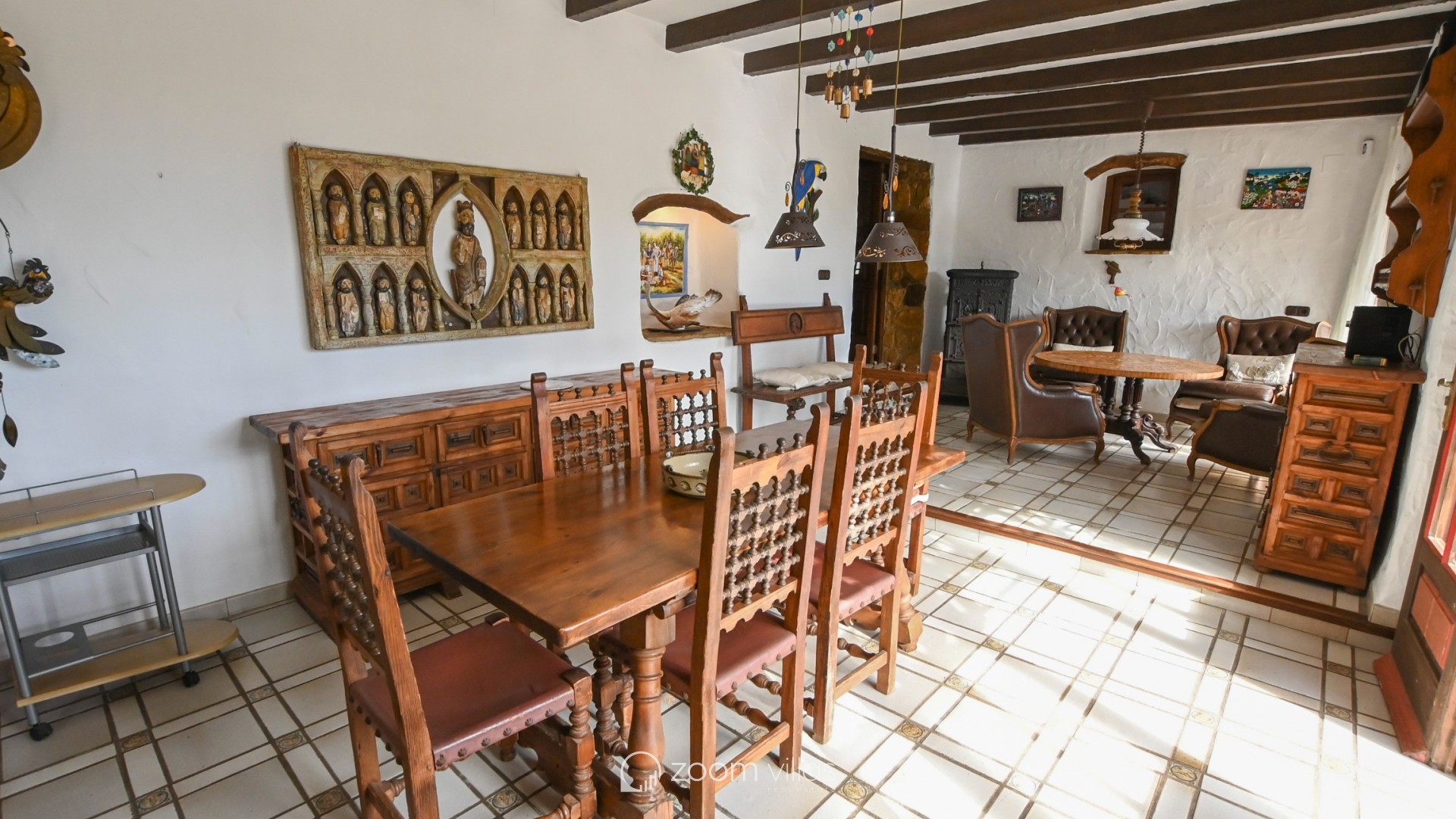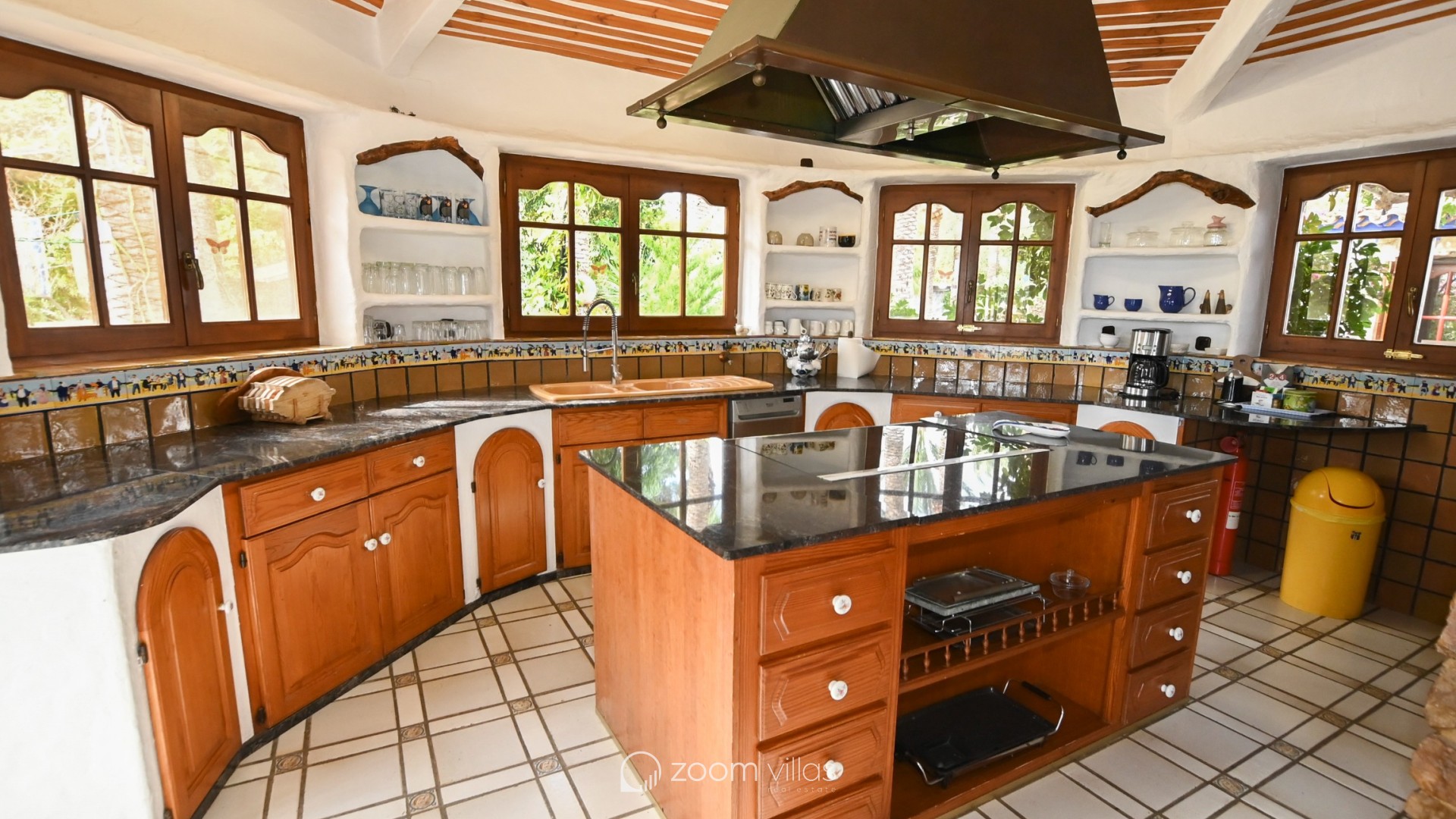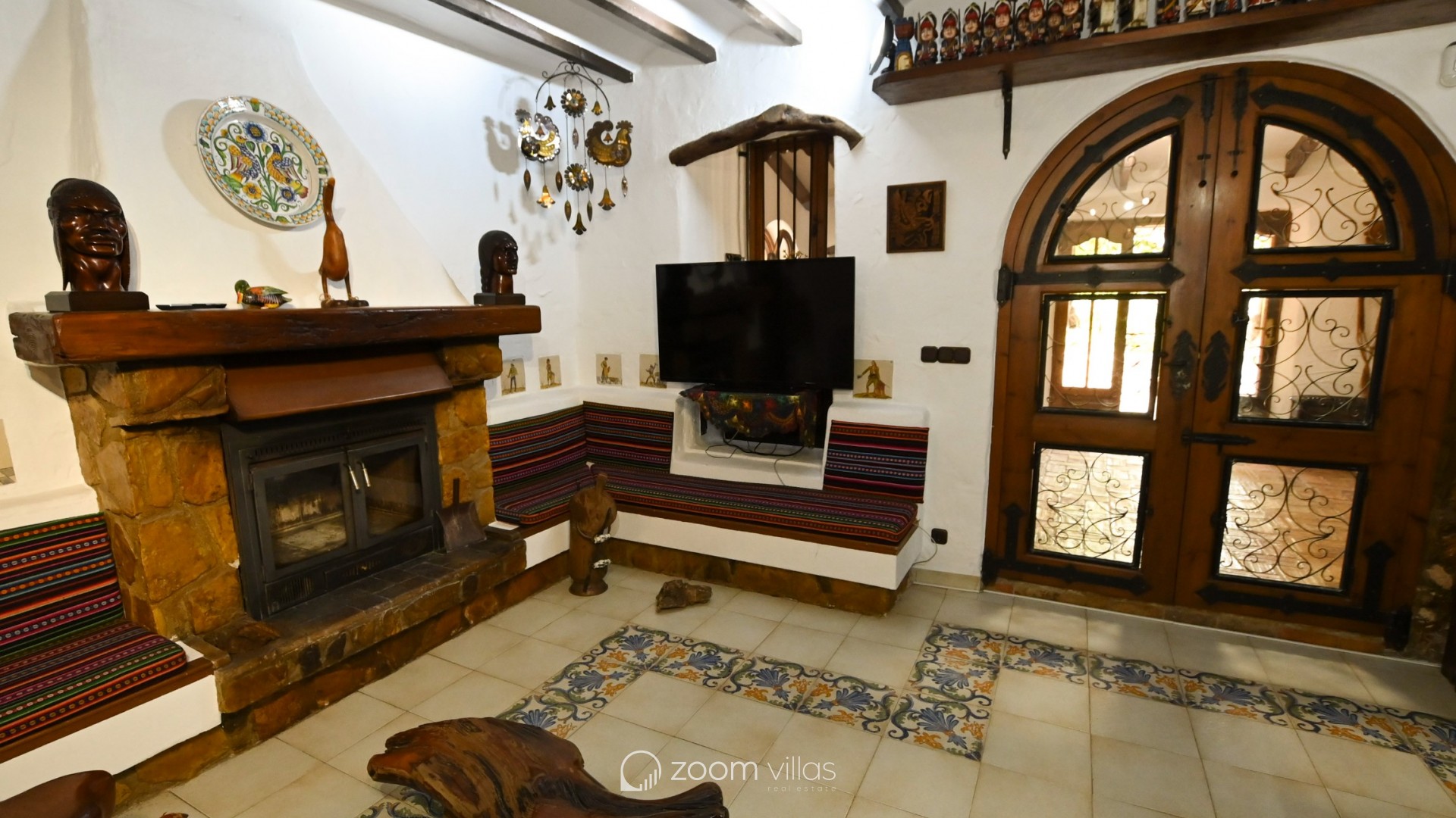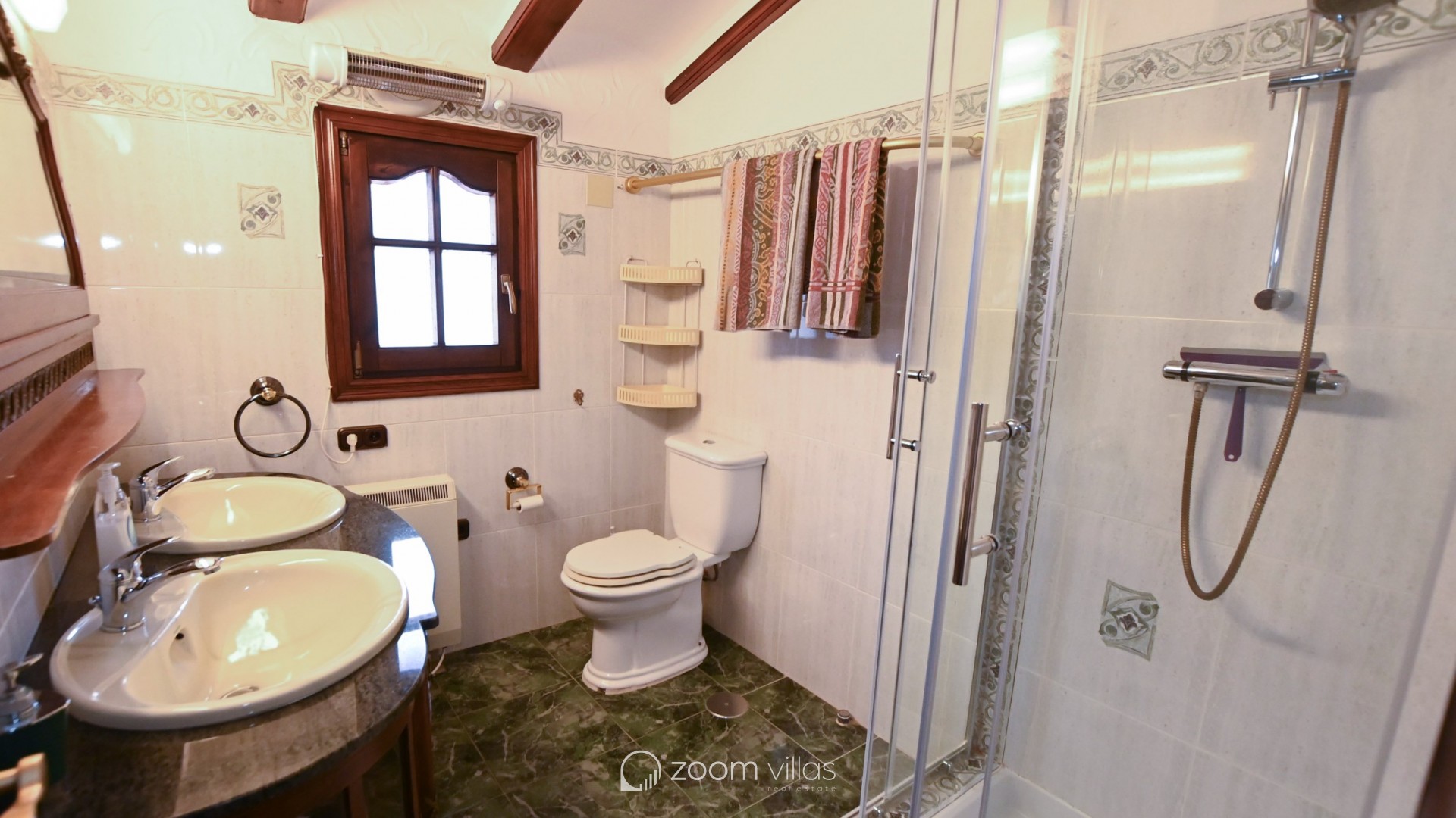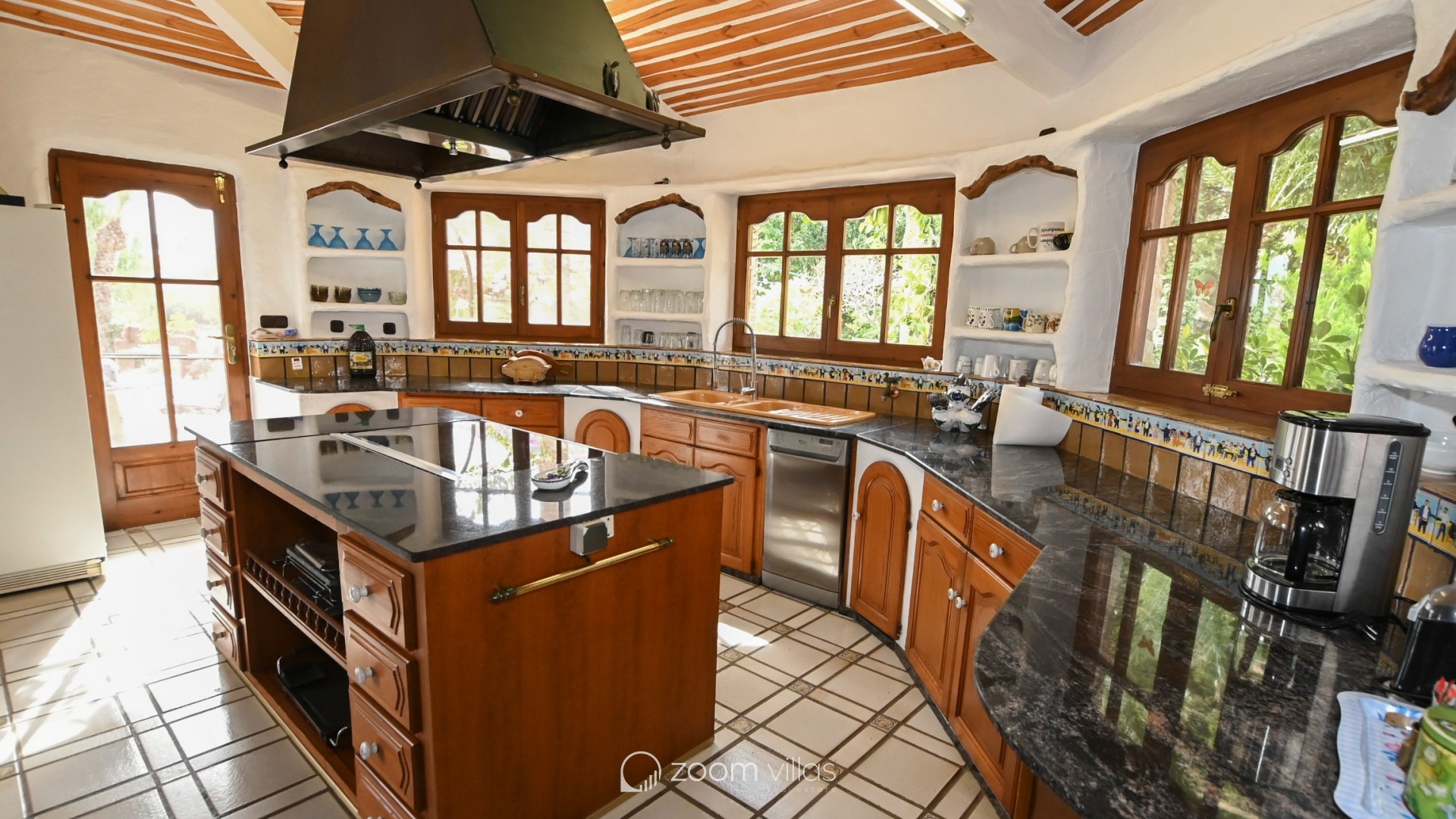 Magnifique et unique finca de plus de 200 ans, rénovée au début des années 90. Elle a une surface habitable de 400m2 sur un terrain rustique de 11.000m2. La propriété a deux étages, reliés par un escalier intérieur. A l´étage : Chambre principale de 36m2 avec air conditionné, TV, armoires encastrées et accès à une terrasse avec une belle vue sur la mer. De la chambre, on accède à la salle de bains attenante avec baignoire, douche, double lavabo, WC et bidet. La salle de bain se trouve juste sous le toit, elle a donc une partie basse, attention à la tête. Chambre double de 25m2 avec air conditionné, sortie sur le balcon et salle de bain attenante avec douche, bidet, lavabo et WC. En bas : 1 chambre double avec lits superposés pour enfants, air conditionné et sortie sur la terrasse extérieure avec vue sur la palmeraie. Salle de bain avec baignoire, bidet, lavabo et WC. 1 chambre double avec climatisation et salle de bain attenante avec douche, lavabo et WC. Salon de 49m2 avec cheminée et accès à un bureau. Salle de jeux. Salle à manger principale de 20m2. Cuisine ouverte avec four, plaque de cuisson au gaz, lave-vaisselle, micro-ondes et coin repas avec vue sur la piscine et la mer. Coin salon à côté de la salle à manger. Buanderie (derrière la maison) avec réfrigérateur et machine à laver. Toilettes. La finca est meublée dans un style rustique avec des meubles et une décoration provenant d´Amérique latine, en particulier de Bolivie, du Chili et du Mexique. Extérieur : Piscine (non clôturée) avec île au milieu, 17m x 9m de large (forme irrégulière), avec des marches romaines, belles vues sur la mer et le Peñon d´Ifach. A côté de la piscine il y a une pelouse avec des palmiers et des vues dégagées. La piscine est entourée d´une grande terrasse avec des meubles d´extérieur, un barbecue intégré, un parasol et une salle à manger intégrée. Zone de palmiers avec cascade, pelouse et grande table ronde pour 8-10 personnes. Parc avec route asphaltée, pins, bougainvilliers, aires de repos et vues dégagées sur la mer. Le jardin est un paradis et entoure la villa. Vous pouvez vous promener entre les sentiers du parc et autour de la propriété. Terrain de pétanque. Douche extérieure juste à côté de la piscine. Murs en pierre naturelle. Parking pour plusieurs voitures (1 couvert). La maison est équipée d´une alarme, de l´éclairage de la piscine, de moustiquaires aux fenêtres des chambres et d´un coffre-fort. A l´extérieur, il y a plusieurs pièces de rangement et un garage. Située à 1,2km de Puerto Blanco, 2,5km du centre de Calpe et 3km de la plage de sable. Supermarché à 2,5km, pharmacie à 2km et restaurant le plus proche à 1km. Aéroport d´Alicante à 70 km et aéroport de Valence à 120 km.