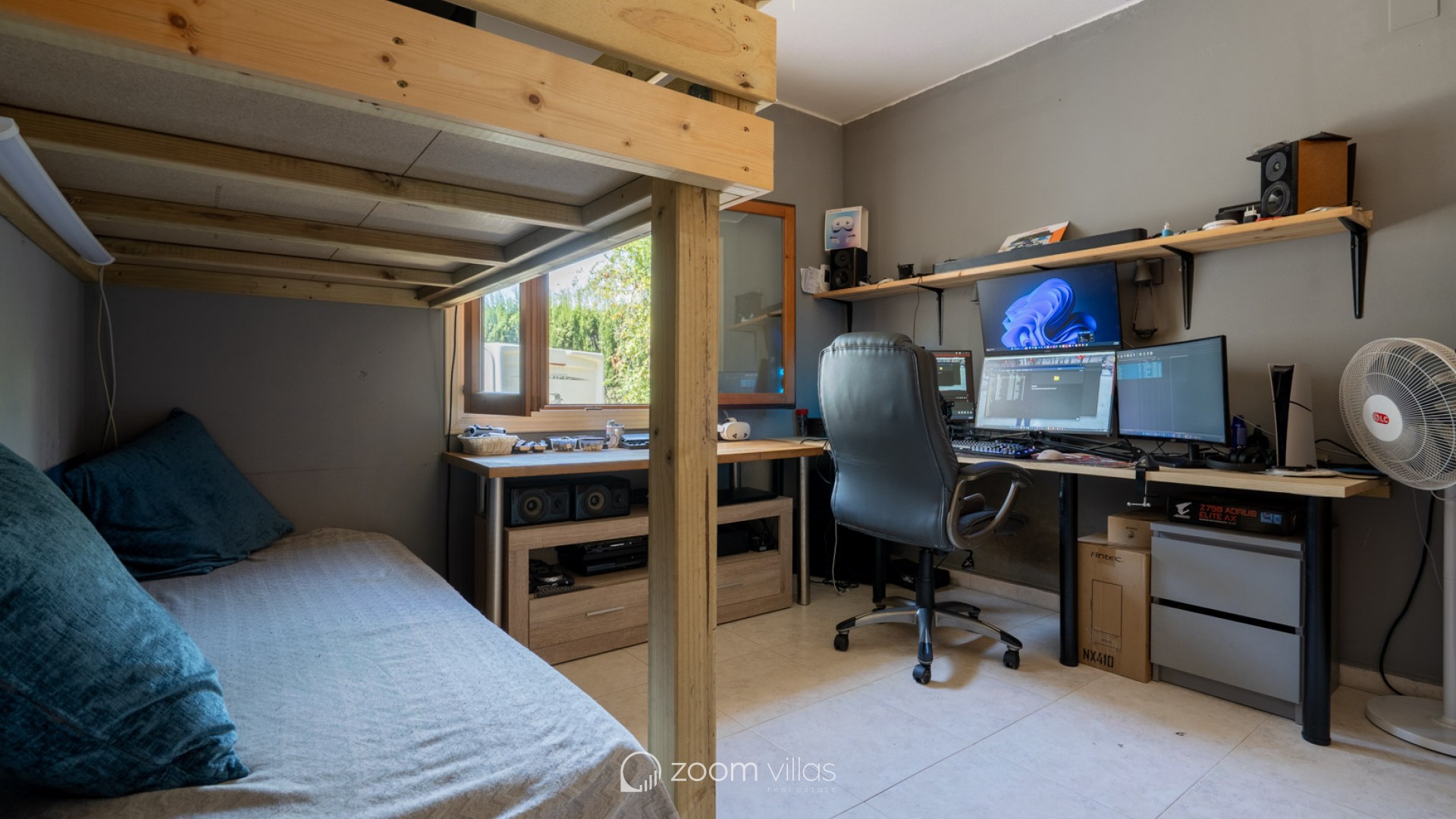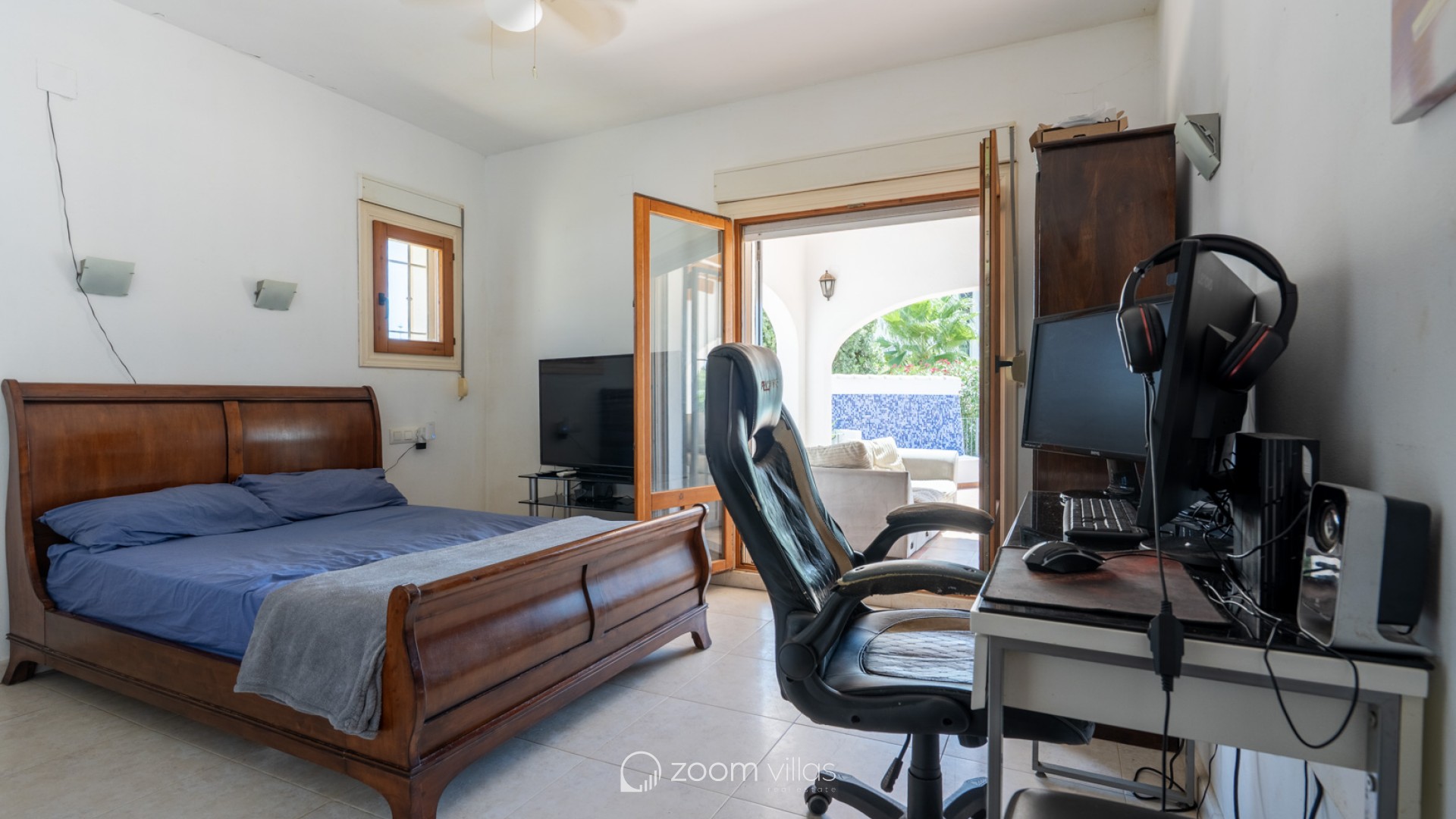 De eigendom is volledig gelijkvloers en beschikt over een gezellige woon-eetkamer met open haard en een aangrenzende halfopen keuken. Er zijn in totaal drie tweepersoonsslaapkamers, waarvan één met een eigen badkamer, plus een aparte badkamer. Zowel de woonkamer als de hoofdslaapkamer hebben directe toegang tot een ruim overdekt terras bij het zwembad, de perfecte plek om te ontspannen en te genieten van het mediterrane klimaat. Een paar treden lager ligt een zonnig onoverdekt terras met een barbecue. De villa heeft ook een onderhoudsvriendelijke mediterrane tuin met palmbomen, bloeiende struiken en een granaatappelboom.
