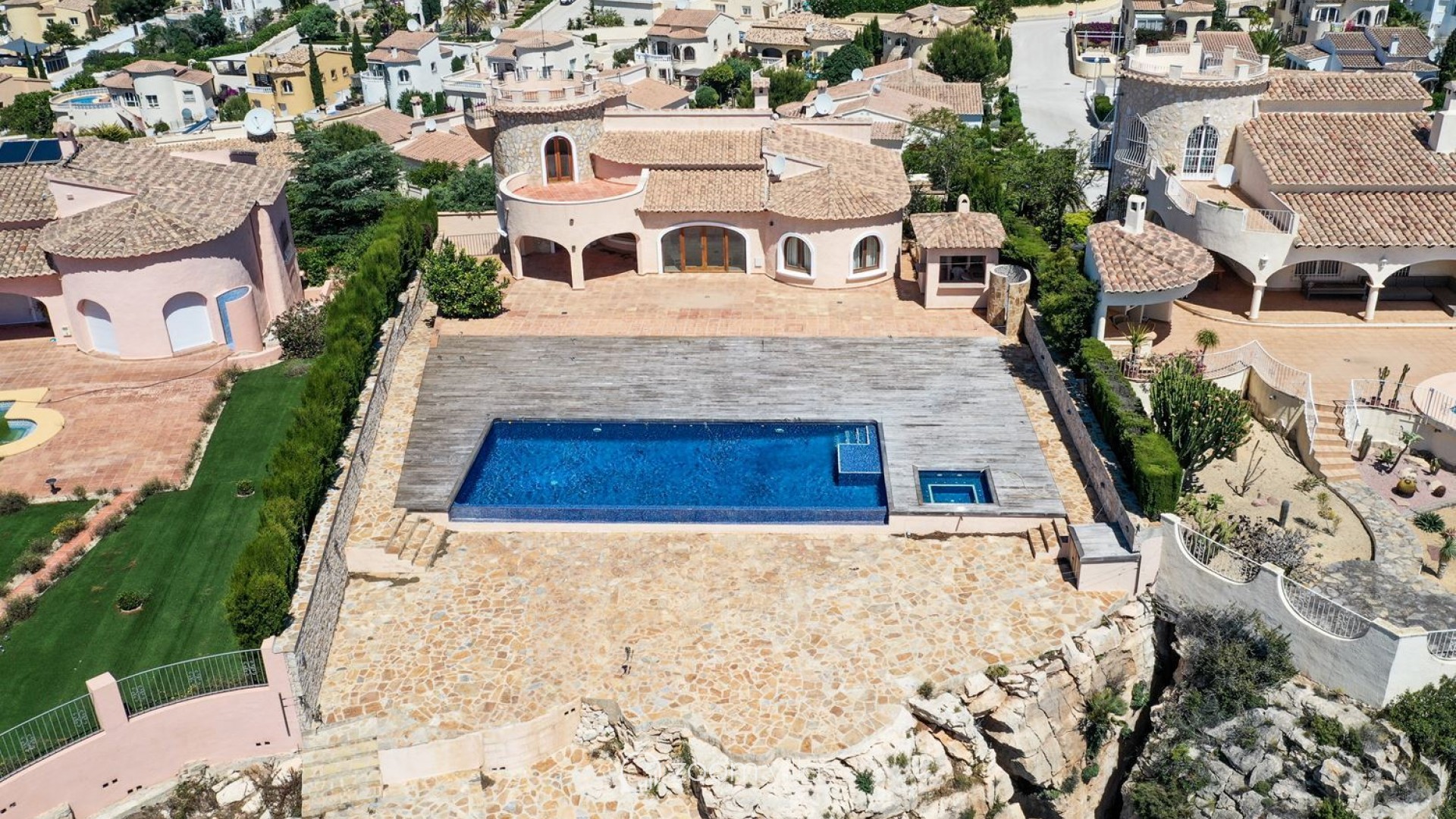 Villa recently renovated and located on the first line in the residential Palmeras with spectacular sea views and an overflowing private pool with a constructed area of 650 M2 (350 M2 of housing, 300 M2 of terraces and 1143 M2 of plot), the villa consists of five bedrooms, four bathrooms, several terraces with spectacular views of the sea and the cliffs, kitchen equipped with appliances, garage for two vehicles, underfloor heating and air conditioning in living room and bedrooms. The villa is built on three floors, on the main floor we have a spacious living room, dining room, three bedrooms, two bathrooms, kitchen and covered terrace with access to the terrace, barbecue area and the infinity pool. We go up to the second floor through the internal staircase and on this floor we have a bedroom, bathroom and exit to the terrace with access to the solarium terrace. The third floor is below the main floor and consists of a guest apartment with a bedroom and bathroom. The villa was built in 2001, recently renovated and is in a very good condition, has a South - Southeast orientation. Residencial Palmeras is a development of villas on plots of 250 to 1200M2 located in the Cumbre del Sol urbanization in Benitachell (Alicante). Most of the villas face south and southwest. Many of the properties enjoy beautiful sea views. There are also villas built on the front line of the cliff. The villas that do not have a private pool can use the common areas of Pueblo Montecala which are very close by with several pools, a social club, children's games and large terraces. Residencial Palmeras in Cumbre del Sol: villas with Mediterranean charm Residencial Palmeras is an attractive development of detached villas built on plots ranging from 250 m² to 1,200 m², located in the prestigious Cumbre del Sol residential area in Benitachell (between Jávea and Moraira, Alicante). Most of the villas enjoy an excellent south and south-west orientation, guaranteeing exceptional light throughout the year. Many of these properties offer spectacular sea views, and some are located on the front line of the cliffs, providing an unrivalled natural environment and a unique sense of serenity. For those villas that do not have a private pool, owners have access to the communal areas of Pueblo Montecala, located nearby. There you can enjoy several swimming pools, a social club, children's play areas and spacious terraces ideal for relaxation and socialising. Residencial Palmeras is strategically located at the southernmost point of Cumbre del Sol, just above Cala Llebeig, and adjacent to the special protection area of Portet de Moraira and Pueblo Montecala, a natural enclave of great ecological value. Distances to key amenities: 1 to 2 km: Dreamsea Mediterranean Camp, with a bar, restaurant and access to Moraig beach, Cala de los Tiestos and Cala Llebeig.3 to 4 km: Adelfas Shopping Centre, with the Pepe La Sal supermarket, hairdresser, maintenance and rental services agency, bar-café, La Cumbre restaurant and pharmacy. You will also find the riding school, the sports centre (paddle tennis, tennis, bar) and the prestigious Lady Elizabeth International School, as well as the Mercadona supermarket.6 to 8 km: Mas y Mas supermarket, Benitachell town centre, El Portet beach and town centre in Moraira, and the Javea golf course.13 km: The popular Arenal de Jávea beach.Experience the authentic Mediterranean lifestyle in one of the most exclusive areas of the Costa Blanca. Would you like to find out more or arrange a viewing? Contact us at Cumbre del Sol Pre-Owned and find the villa of your dreams.