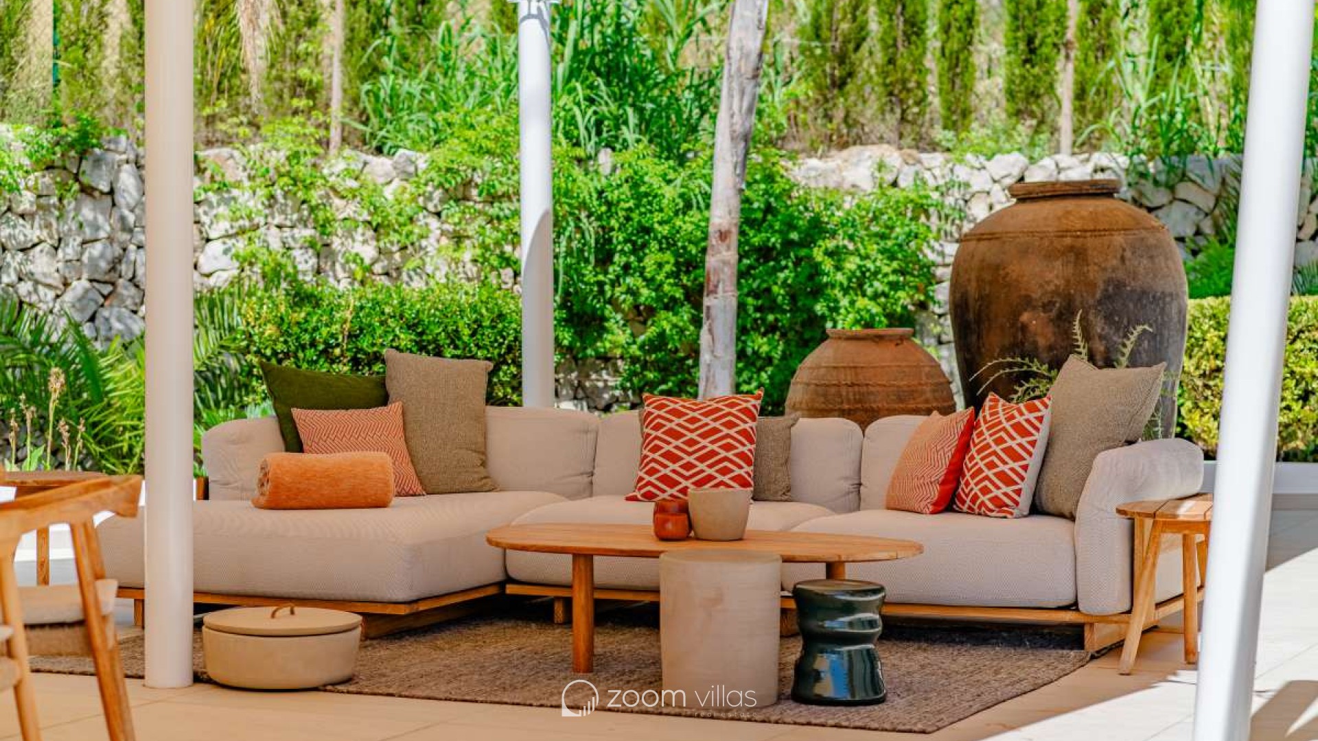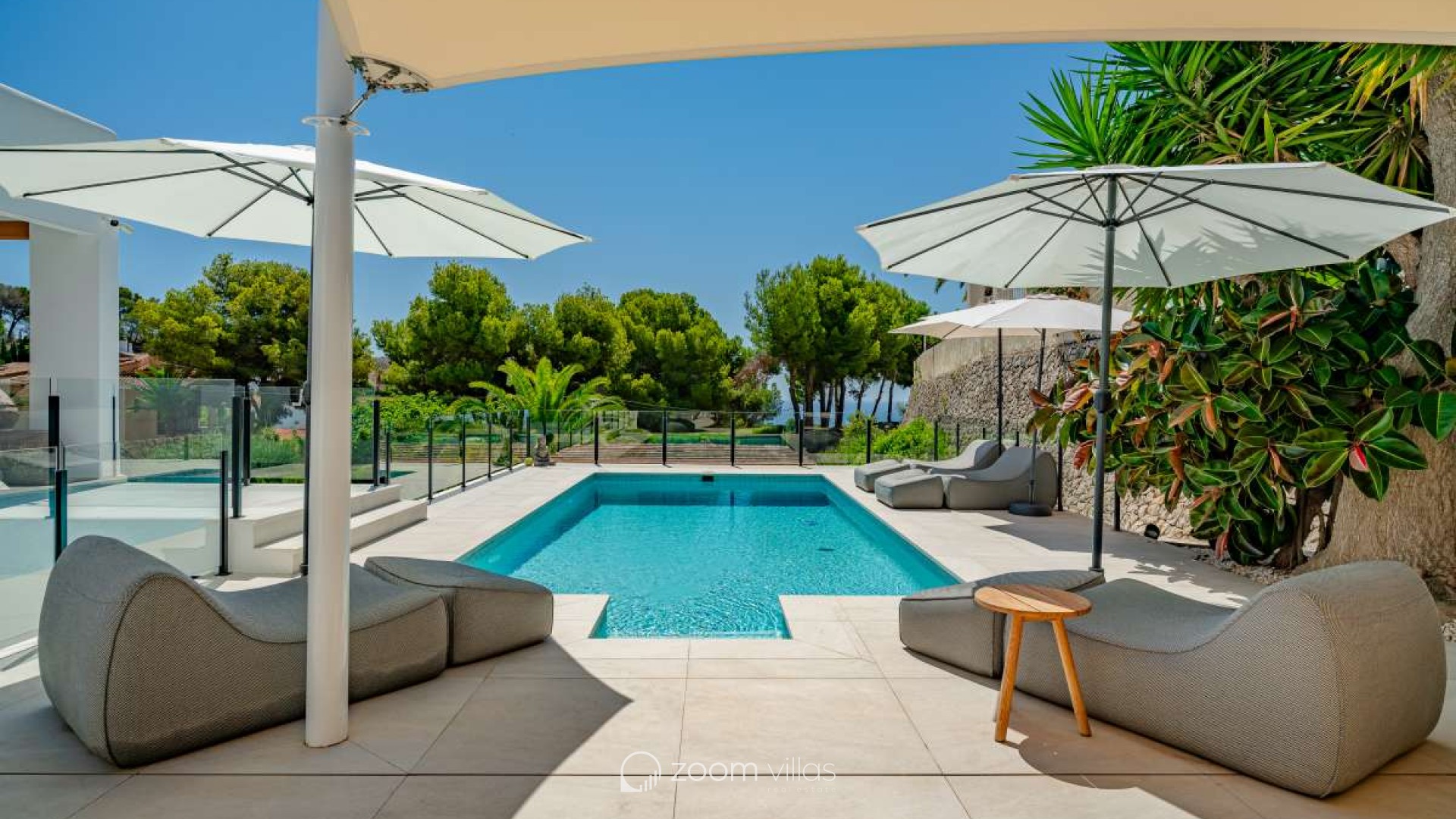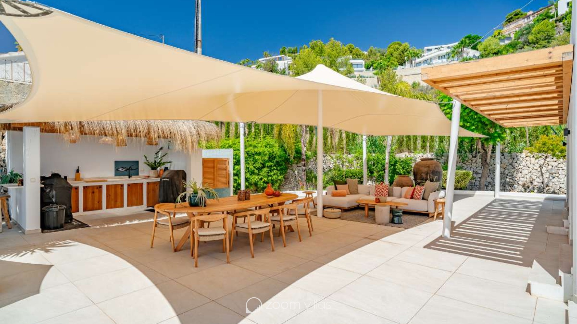 One of the villa's main attractions is the large pool with a chill-out area, sofas, and a large summer kitchen from which you can enjoy magnificent sunsets.