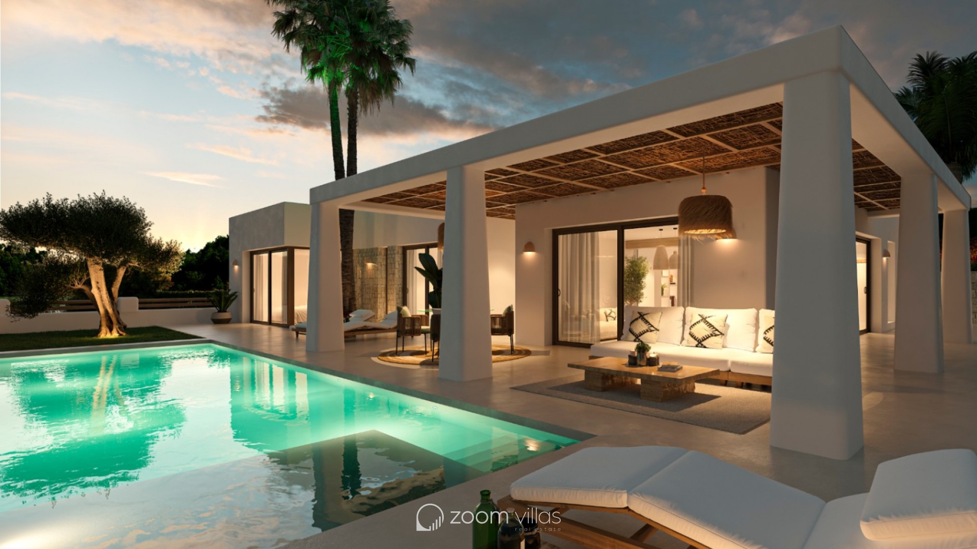 The spacious open living-dining room seamlessly connects to the fully equipped kitchen and offers direct access to the west-facing terrace and the infinity pool. Additionally, the property features a separate laundry room and a guest toilet.In the sleeping area, there are two double bedrooms sharing a bathroom, and a master bedroom with an en-suite bathroom and a dressing area.