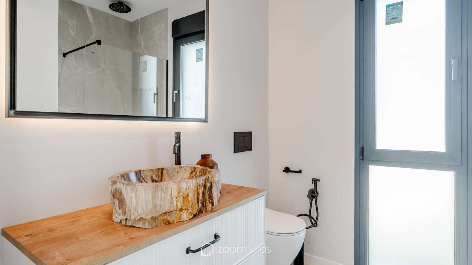 With four bedrooms (two of them en suite) and a guest bathroom, this villa is designed for comfort. The open-plan kitchen blends seamlessly into the living-dining room, a generous, open-plan space with a fully glazed facade that blurs the boundaries with the exterior. Feel how the garden invades the house, and how the water, reflected in it, brings a vital energy to this home. The exteriors are an extension of the interior luxury. A porch with an outdoor dining area is perfect for any time of day, complemented by a barbecue and a spacious pool terrace. But the real star is the rooftop: a privileged space with 360-degree sea views and absolute privacy for sunbathing. Here you can create your personal oasis: a jacuzzi, a summer kitchen, or a chill-out area with the best views.