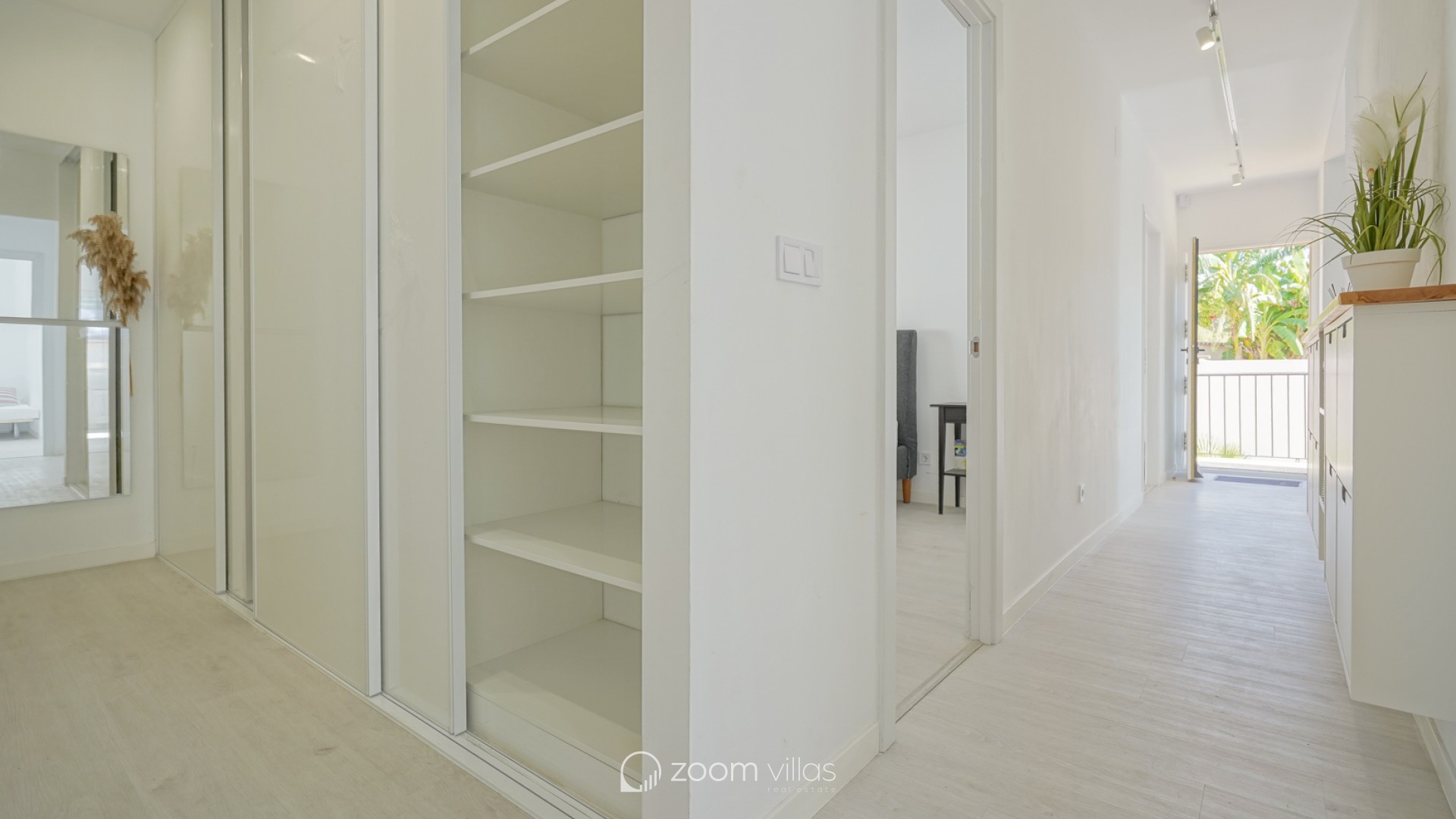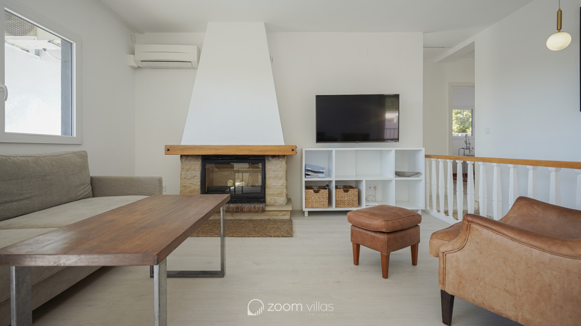 The upper floor features a modern living and dining room with fireplace, a fully equipped kitchen, two spacious bedrooms, a dressing room and a luxurious bathroom with double shower and bathtub. The living room opens onto a large south-facing terrace with views towards the Peñon de Ifach. The kitchen opens onto a covered terrace, ideal for outdoor dining all year round.