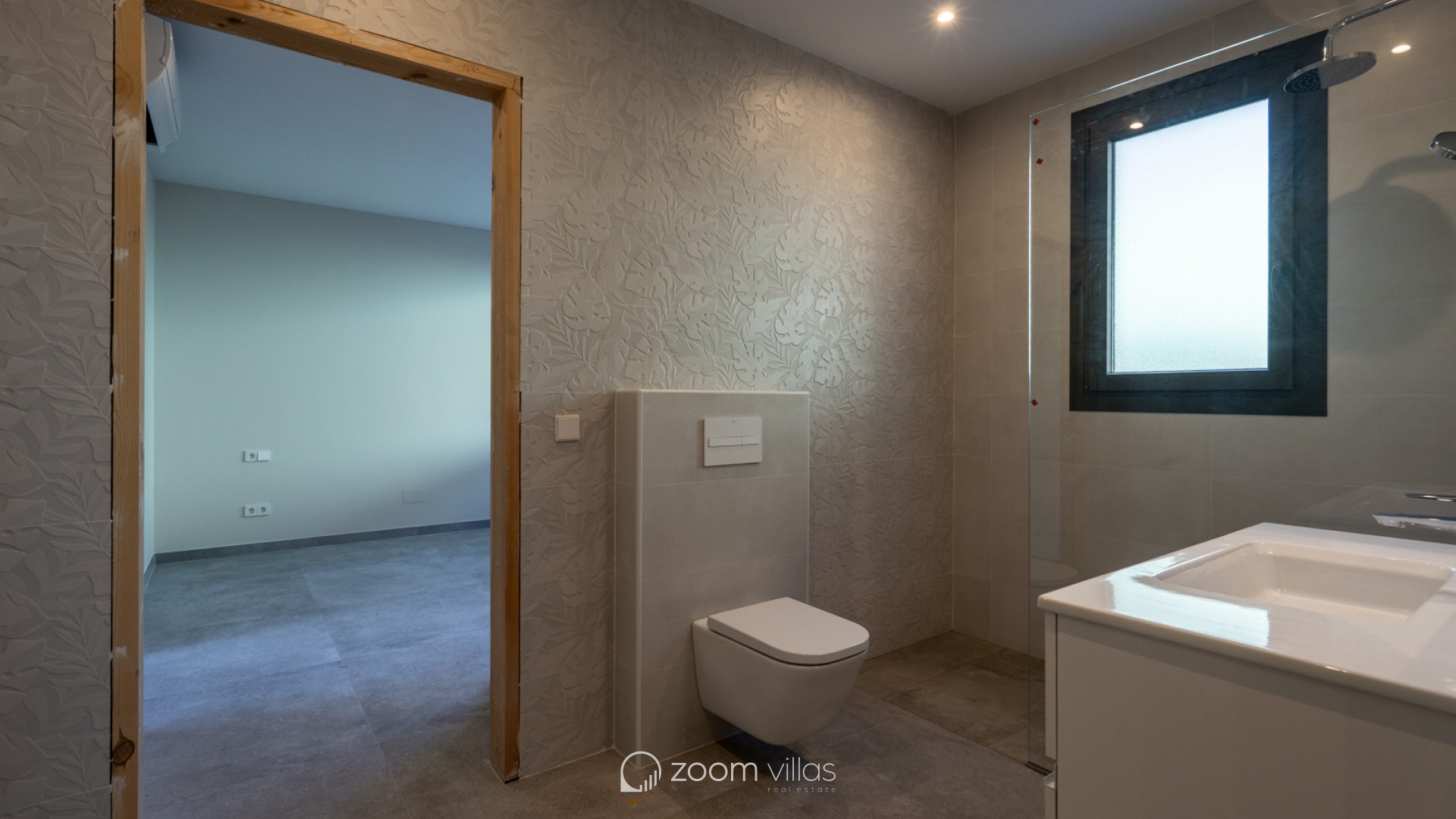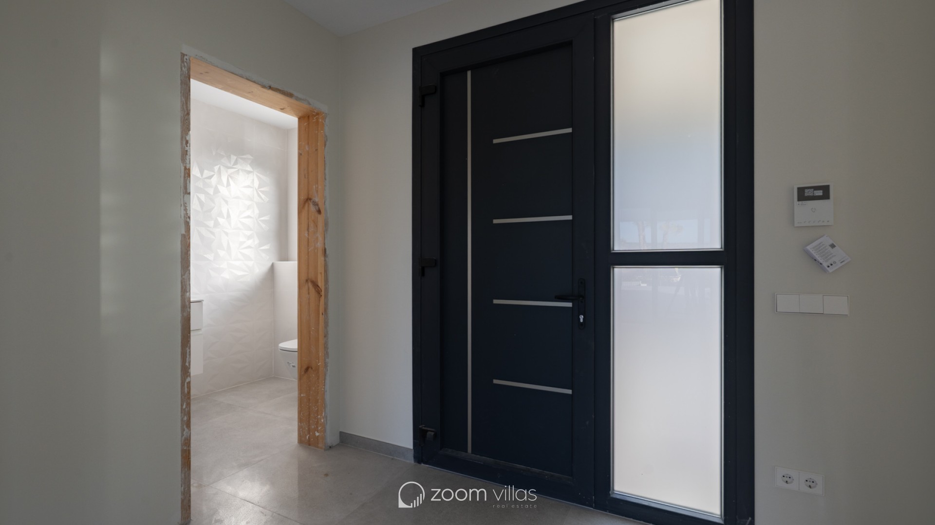 Upon entering, a stylish hall with guest toilet leads to the spacious living-dining room, where large windows provide abundant natural light and a beautiful panorama. Adjacent is a modern, fully equipped kitchen with a practical laundry room that offers direct access to the outside. Sliding windows in the living room open onto the inviting terrace with swimming pool, ideal for enjoying the view and the Mediterranean climate. The sleeping area comprises three bedrooms, including an elegant master bedroom with en-suite bathroom and direct access to the terrace, while the two other bedrooms share a second bathroom. The outdoor area is an oasis of tranquillity with a covered terrace, a pergola, a spacious sun terrace and a low-maintenance Mediterranean garden. With two parking spaces on site and a location just 2 km from the historic centre and 3 km from the coast, this villa combines luxury, privacy and excellent accessibility.