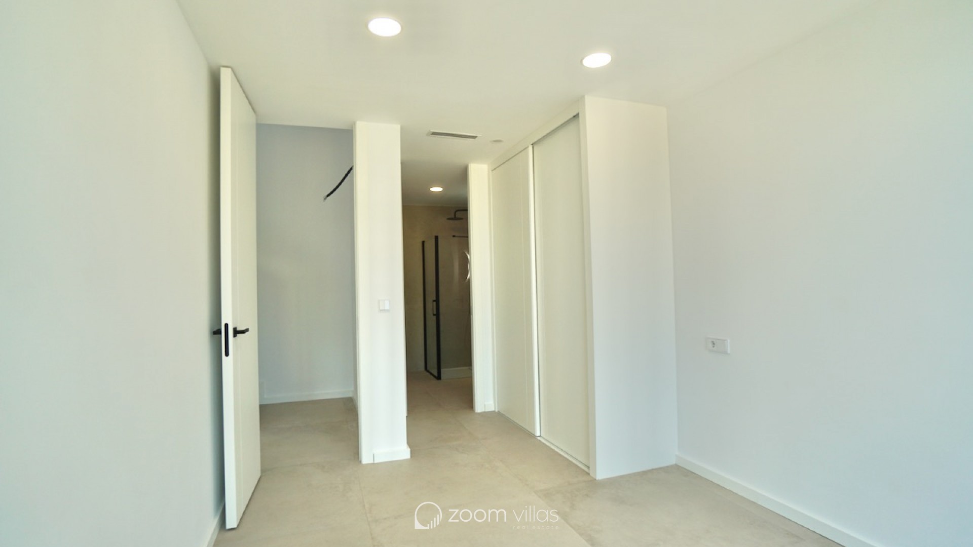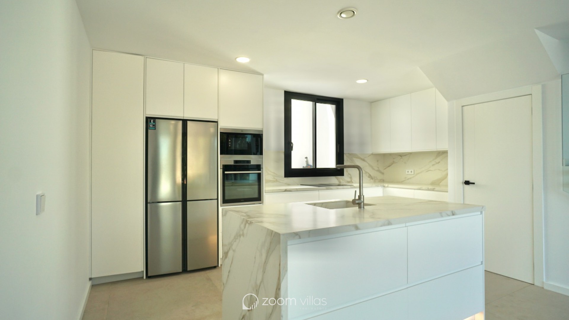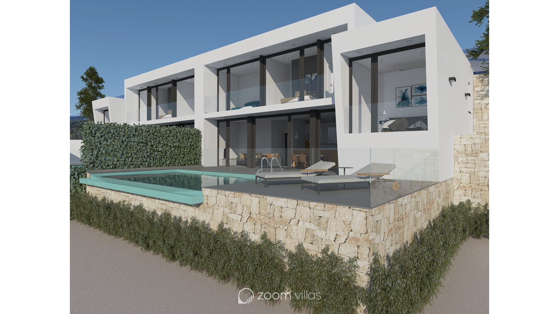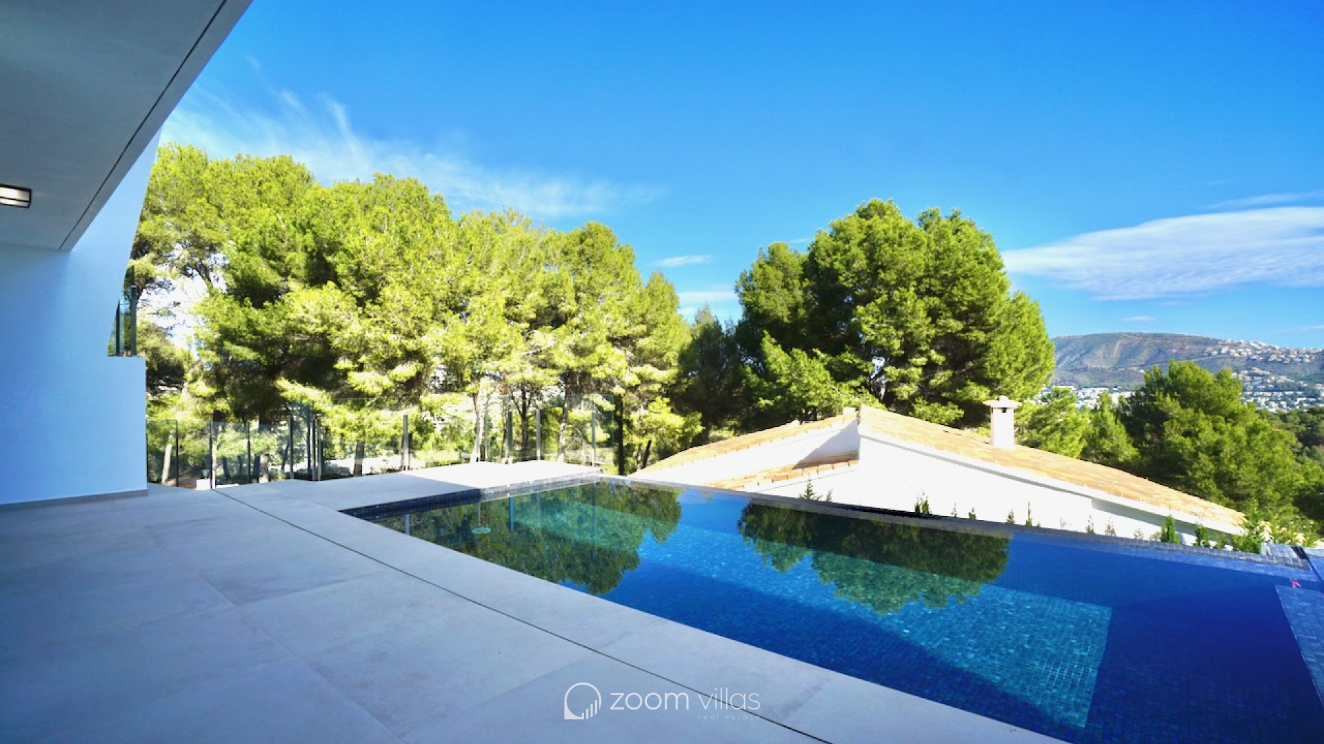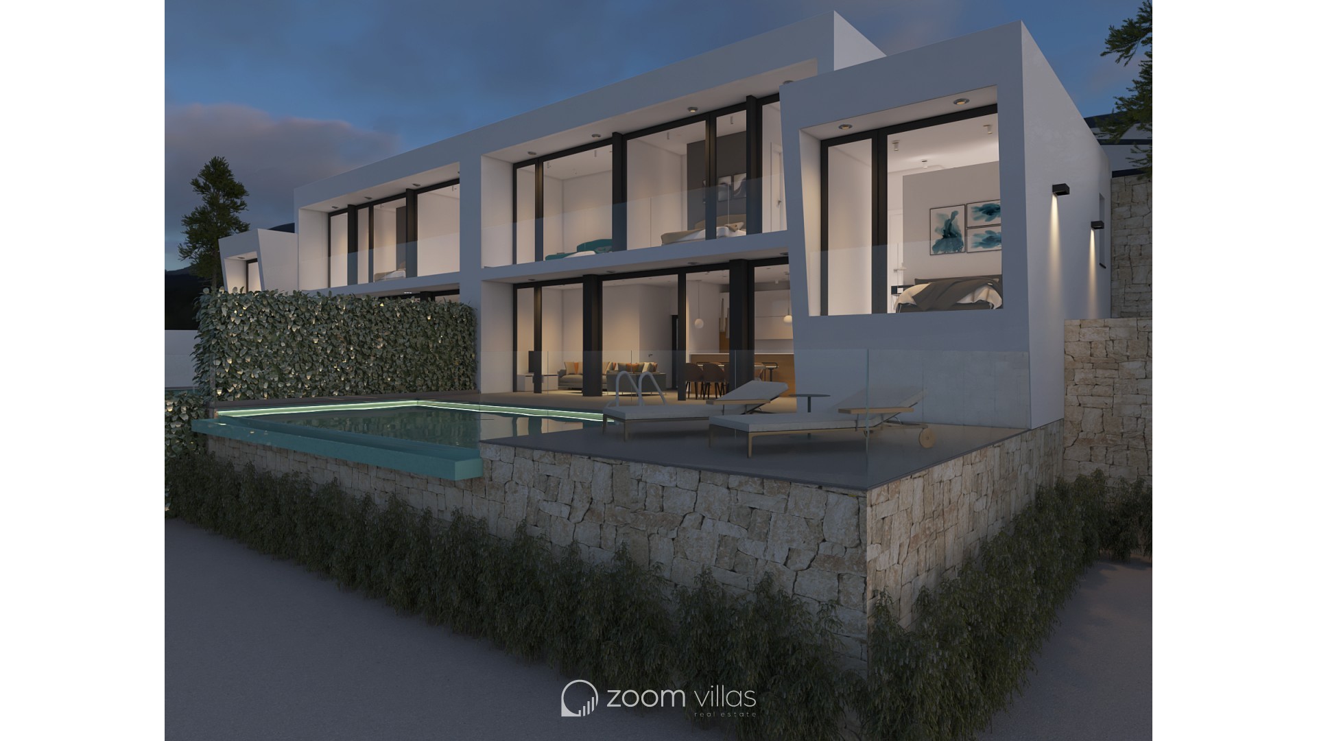 Stylish semi-detached villa for sale in Benimeit, Moraira. In a quiet circular street with footpaths we find this beautiful semi-detached house with private pool. Right in the quiet of a new neighbourhood in Benimeit and less than 10 minutes' drive from Moraira as well as Teulada. So you can choose where to go for shopping as you are in between! Just under 2 km away you will find restaurants, a supermarket and a bar and 4km from the property is the beach. Entry is via the electric gate with intercom that can also be managed via a remote app. The property offers parking for 2 cars under a modern shade tarpaulin. Steps down lead to the villa's main entrance. Here you will also find a convenient storage room and space to place beautiful plants such as the banana plant. This can add a green touch to the new home! In the entrance hall, we find an extra-large guest toilet with sink and space to store things. Then we enter the very bright living room with as many as 3 windows opening onto the swimming pool and terrace and the surrounding garden! Here one already enjoys the sun from early morning and the views towards the mountains. One can even see a bit of the sea! Back in the living room, we finds an open-plan kitchen with an island. All appliances are installed and of the highest quality! The marble top completes it all! A door in the kitchen leads to another extra large cupboard for storing food items, for example. The staircase with glass railing leads us to the first bedroom. Spacious and bright with fitted wardrobe and ensuite shower room! The same fantastic tiled floor is throughout the house and the window and door finishing is the same everywhere. This offers unity and tranquillity! The views from this bedroom are also very nice. A few stairs up we find 2 more bedrooms, also with ensuite bathrooms. The master bedroom has a walk-in closet and an extra large bathroom with double washbasin, separate bathtub and shower! The rooms on this floor share a balcony with views towards the sea. Last but not least, the house stands on a plot of 508m2, the garden can be laid out to your own taste. The private pool is infinity and there is a solar shower to rinse off after a great swim! There is centralised air conditioning throughout the whole house. One can set a temperature per zone. There are also 12 solar panels generating 5kw, located on the flat roof of the villa. And also pre installation for a heat pump for underfloor heating throughout the property and a ventilation system. The windows have black profiles and enjoy electric shutters. There is possibility to connect to fibre optic internet. Key features: Semi-detached villa of 2024 Private infinity pool Quiet location but not far from the village and beach Sea glimpse3 bedrooms 3 bathrooms Carport for 2 cars Centralised air conditioning, pre-installation for heat pump and underfloor heatingSolar panelsElectric shutters Do not wait any longer to make your appointment and come and see this beautiful 2024 new build with your own eyes now!