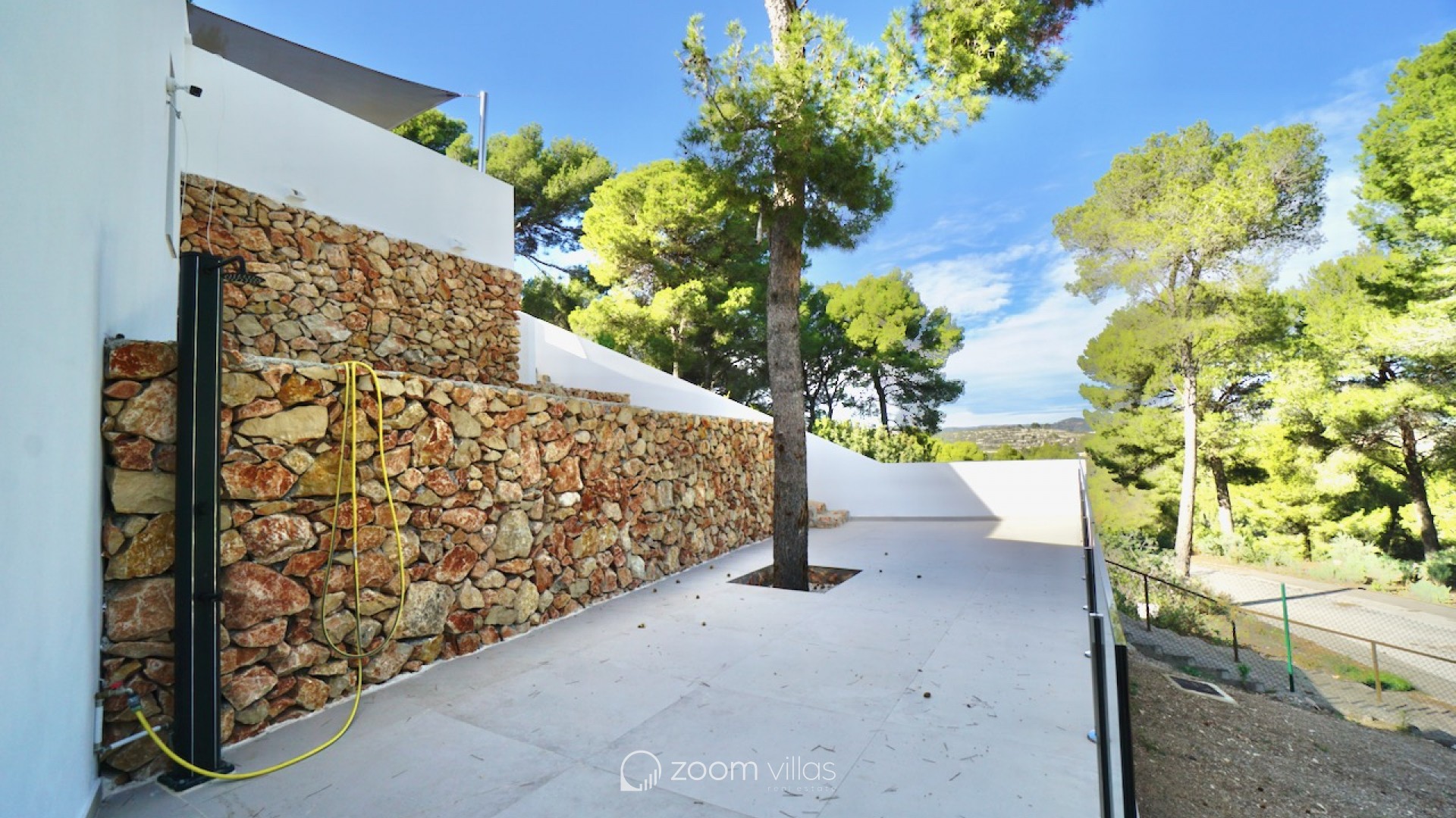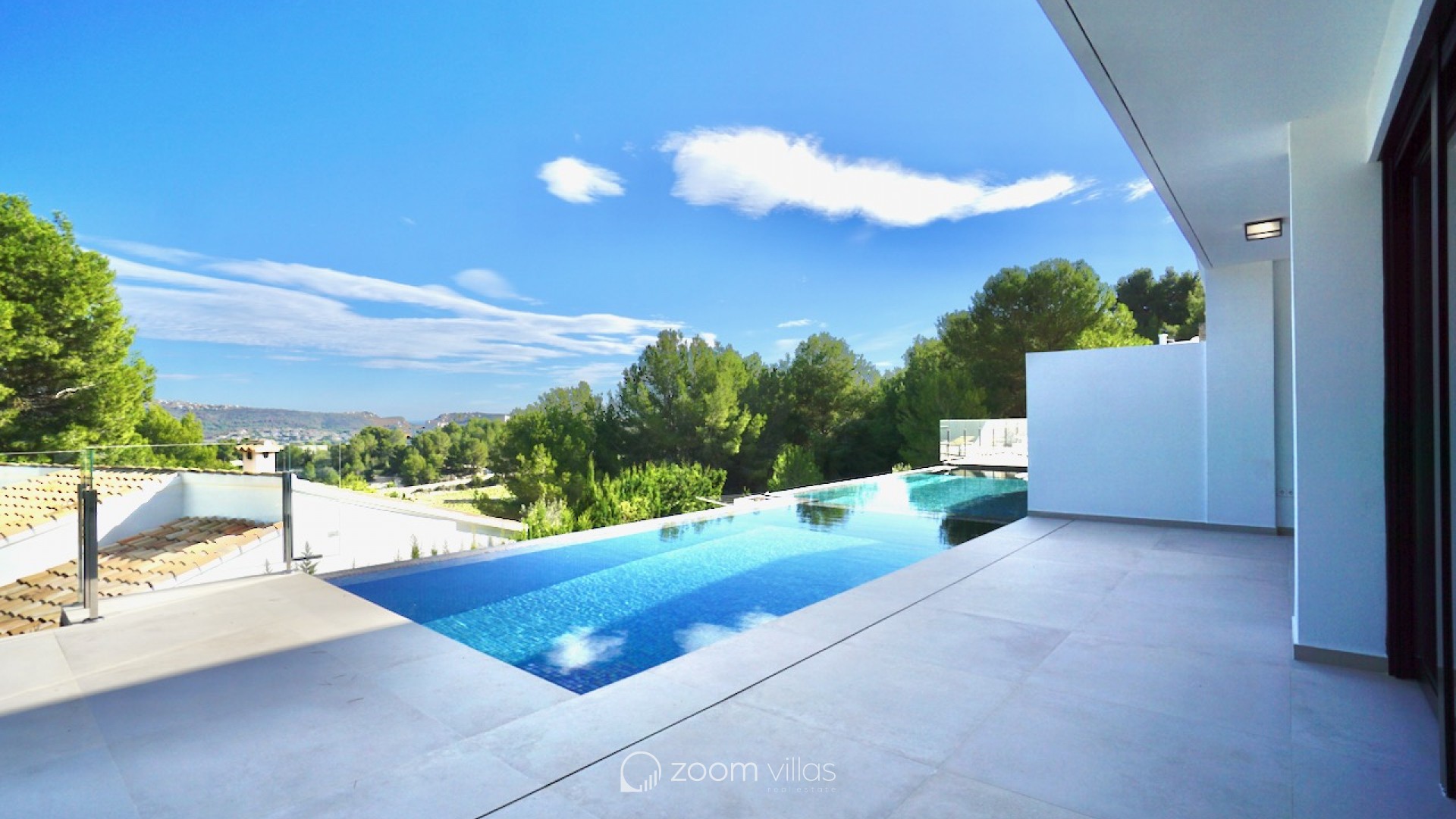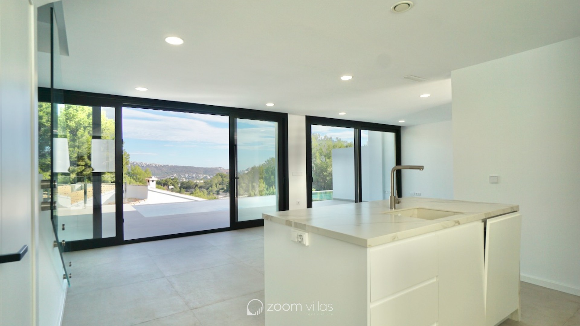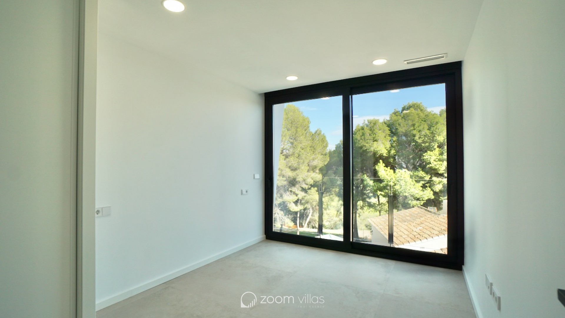 Stylish semi-detached villa for sale in Benimeit, Moraira. In a quiet circular street with footpaths we find this beautiful semi-detached house with private pool. Right in the quiet of a new neighbourhood in Benimeit and less than 10 minutes' drive from Moraira as well as Teulada. So you can choose where to go for shopping as you are in between! Just under 2 km away you will find restaurants, a supermarket and a bar and 4km from the property is the beach. Entry is via the electric gate with intercom that can also be managed via a remote app. The property offers parking for 2 cars under a modern shade tarpaulin. Steps down lead to the villa's main entrance. Here you will also find a convenient storage room and space to place beautiful plants such as the banana plant. This can add a green touch to the new home! In the entrance hall, we find an extra-large guest toilet with sink and space to store things. Then we enter the very bright living room with as many as 3 windows opening onto the swimming pool and terrace and the surrounding garden! Here one already enjoys the sun from early morning and the views towards the mountains. One can even see a bit of the sea! Back in the living room, we finds an open-plan kitchen with an island. All appliances are installed and of the highest quality! The marble top completes it all! A door in the kitchen leads to another extra large cupboard for storing food items, for example. The staircase with glass railing leads us to the first bedroom. Spacious and bright with fitted wardrobe and ensuite shower room! The same fantastic tiled floor is throughout the house and the window and door finishing is the same everywhere. This offers unity and tranquillity! The views from this bedroom are also very nice. A few stairs up we find 2 more bedrooms, also with ensuite bathrooms. The master bedroom has a walk-in closet and an extra large bathroom with double washbasin, separate bathtub and shower! The rooms on this floor share a balcony with views towards the sea. Last but not least, the house stands on a plot of 508m2, the garden can be laid out to your own taste. The private pool is infinity and there is a solar shower to rinse off after a great swim! There is centralised air conditioning throughout the whole house. One can set a temperature per zone. There are also 12 solar panels generating 5kw, located on the flat roof of the villa. And also pre installation for a heat pump for underfloor heating throughout the property and a ventilation system. The windows have black profiles and enjoy electric shutters. There is possibility to connect to fibre optic internet. Key features: Semi-detached villa of 2024 Private infinity pool Quiet location but not far from the village and beach Sea glimpse3 bedrooms 3 bathrooms Carport for 2 cars Centralised air conditioning, pre-installation for heat pump and underfloor heatingSolar panelsElectric shutters Do not wait any longer to make your appointment and come and see this beautiful 2024 new build with your own eyes now!