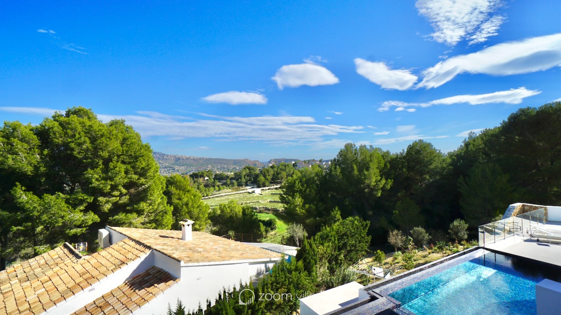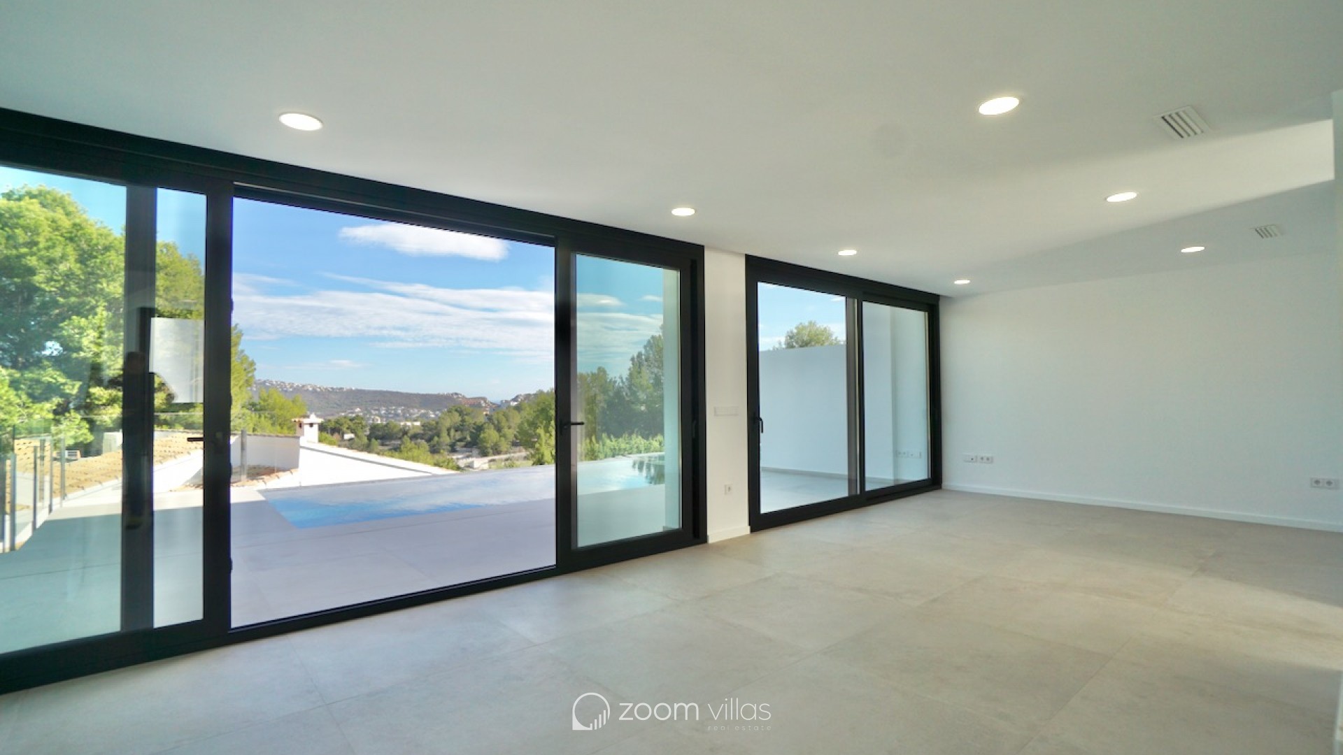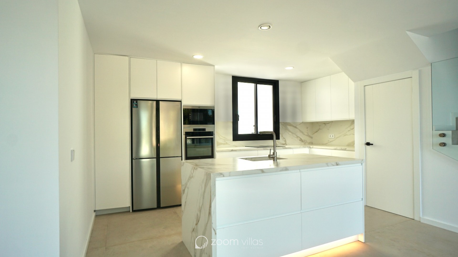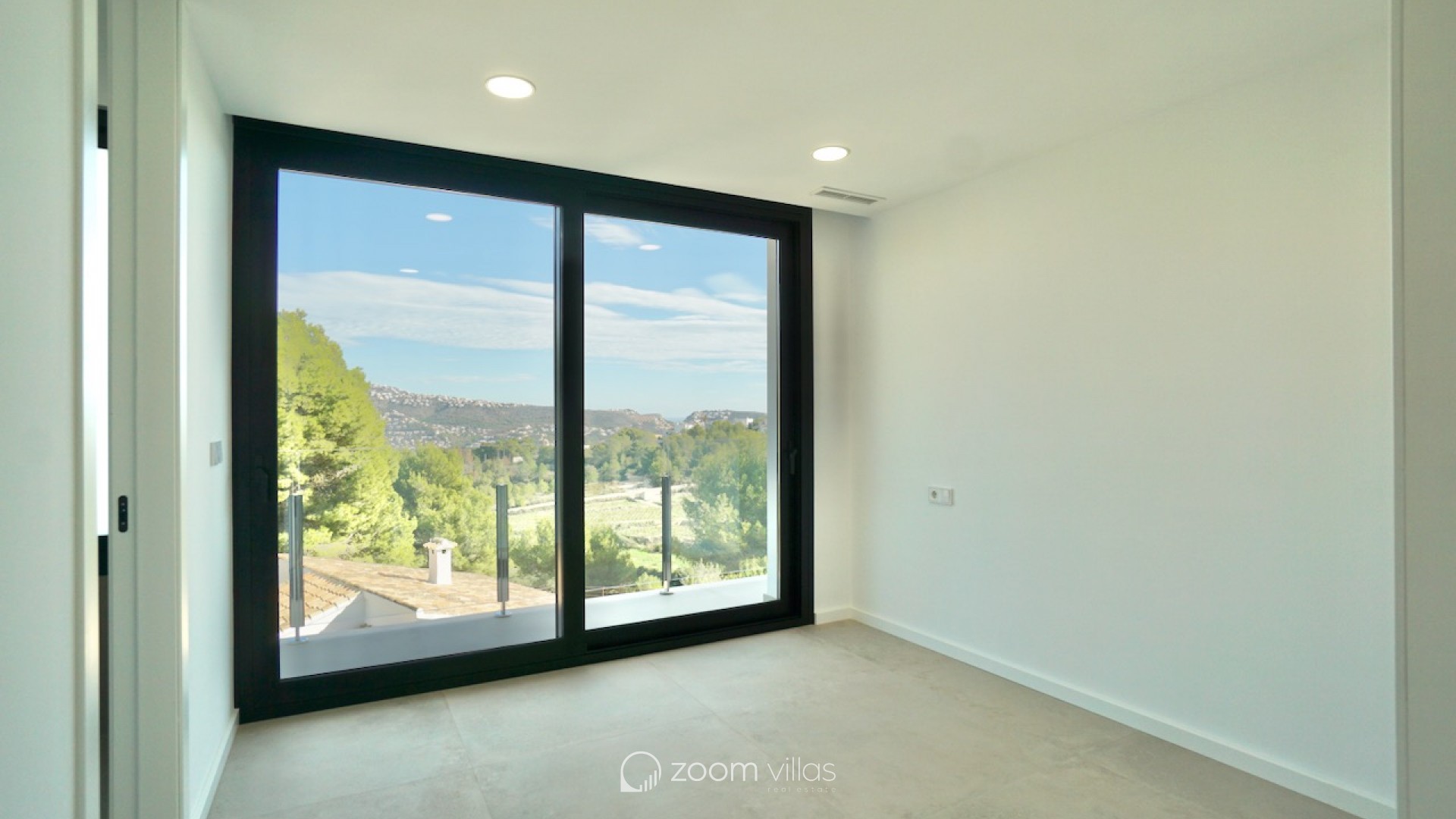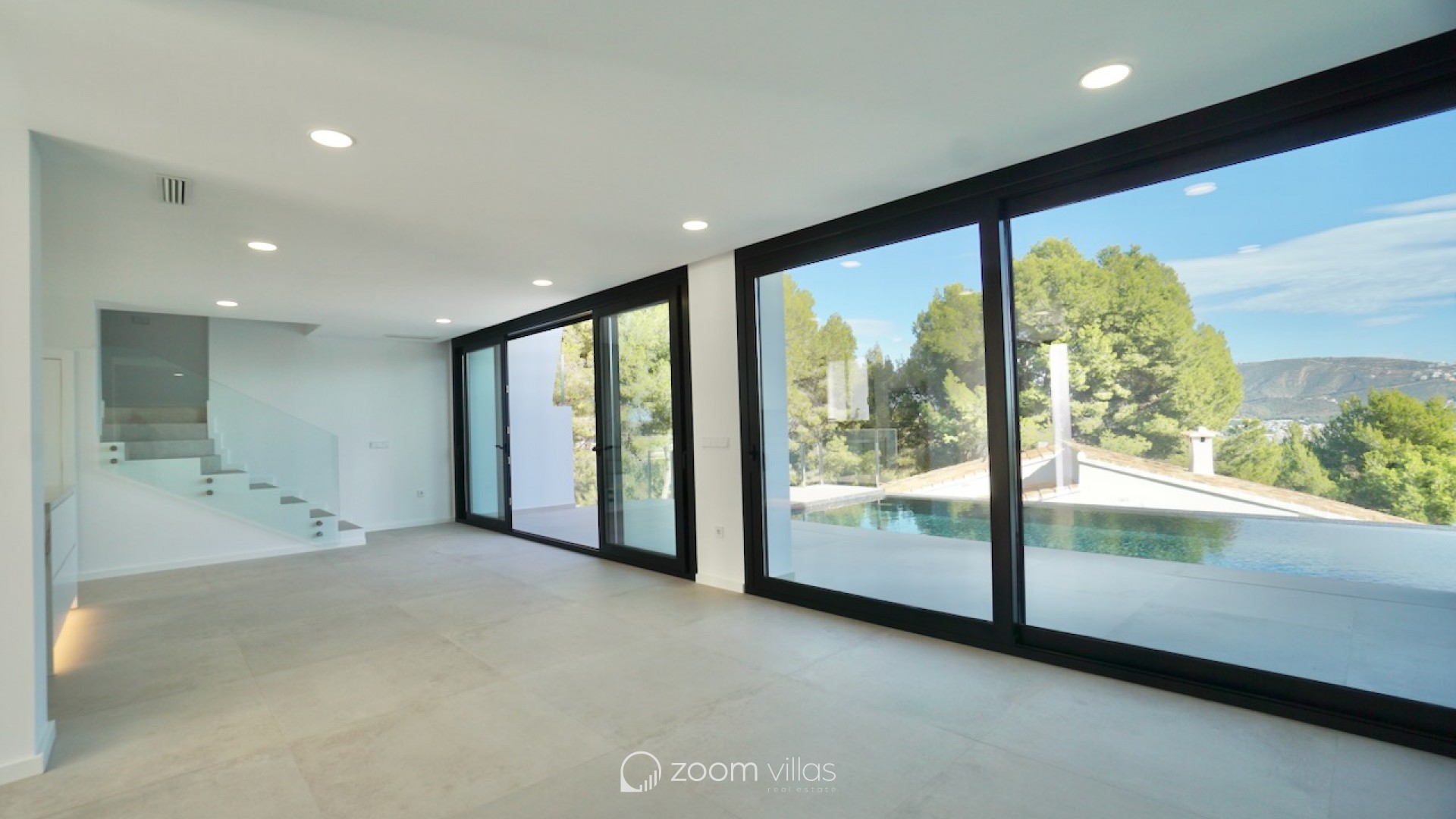 Stylish semi-detached villa for sale in Benimeit, Moraira. In a quiet circular street with footpaths we find this beautiful semi-detached house with private pool. Right in the quiet of a new neighbourhood in Benimeit and less than 10 minutes' drive from Moraira as well as Teulada. So you can choose where to go for shopping as you are in between! Just under 2 km away you will find restaurants, a supermarket and a bar and 4km from the property is the beach. Entry is via the electric gate with intercom that can also be managed via a remote app. The property offers parking for 2 cars under a modern shade tarpaulin. Steps down lead to the villa's main entrance. Here you will also find a convenient storage room and space to place beautiful plants such as the banana plant. This can add a green touch to the new home! In the entrance hall, we find an extra-large guest toilet with sink and space to store things. Then we enter the very bright living room with as many as 3 windows opening onto the swimming pool and terrace and the surrounding garden! Here one already enjoys the sun from early morning and the views towards the mountains. One can even see a bit of the sea! Back in the living room, we finds an open-plan kitchen with an island. All appliances are installed and of the highest quality! The marble top completes it all! A door in the kitchen leads to another extra large cupboard for storing food items, for example. The staircase with glass railing leads us to the first bedroom. Spacious and bright with fitted wardrobe and ensuite shower room! The same fantastic tiled floor is throughout the house and the window and door finishing is the same everywhere. This offers unity and tranquillity! The views from this bedroom are also very nice. A few stairs up we find 2 more bedrooms, also with ensuite bathrooms. The master bedroom has a walk-in closet and an extra large bathroom with double washbasin, separate bathtub and shower! The rooms on this floor share a balcony with views towards the sea. Last but not least, the house stands on a plot of 508m2, the garden can be laid out to your own taste. The private pool is infinity and there is a solar shower to rinse off after a great swim! There is centralised air conditioning throughout the whole house. One can set a temperature per zone. There are also 12 solar panels generating 5kw, located on the flat roof of the villa. And also pre installation for a heat pump for underfloor heating throughout the property and a ventilation system. The windows have black profiles and enjoy electric shutters. There is possibility to connect to fibre optic internet. Key features: Semi-detached villa of 2024 Private infinity pool Quiet location but not far from the village and beach Sea glimpse3 bedrooms 3 bathrooms Carport for 2 cars Centralised air conditioning, pre-installation for heat pump and underfloor heatingSolar panelsElectric shutters Do not wait any longer to make your appointment and come and see this beautiful 2024 new build with your own eyes now!