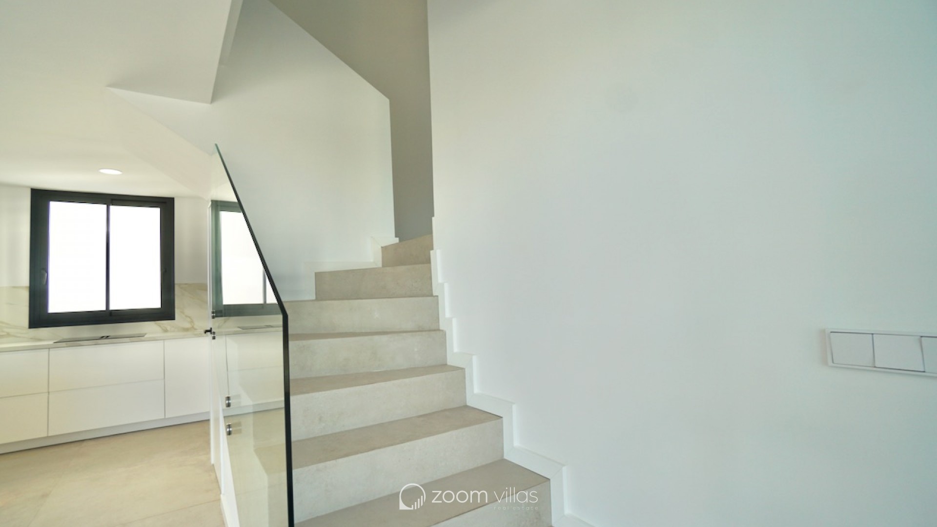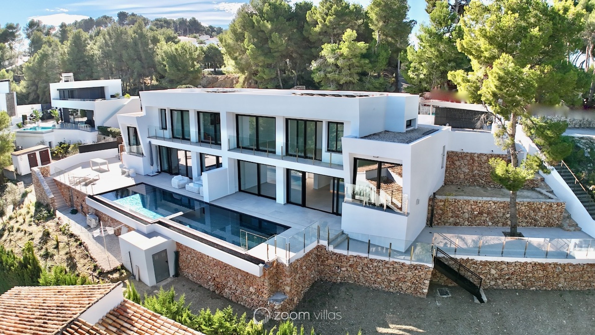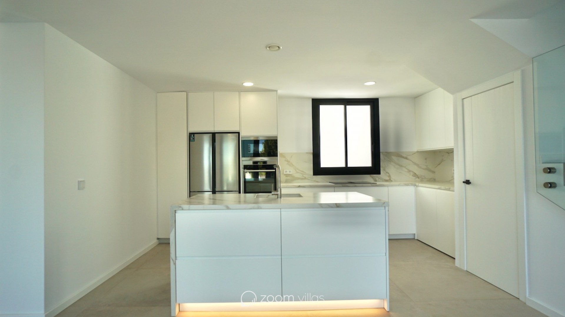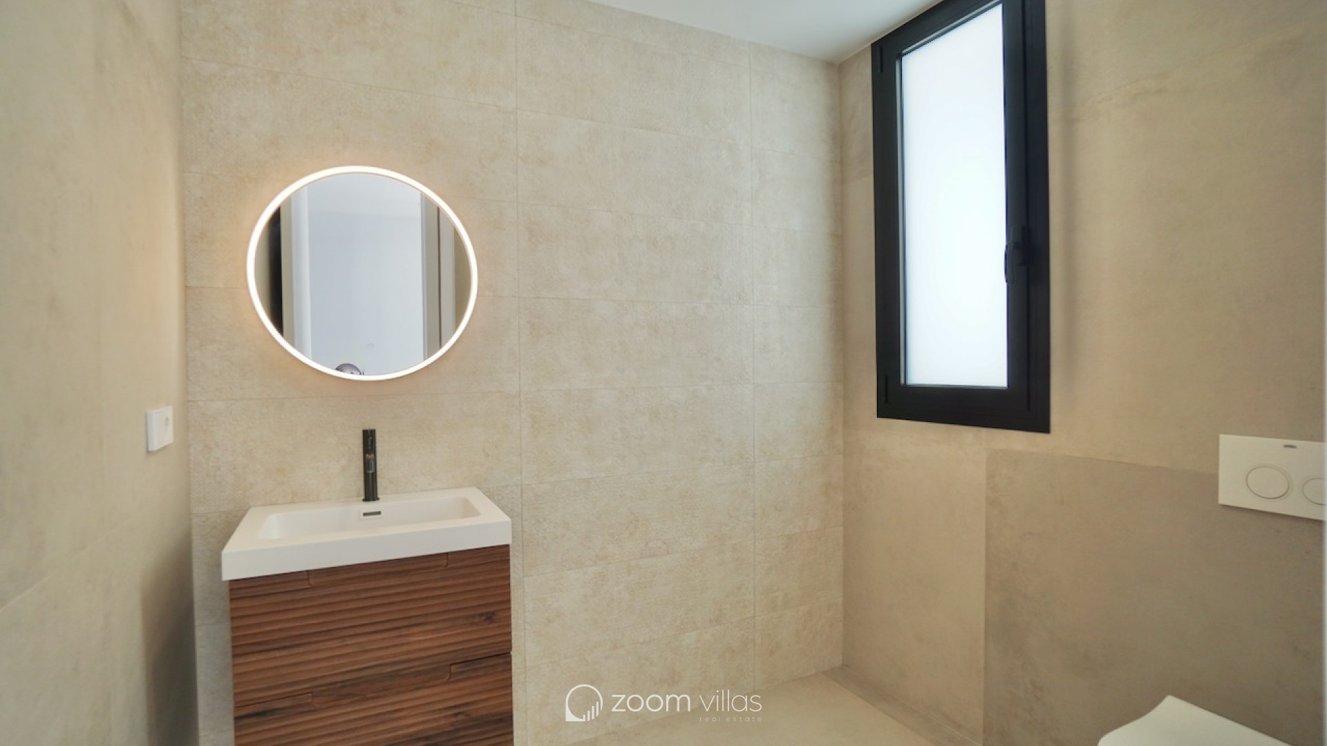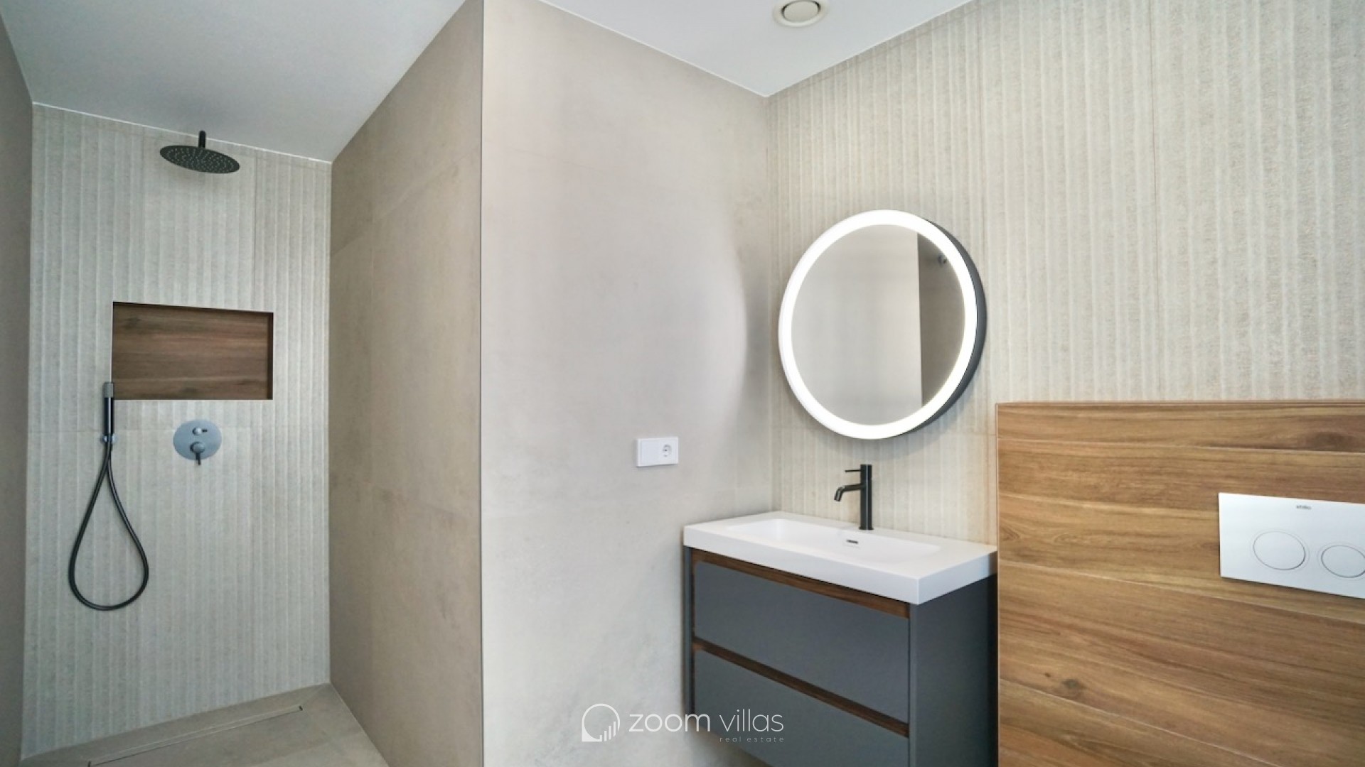 Stylish semi-detached villa for sale in Benimeit, Moraira. In a quiet circular street with footpaths we find this beautiful semi-detached house with private pool. Right in the quiet of a new neighbourhood in Benimeit and less than 10 minutes' drive from Moraira as well as Teulada. So you can choose where to go for shopping as you are in between! Just under 2 km away you will find restaurants, a supermarket and a bar and 4km from the property is the beach. Entry is via the electric gate with intercom that can also be managed via a remote app. The property offers parking for 2 cars under a modern shade tarpaulin. Steps down lead to the villa's main entrance. Here you will also find a convenient storage room and space to place beautiful plants such as the banana plant. This can add a green touch to the new home! In the entrance hall, we find an extra-large guest toilet with sink and space to store things. Then we enter the very bright living room with as many as 3 windows opening onto the swimming pool and terrace and the surrounding garden! Here one already enjoys the sun from early morning and the views towards the mountains. One can even see a bit of the sea! Back in the living room, we finds an open-plan kitchen with an island. All appliances are installed and of the highest quality! The marble top completes it all! A door in the kitchen leads to another extra large cupboard for storing food items, for example. The staircase with glass railing leads us to the first bedroom. Spacious and bright with fitted wardrobe and ensuite shower room! The same fantastic tiled floor is throughout the house and the window and door finishing is the same everywhere. This offers unity and tranquillity! The views from this bedroom are also very nice. A few stairs up we find 2 more bedrooms, also with ensuite bathrooms. The master bedroom has a walk-in closet and an extra large bathroom with double washbasin, separate bathtub and shower! The rooms on this floor share a balcony with views towards the sea. Last but not least, the house stands on a plot of 508m2, the garden can be laid out to your own taste. The private pool is infinity and there is a solar shower to rinse off after a great swim! There is centralised air conditioning throughout the whole house. One can set a temperature per zone. There are also 12 solar panels generating 5kw, located on the flat roof of the villa. And also pre installation for a heat pump for underfloor heating throughout the property and a ventilation system. The windows have black profiles and enjoy electric shutters. There is possibility to connect to fibre optic internet. Key features: Semi-detached villa of 2024 Private infinity pool Quiet location but not far from the village and beach Sea glimpse3 bedrooms 3 bathrooms Carport for 2 cars Centralised air conditioning, pre-installation for heat pump and underfloor heatingSolar panelsElectric shutters Do not wait any longer to make your appointment and come and see this beautiful 2024 new build with your own eyes now!