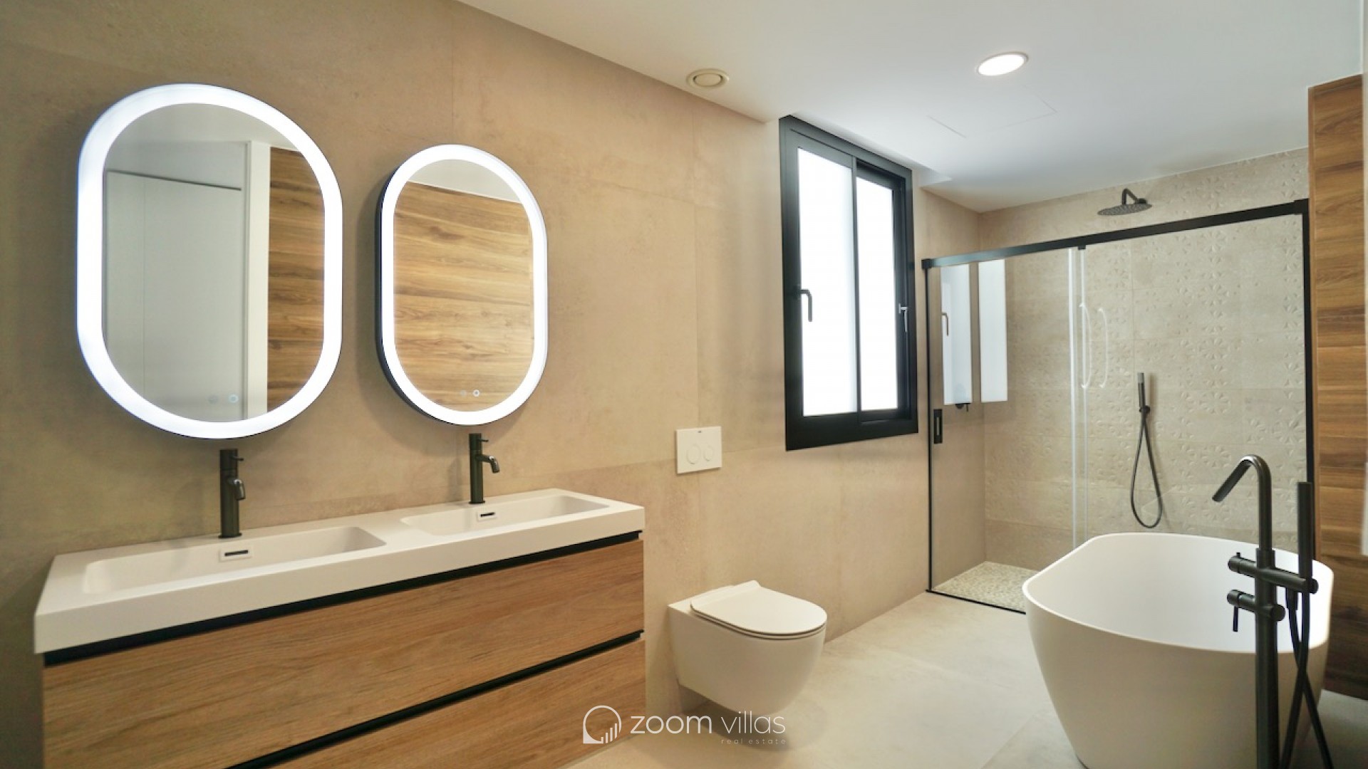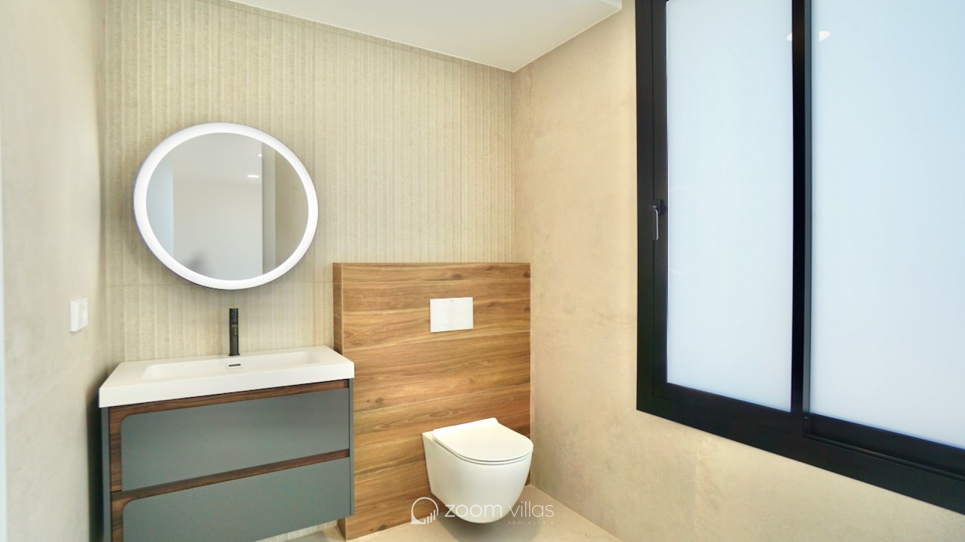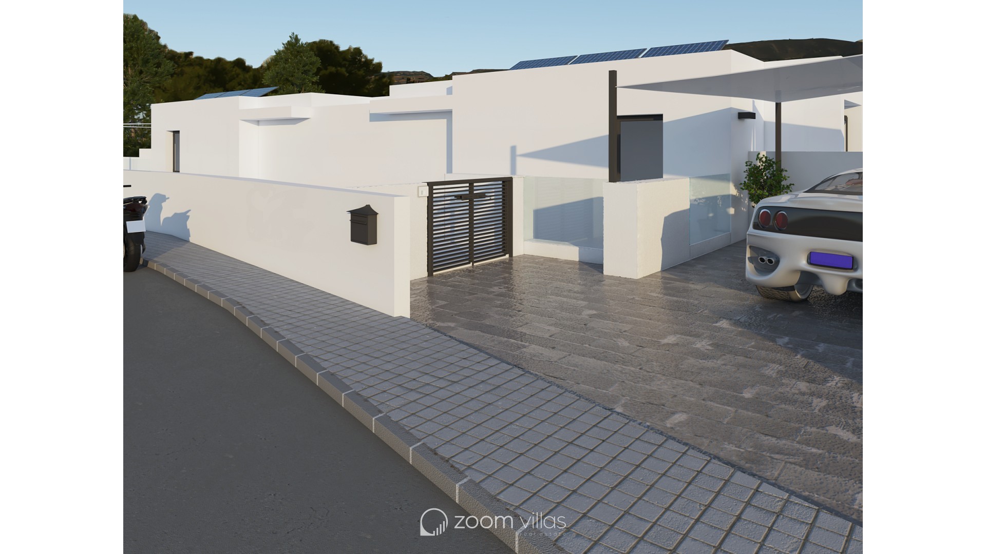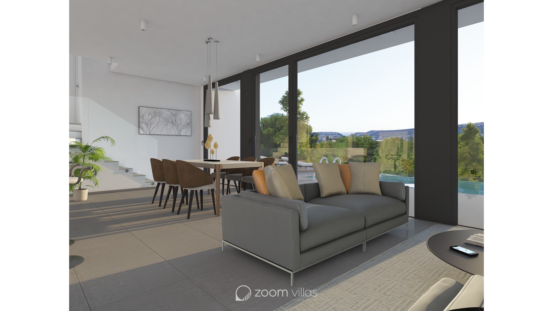Stylish semi-detached villa for sale in Benimeit, Moraira. In a quiet circular street with footpaths we find this beautiful semi-detached house with private pool. Right in the quiet of a new neighbourhood in Benimeit and less than 10 minutes' drive from Moraira as well as Teulada. So you can choose where to go for shopping as you are in between! Just under 2 km away you will find restaurants, a supermarket and a bar and 4km from the property is the beach. Entry is via the electric gate with intercom that can also be managed via a remote app. The property offers parking for 2 cars under a modern shade tarpaulin. Steps down lead to the villa's main entrance. Here you will also find a convenient storage room and space to place beautiful plants such as the banana plant. This can add a green touch to the new home! In the entrance hall, we find an extra-large guest toilet with sink and space to store things. Then we enter the very bright living room with as many as 3 windows opening onto the swimming pool and terrace and the surrounding garden! Here one already enjoys the sun from early morning and the views towards the mountains. One can even see a bit of the sea! Back in the living room, we finds an open-plan kitchen with an island. All appliances are installed and of the highest quality! The marble top completes it all! A door in the kitchen leads to another extra large cupboard for storing food items, for example. The staircase with glass railing leads us to the first bedroom. Spacious and bright with fitted wardrobe and ensuite shower room! The same fantastic tiled floor is throughout the house and the window and door finishing is the same everywhere. This offers unity and tranquillity! The views from this bedroom are also very nice. A few stairs up we find 2 more bedrooms, also with ensuite bathrooms. The master bedroom has a walk-in closet and an extra large bathroom with double washbasin, separate bathtub and shower! The rooms on this floor share a balcony with views towards the sea. Last but not least, the house stands on a plot of 508m2, the garden can be laid out to your own taste. The private pool is infinity and there is a solar shower to rinse off after a great swim! There is centralised air conditioning throughout the whole house. One can set a temperature per zone. There are also 12 solar panels generating 5kw, located on the flat roof of the villa. And also pre installation for a heat pump for underfloor heating throughout the property and a ventilation system. The windows have black profiles and enjoy electric shutters. There is possibility to connect to fibre optic internet. Key features: Semi-detached villa of 2024 Private infinity pool Quiet location but not far from the village and beach Sea glimpse3 bedrooms 3 bathrooms Carport for 2 cars Centralised air conditioning, pre-installation for heat pump and underfloor heatingSolar panelsElectric shutters Do not wait any longer to make your appointment and come and see this beautiful 2024 new build with your own eyes now!