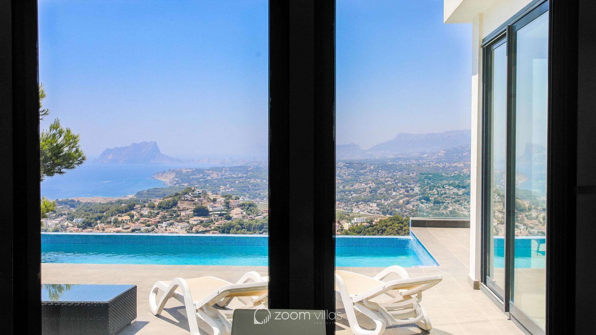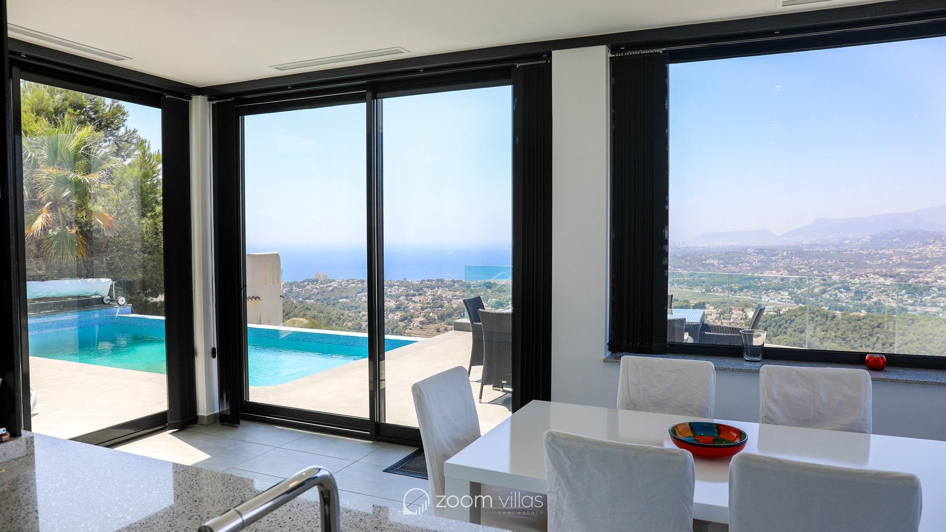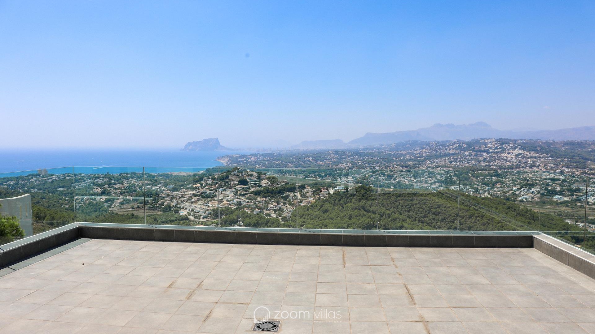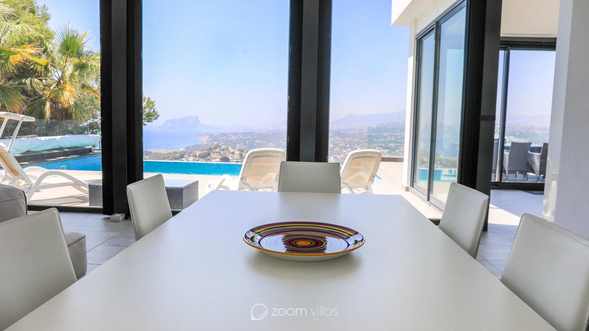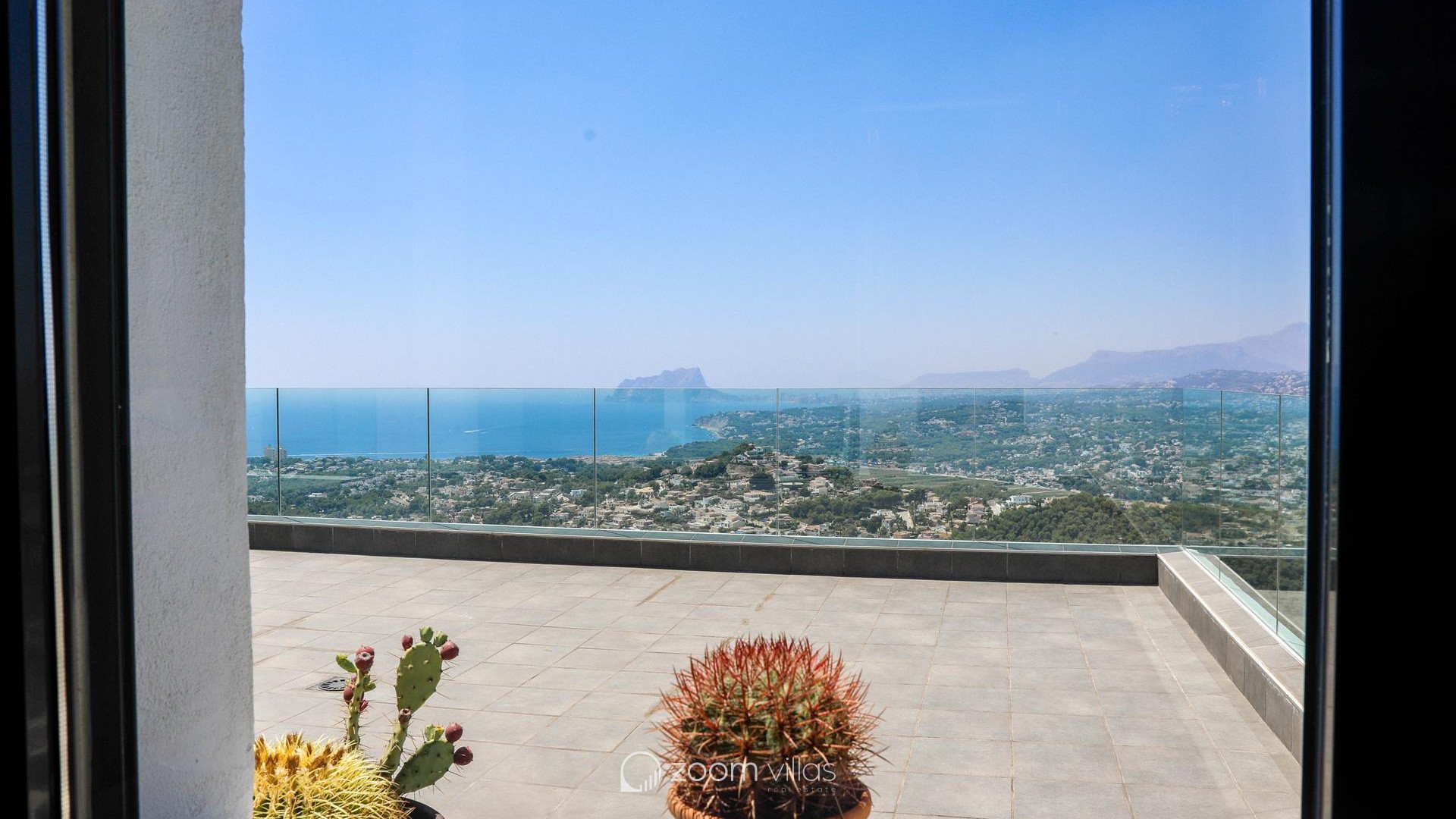 Modern style villa with stunning sea views in the Kalmias residential area of ​​the Cumbre del Sol urbanization located between Jávea and Moraira. It has a total constructed area of ​​430 m2 (200 m2 of main house, 90 m2 of guest apartment and 140 m2 of terraces), all built on a plot of 1025 m2. In total we have 5 double bedrooms all with their private bathroom. Likewise, the villa is equipped with underfloor heating and air conditioning throughout the house. The villa is built on several levels. We access with the car through a wide and comfortable access ramp, accessing the parking area with a covered area and with access to the villa through the upper floor, on the upper floor we have three double bedrooms each with its own bathroom. bathroom and direct access to the outdoor terrace with spectacular views of the sea and the mountains. Through an internal staircase we go down to the main floor of the villa where we have the living room and kitchen in open concept as well as the laundry room and a courtesy toilet, both from the kitchen area and the living room we can access the terrace exterior with private pool. From the terrace we can access the barbecue area that is located on one side of the villa. From this terrace we can skirt the pool and reach the guest apartment which is also accessible via an external staircase directly from the parking area of ​​the villa. The guest apartment enjoys very nice views from the outside terrace and the living room. Through an internal staircase we go up half a floor to access the two double bedrooms and the two bathrooms.  The Kalmias residential area is a development of villas consisting of 189 plots of 750 to 1200M2 located in the cumbre del sol urbanization in Benitachell (Alicante). Almost all the plots enjoy beautiful views of the sea, the Moraira valley with Calpe in the background and the mountains with the Sierra de Bernia in the background, the orientation of the plots can be South and Southwest. Residencial Kalmias is located in the Cumbre del sol urbanization at the south entrance bordering the Jazmines y Lirios residential area. Distances to services: From 1 to 3 km you will find the Dreamsea Mediterranean camp with a bar and restaurant and access to Morach beach, the cala de los tiestos and Cala Llebeig, the Lady Elisabeth international school, the Mercadona supermarket and the equestrian. From 4 to 5 km; the Adelfas shopping center with the Pepe la sal supermarket, hairdresser, maintenance and rental services agency, cafeteria bar, la cumbre restaurant, pharmacy, sports center with paddle tennis, tennis, bar, Mas y Mas supermarket and the center urban Benitachell From 6 to 7 km; the urban center and the beach of Portet de Moraira and the golf course of Jávea. 12 km away is the sandy beach of Jávea