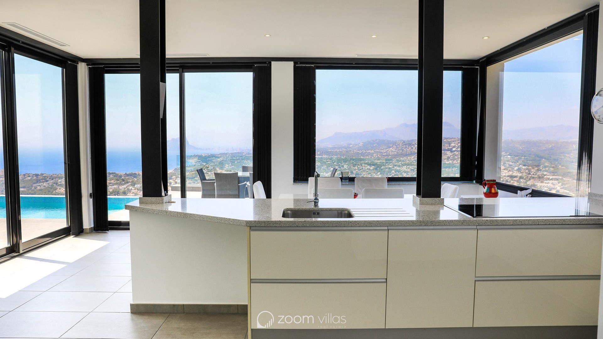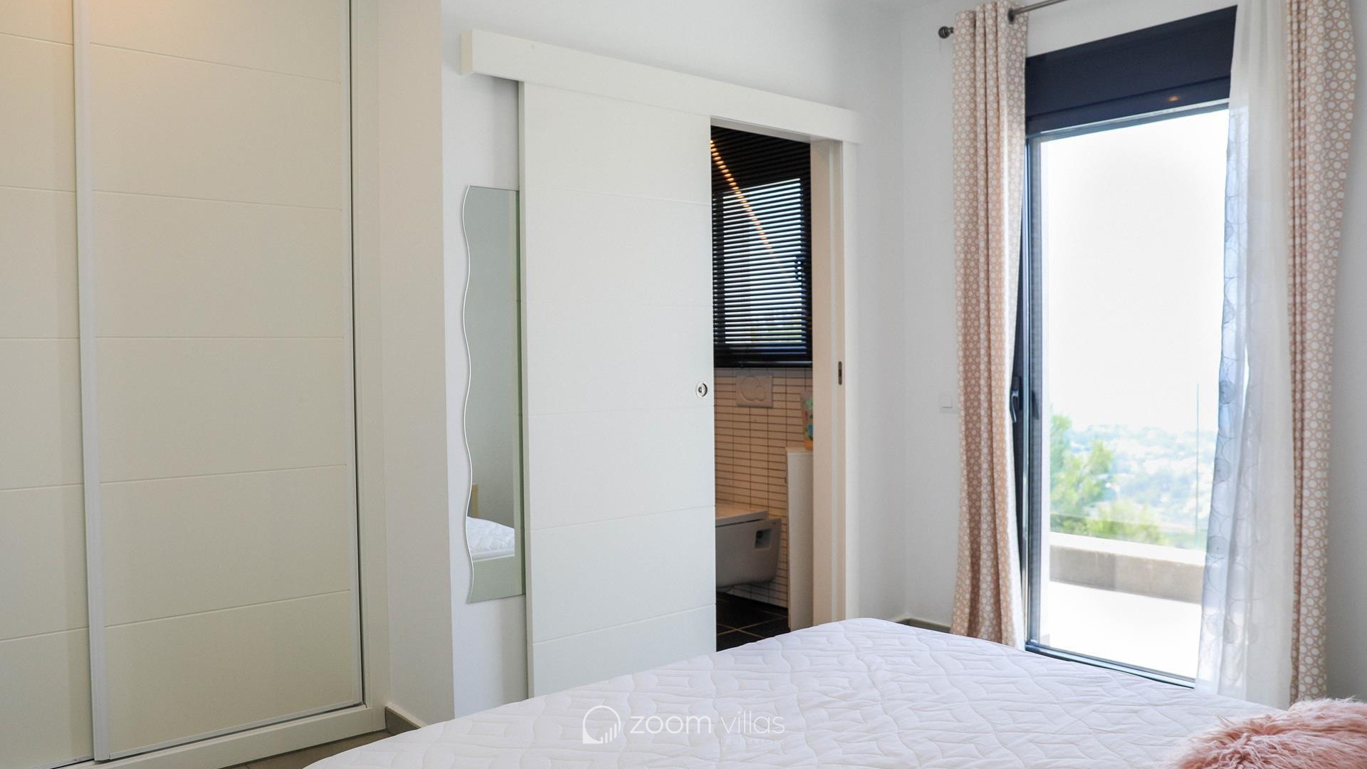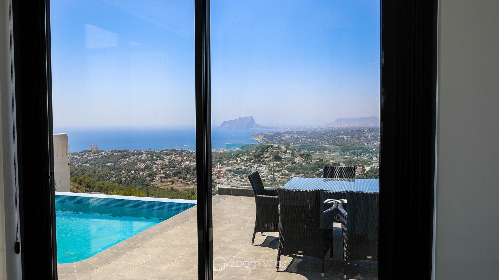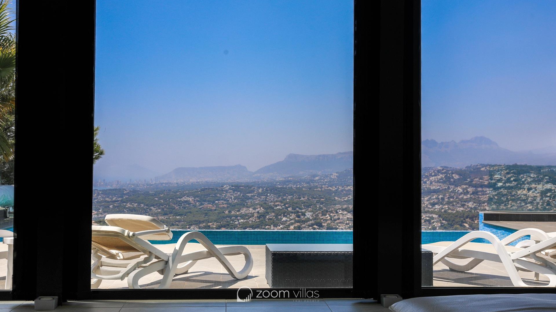 Modern style villa with stunning sea views in the Kalmias residential area of ​​the Cumbre del Sol urbanization located between Jávea and Moraira. It has a total constructed area of ​​430 m2 (200 m2 of main house, 90 m2 of guest apartment and 140 m2 of terraces), all built on a plot of 1025 m2. In total we have 5 double bedrooms all with their private bathroom. Likewise, the villa is equipped with underfloor heating and air conditioning throughout the house. The villa is built on several levels. We access with the car through a wide and comfortable access ramp, accessing the parking area with a covered area and with access to the villa through the upper floor, on the upper floor we have three double bedrooms each with its own bathroom. bathroom and direct access to the outdoor terrace with spectacular views of the sea and the mountains. Through an internal staircase we go down to the main floor of the villa where we have the living room and kitchen in open concept as well as the laundry room and a courtesy toilet, both from the kitchen area and the living room we can access the terrace exterior with private pool. From the terrace we can access the barbecue area that is located on one side of the villa. From this terrace we can skirt the pool and reach the guest apartment which is also accessible via an external staircase directly from the parking area of ​​the villa. The guest apartment enjoys very nice views from the outside terrace and the living room. Through an internal staircase we go up half a floor to access the two double bedrooms and the two bathrooms.  The Kalmias residential area is a development of villas consisting of 189 plots of 750 to 1200M2 located in the cumbre del sol urbanization in Benitachell (Alicante). Almost all the plots enjoy beautiful views of the sea, the Moraira valley with Calpe in the background and the mountains with the Sierra de Bernia in the background, the orientation of the plots can be South and Southwest. Residencial Kalmias is located in the Cumbre del sol urbanization at the south entrance bordering the Jazmines y Lirios residential area. Distances to services: From 1 to 3 km you will find the Dreamsea Mediterranean camp with a bar and restaurant and access to Morach beach, the cala de los tiestos and Cala Llebeig, the Lady Elisabeth international school, the Mercadona supermarket and the equestrian. From 4 to 5 km; the Adelfas shopping center with the Pepe la sal supermarket, hairdresser, maintenance and rental services agency, cafeteria bar, la cumbre restaurant, pharmacy, sports center with paddle tennis, tennis, bar, Mas y Mas supermarket and the center urban Benitachell From 6 to 7 km; the urban center and the beach of Portet de Moraira and the golf course of Jávea. 12 km away is the sandy beach of Jávea