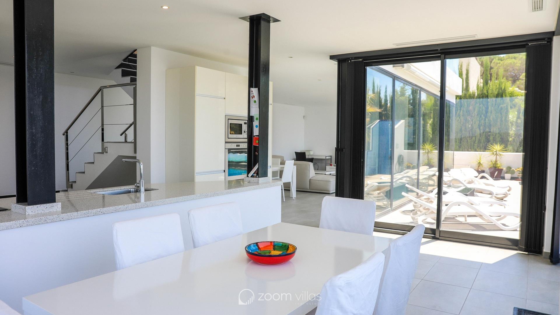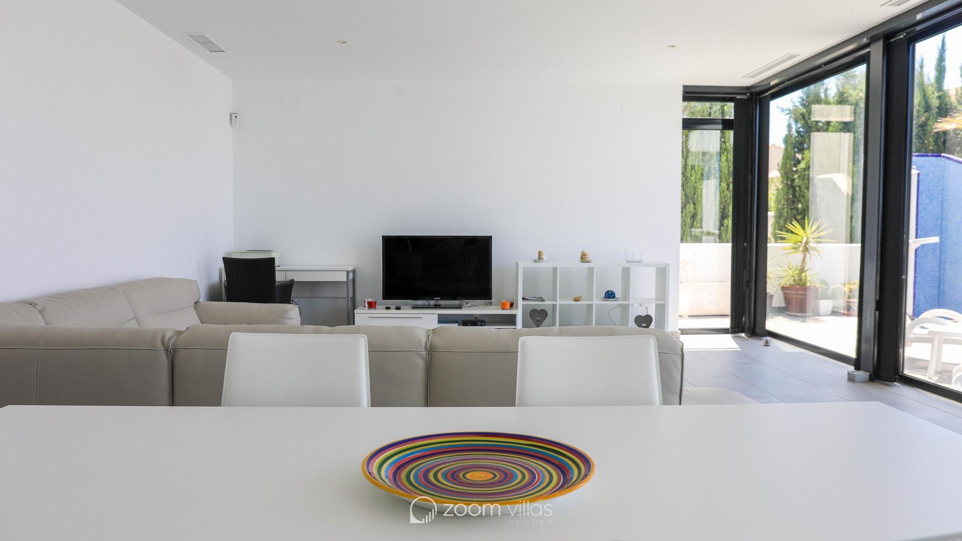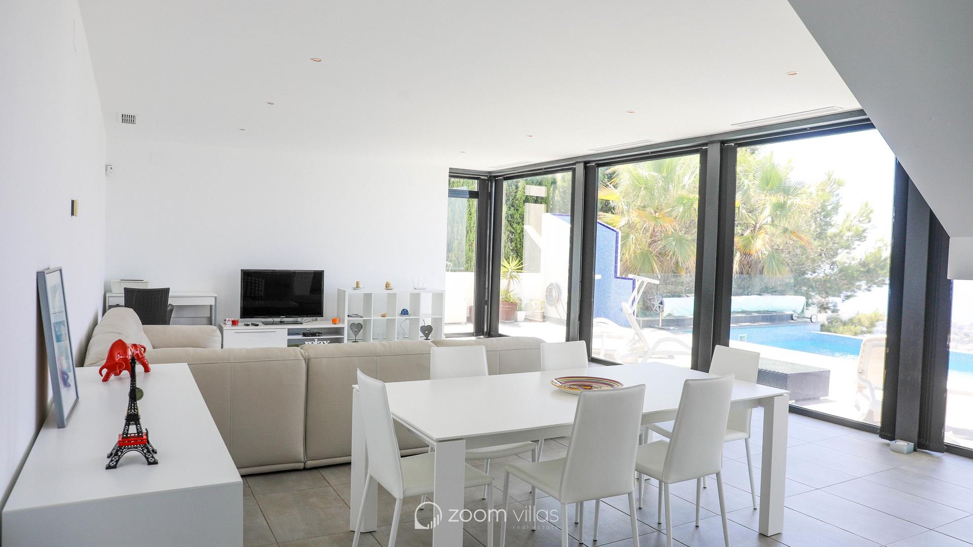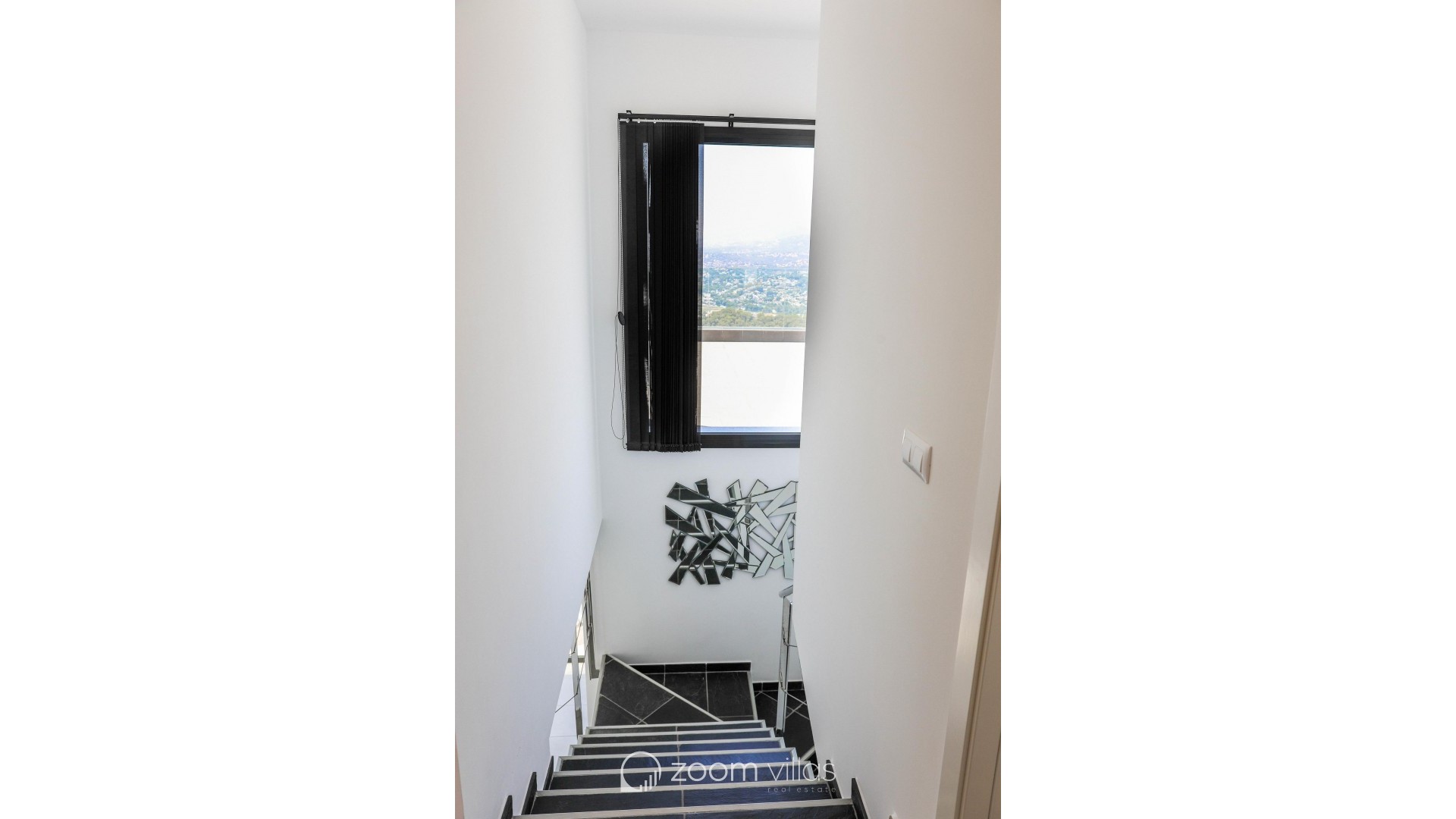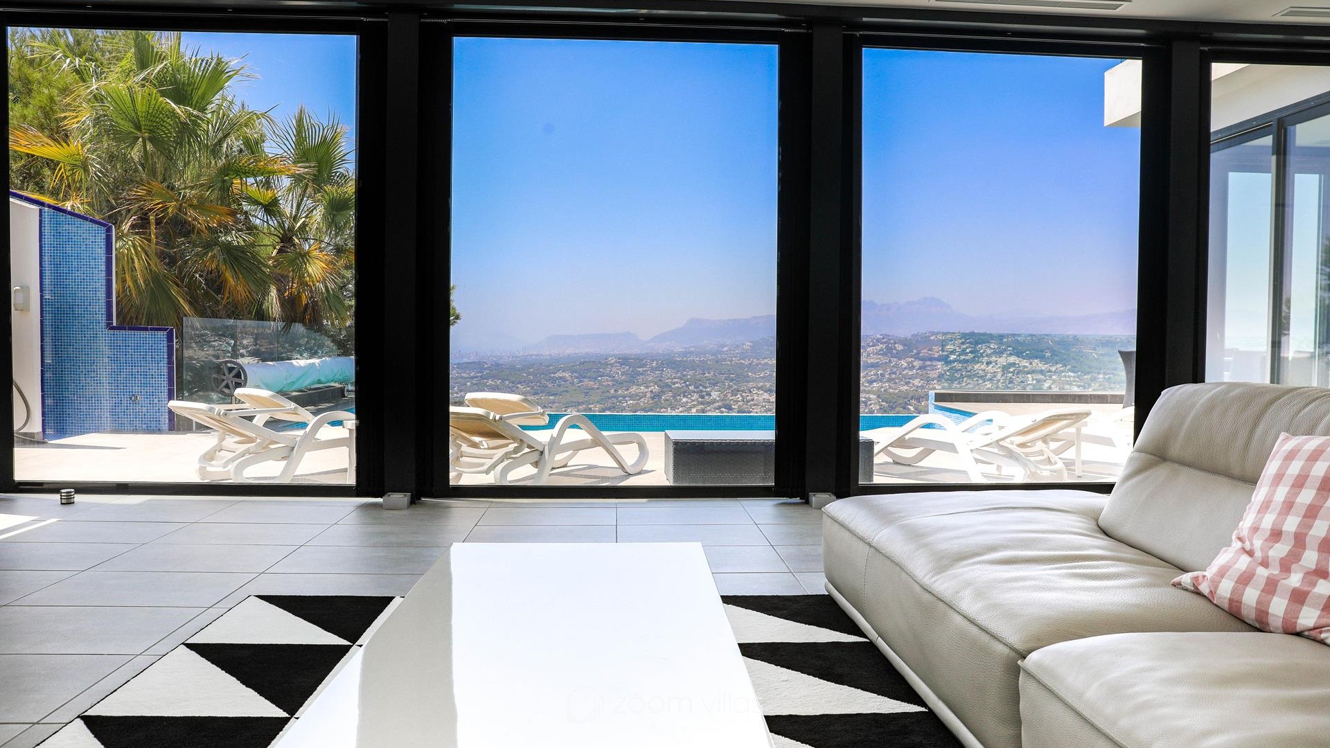 Modern style villa with stunning sea views in the Kalmias residential area of ​​the Cumbre del Sol urbanization located between Jávea and Moraira. It has a total constructed area of ​​430 m2 (200 m2 of main house, 90 m2 of guest apartment and 140 m2 of terraces), all built on a plot of 1025 m2. In total we have 5 double bedrooms all with their private bathroom. Likewise, the villa is equipped with underfloor heating and air conditioning throughout the house. The villa is built on several levels. We access with the car through a wide and comfortable access ramp, accessing the parking area with a covered area and with access to the villa through the upper floor, on the upper floor we have three double bedrooms each with its own bathroom. bathroom and direct access to the outdoor terrace with spectacular views of the sea and the mountains. Through an internal staircase we go down to the main floor of the villa where we have the living room and kitchen in open concept as well as the laundry room and a courtesy toilet, both from the kitchen area and the living room we can access the terrace exterior with private pool. From the terrace we can access the barbecue area that is located on one side of the villa. From this terrace we can skirt the pool and reach the guest apartment which is also accessible via an external staircase directly from the parking area of ​​the villa. The guest apartment enjoys very nice views from the outside terrace and the living room. Through an internal staircase we go up half a floor to access the two double bedrooms and the two bathrooms.  The Kalmias residential area is a development of villas consisting of 189 plots of 750 to 1200M2 located in the cumbre del sol urbanization in Benitachell (Alicante). Almost all the plots enjoy beautiful views of the sea, the Moraira valley with Calpe in the background and the mountains with the Sierra de Bernia in the background, the orientation of the plots can be South and Southwest. Residencial Kalmias is located in the Cumbre del sol urbanization at the south entrance bordering the Jazmines y Lirios residential area. Distances to services: From 1 to 3 km you will find the Dreamsea Mediterranean camp with a bar and restaurant and access to Morach beach, the cala de los tiestos and Cala Llebeig, the Lady Elisabeth international school, the Mercadona supermarket and the equestrian. From 4 to 5 km; the Adelfas shopping center with the Pepe la sal supermarket, hairdresser, maintenance and rental services agency, cafeteria bar, la cumbre restaurant, pharmacy, sports center with paddle tennis, tennis, bar, Mas y Mas supermarket and the center urban Benitachell From 6 to 7 km; the urban center and the beach of Portet de Moraira and the golf course of Jávea. 12 km away is the sandy beach of Jávea
