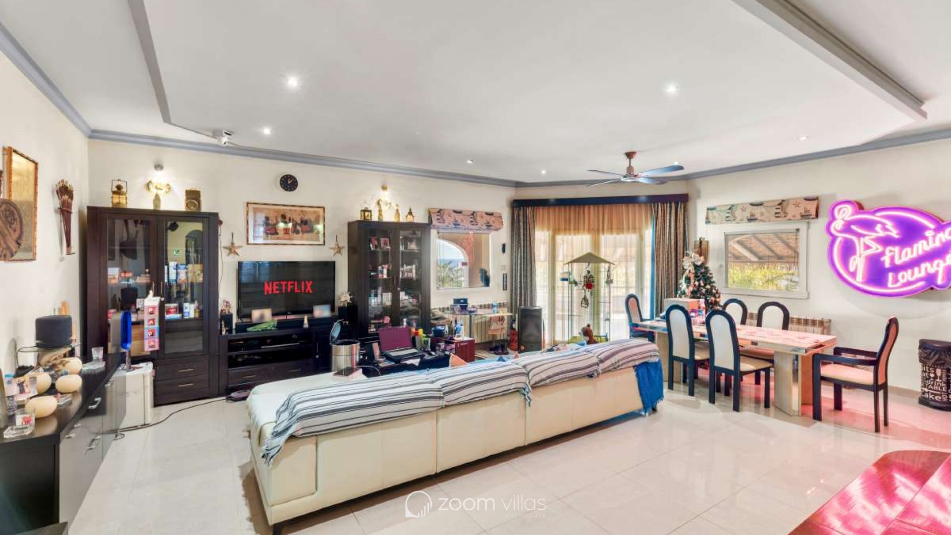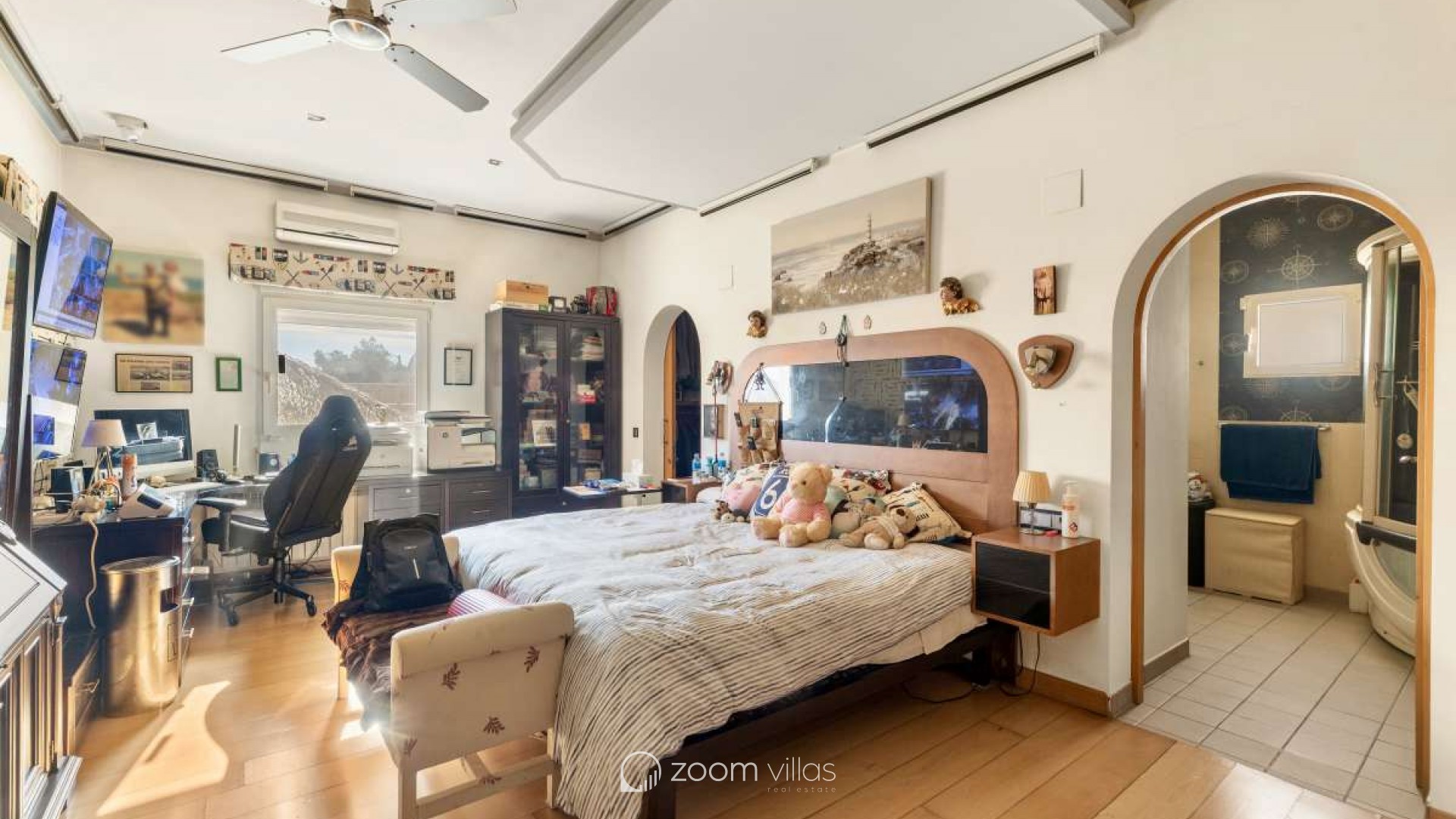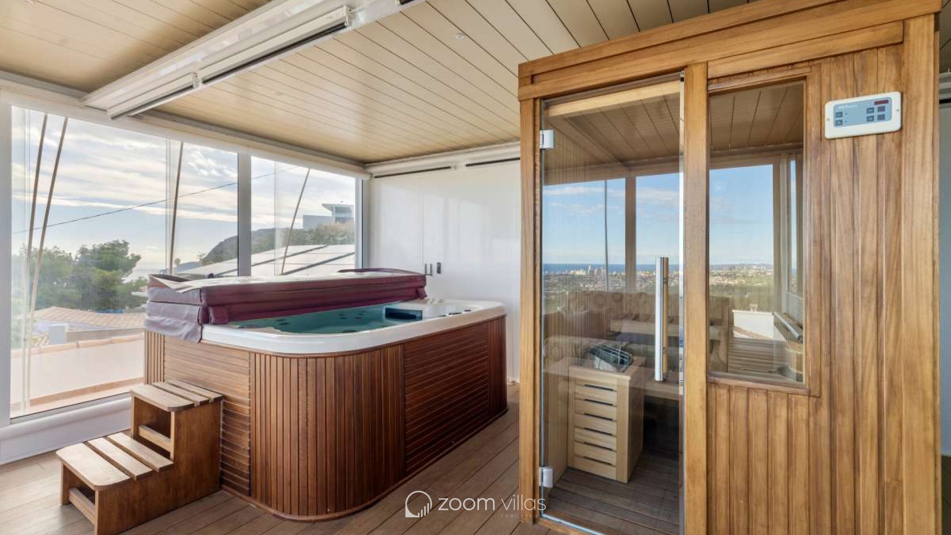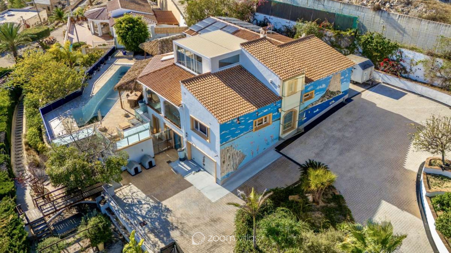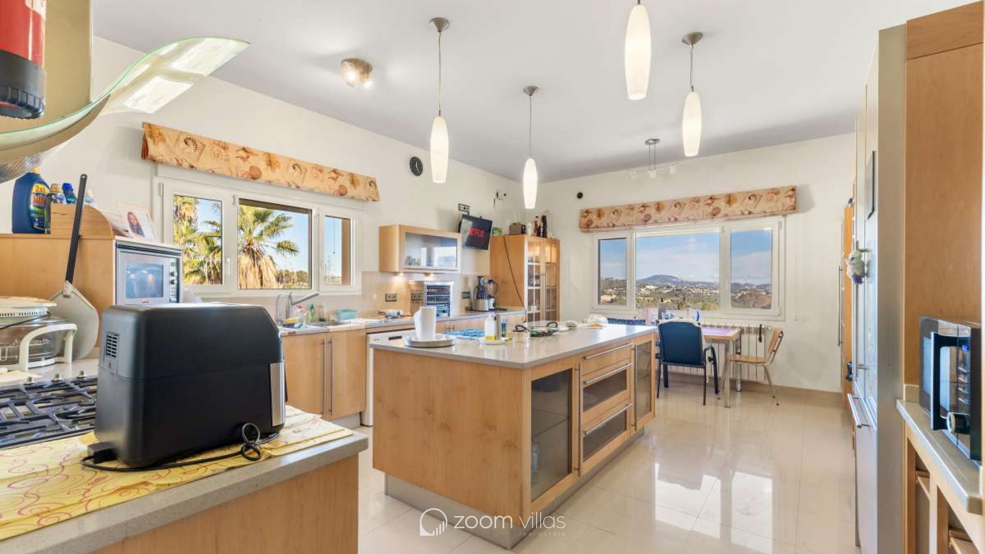 Perched in an elevated, peaceful setting, this villa enjoys full privacy and some of the most breathtaking sea views on the entire coastline — a place where the horizon opens wide and the landscape becomes part of the home.This distinctive property stands out for its extraordinary dimensions, generous outdoor spaces, and exceptional potential. While it would benefit from renovation, the solid structure and thoughtful architectural details make it a rare opportunity for those looking to create a truly remarkable residence.The villa boasts 180-degree panoramic views of the Mediterranean, reaching as far as Ibiza on clear days — an incredible backdrop for both daily living and entertaining.Upon entering, you are greeted by a charming bar area that seamlessly connects to the spectacular double-height living room, flooded with natural light through floor-to-ceiling windows that open directly to the terrace and pool. On this main level, you will also find a spacious kitchen with terrace access, a primary bedroom with dressing room and en-suite bathroom, and an additional bedroom with a full bathroom.The lower floor features a versatile space, ideal for guests or independent living. This level includes a large living room, bedroom, gym (convertible into another bedroom), full bathroom with direct access to the pool, and a closed garage. With its own independent entrance, it offers complete privacy.The top floor is dedicated to wellness, featuring a sauna, jacuzzi, and a terrace with breathtaking sea views — the perfect retreat.The exterior is equally impressive: a strategically positioned pool to make the most of the views, a fully equipped outdoor kitchen with oven and barbecue, and a parking area for at least 15 vehicles. The plot has two separate entrances, both with automatic gates, ensuring easy access and convenience.As a major additional benefit, the villa includes a 30 kW solar panel installation, significantly reducing energy costs while supporting the property’s extensive spaces and facilities.In summary, this is a one-of-a-kind villa that blends scale, character, and outstanding potential — an ideal choice for those seeking a unique home with unmatched views and exceptional possibilities for future value.