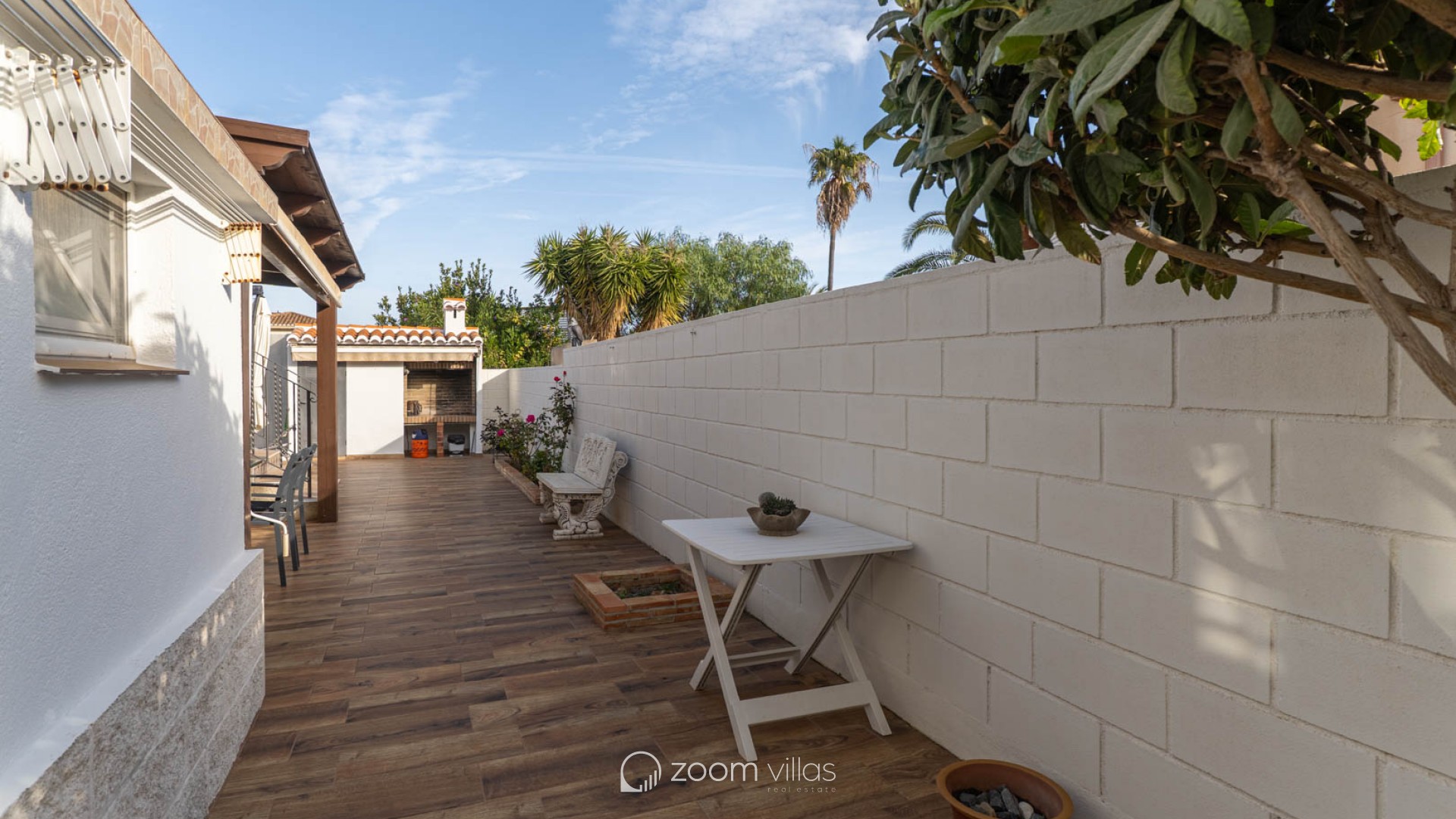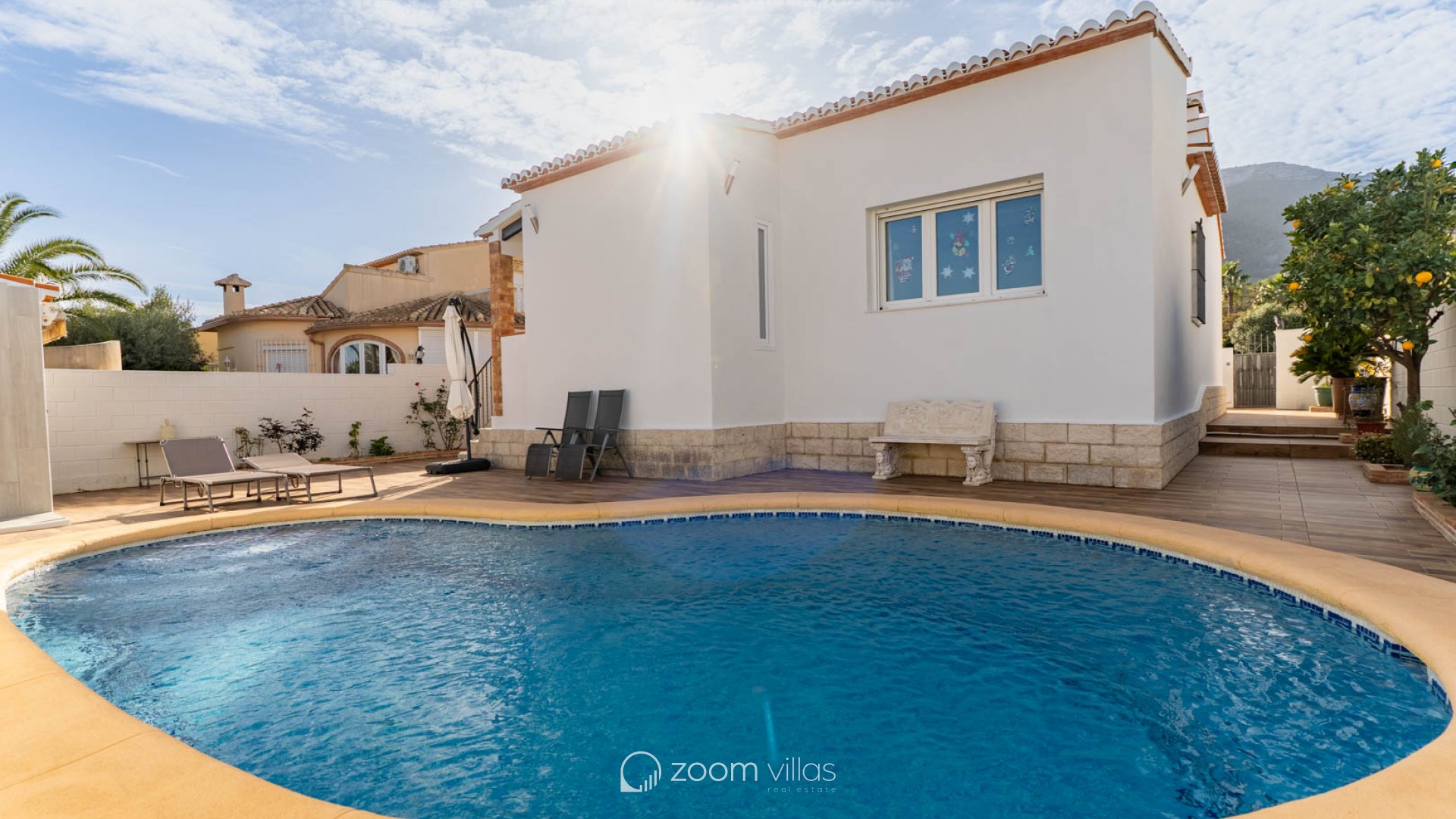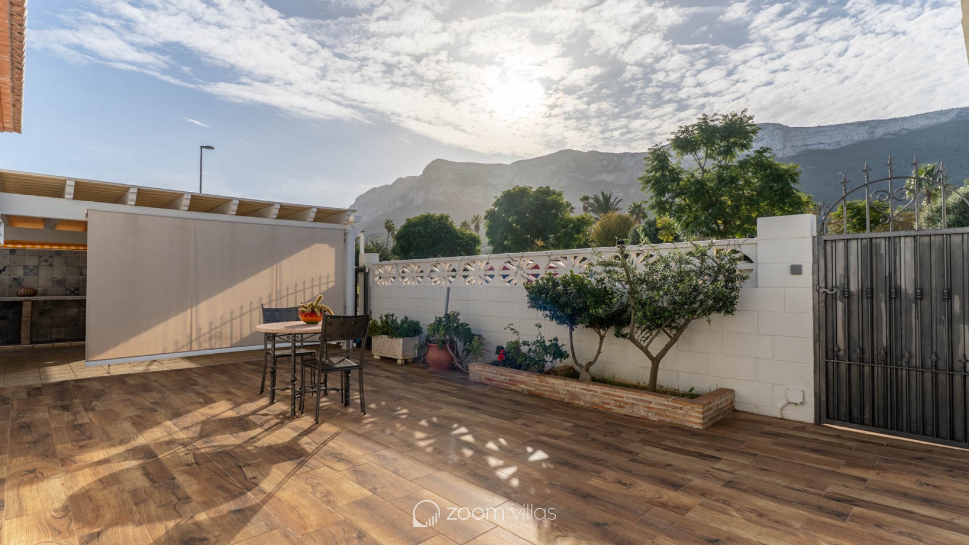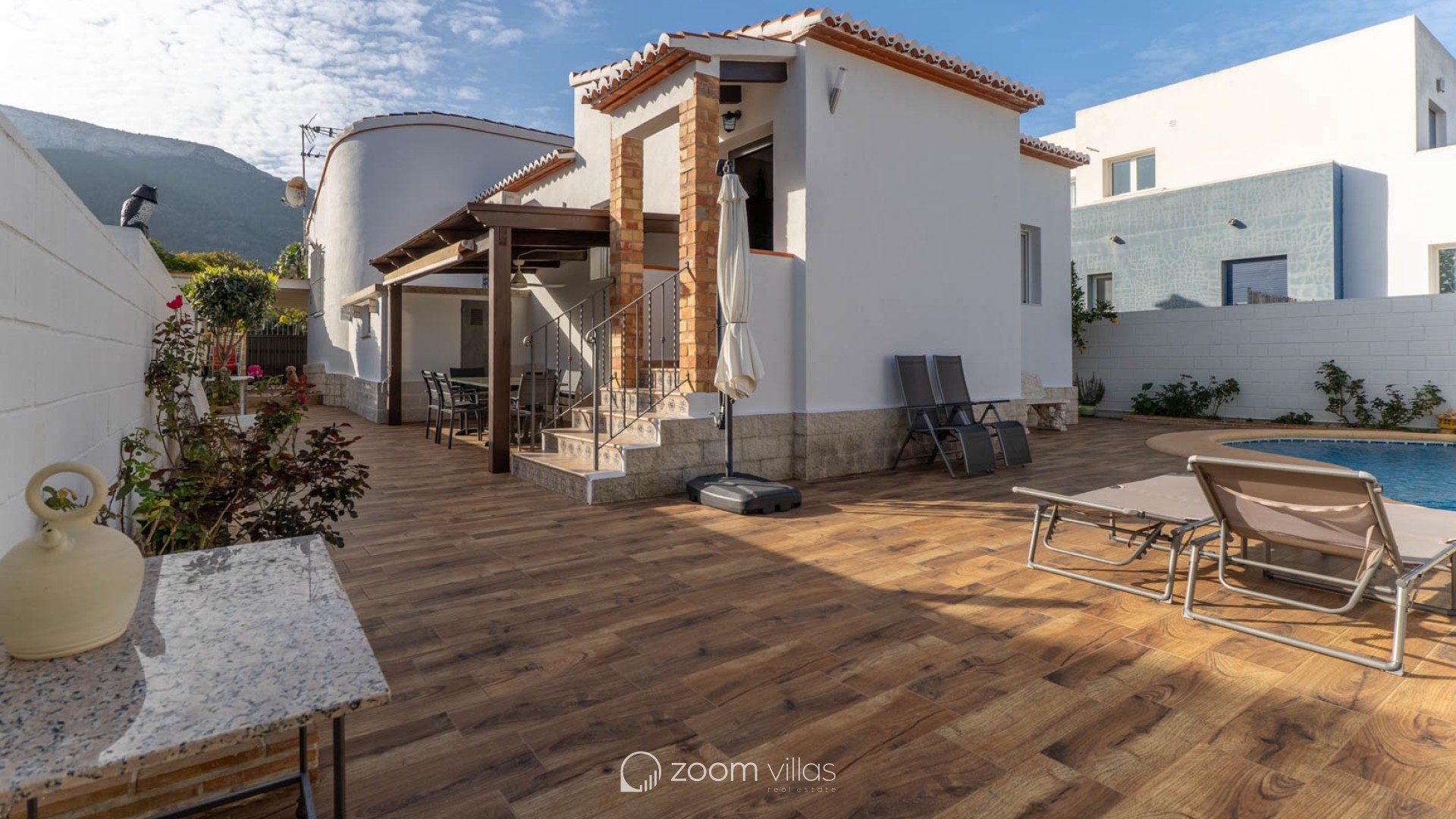 The fully fenced plot features wood-look tile flooring and easy-to-maintain Mediterranean vegetation. It includes a covered terrace, a barbecue area, a laundry room, and a storage room. The private swimming pool is located at the rear, with an orientation that guarantees sunshine year-round. Access to the property includes an automatic gate and covered parking within the grounds. Located opposite a park and green space, the property offers tranquility while still being close to bars, restaurants, a pharmacy, a health center, and a supermarket. The center of Dénia is very close and easily accessible on foot or by bicycle. The property boasts beautiful views of Montgó mountain, and the beach, the port, and all essential amenities are just a short drive away.