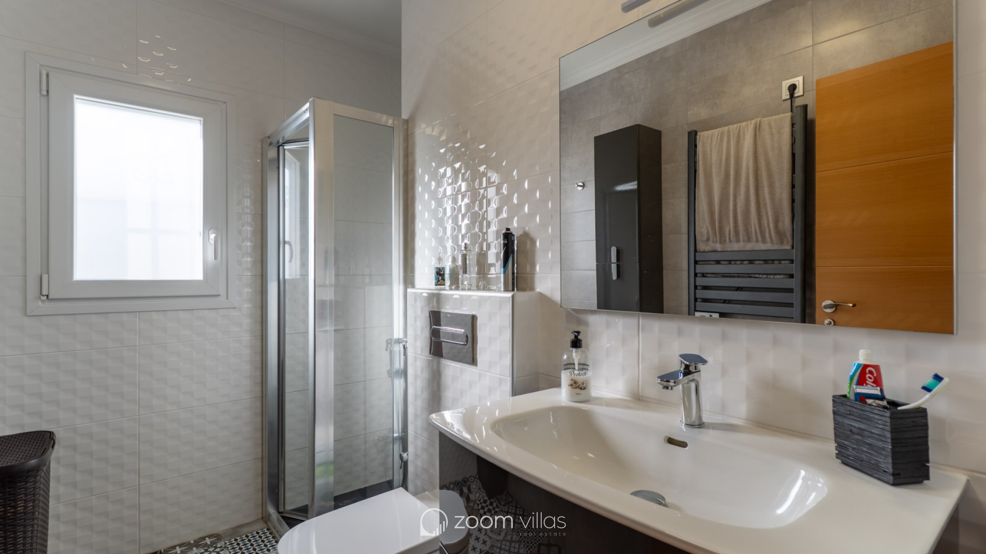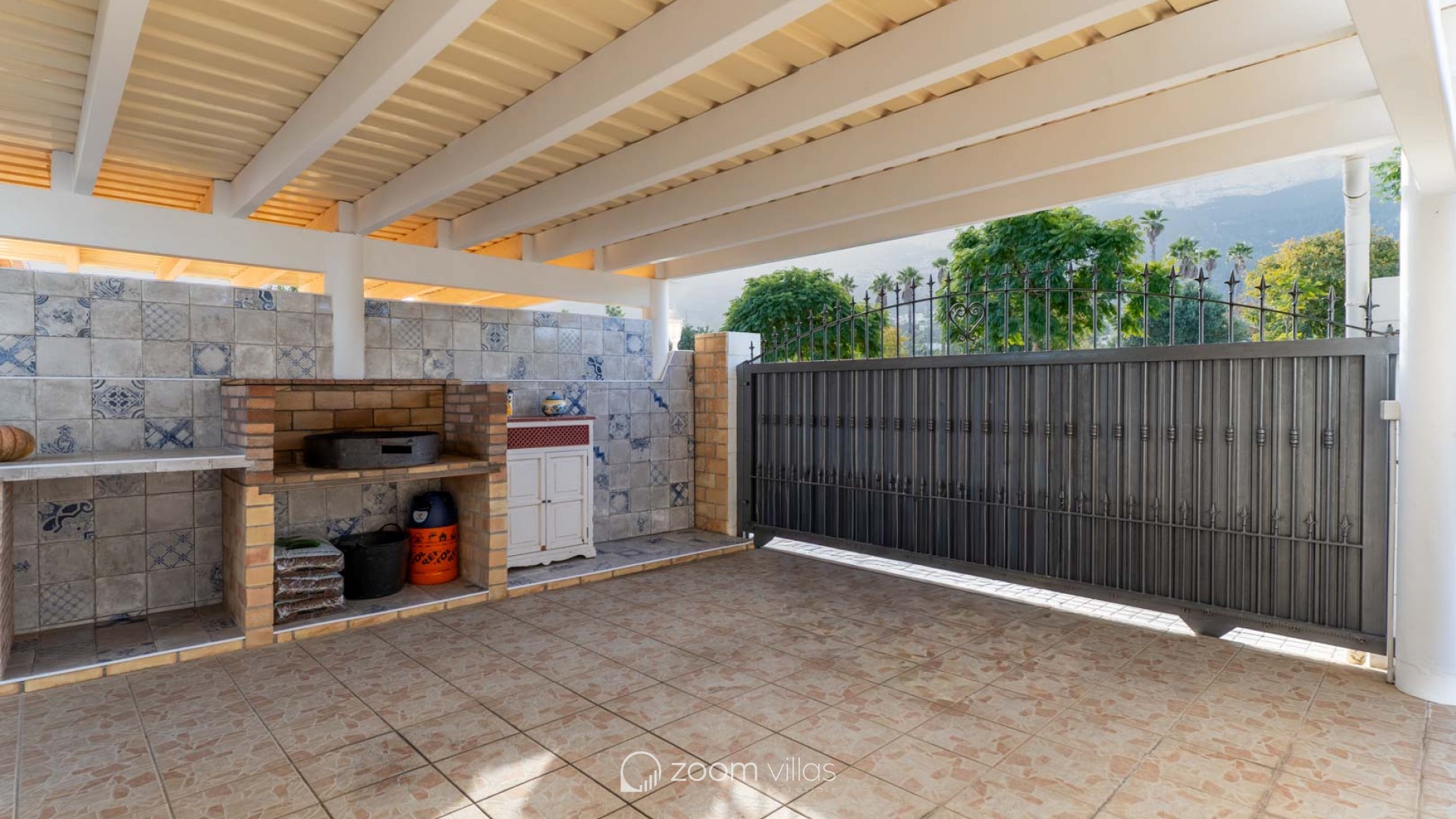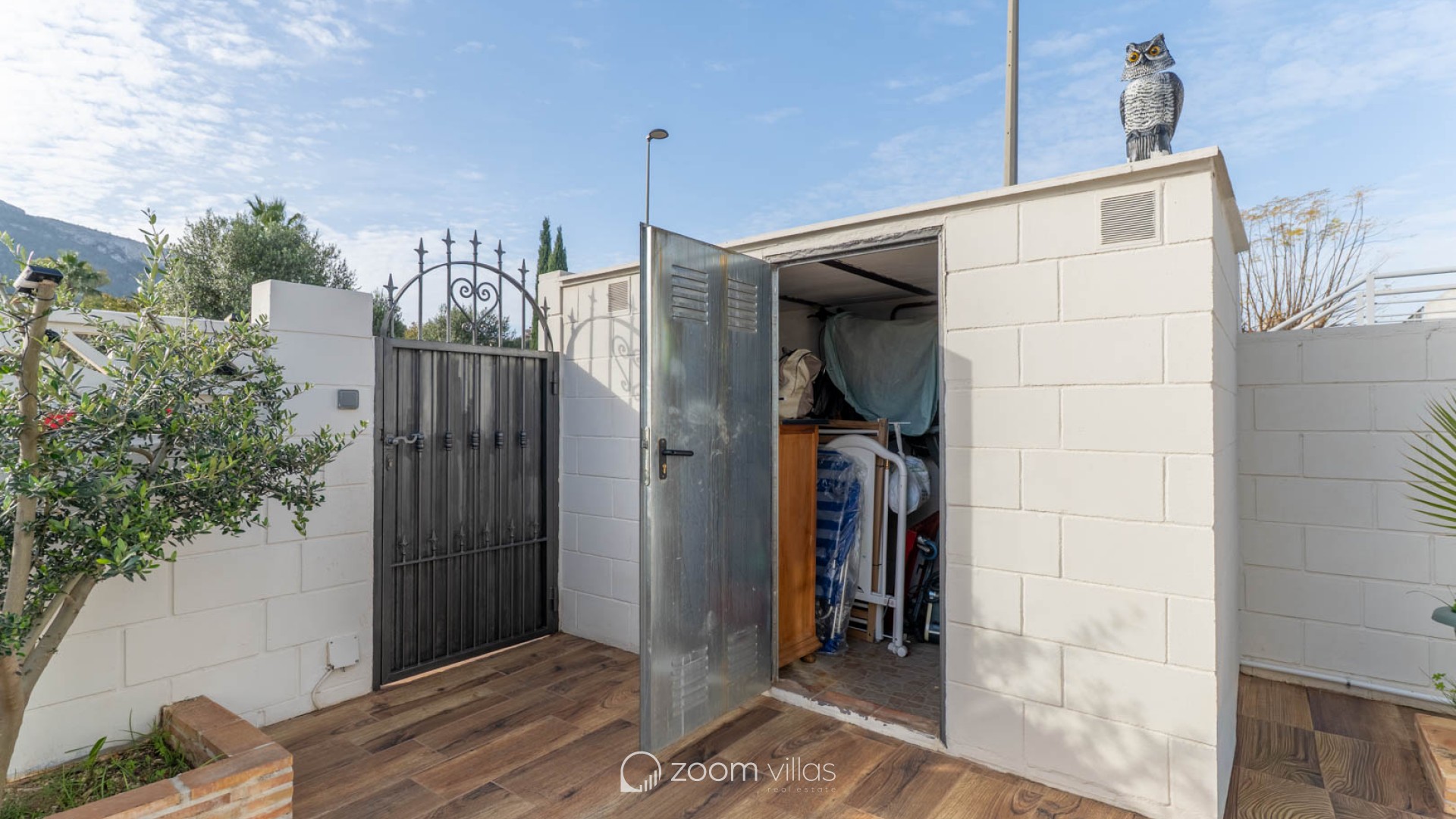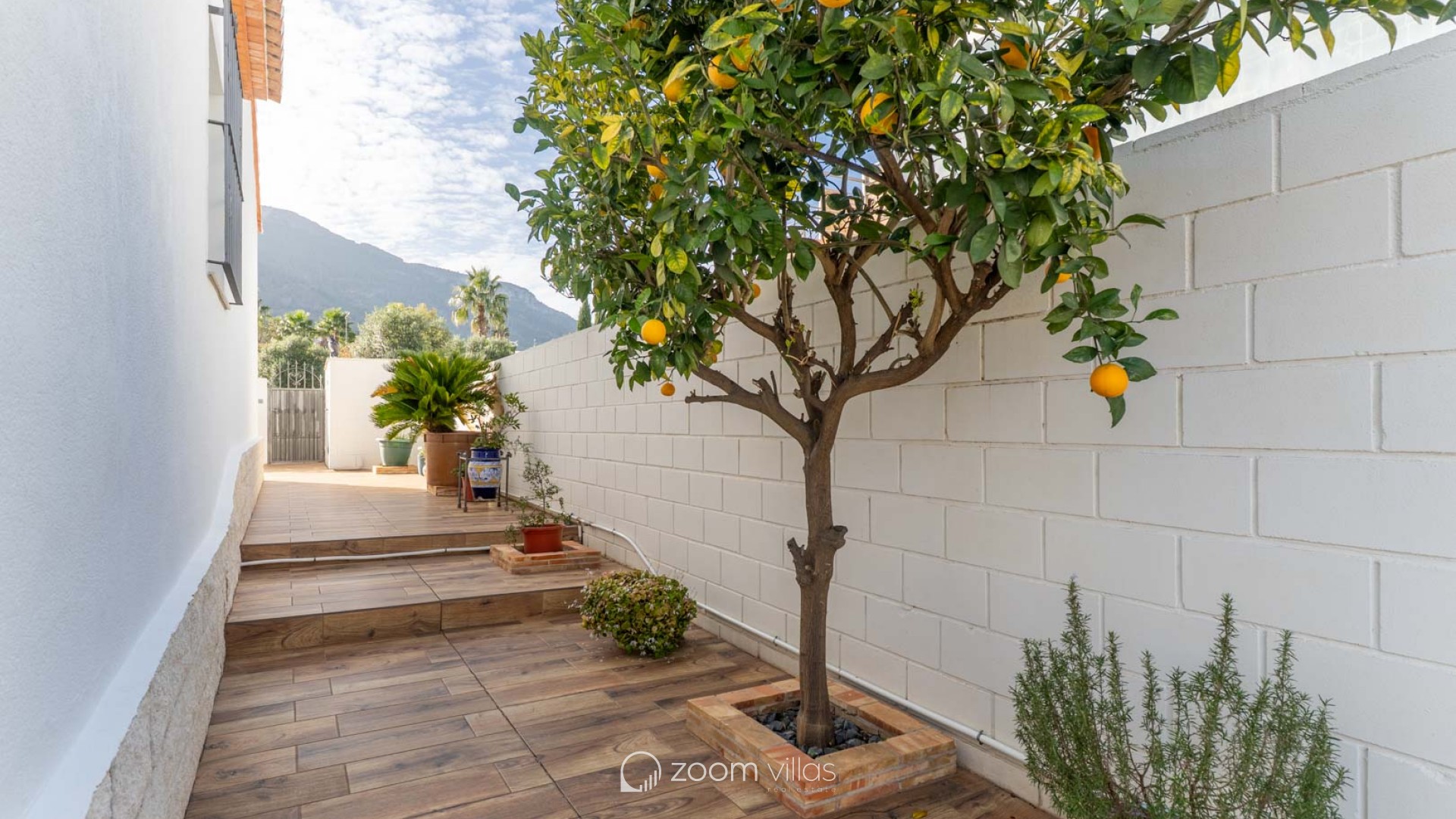 The fully fenced plot features wood-look tile flooring and easy-to-maintain Mediterranean vegetation. It includes a covered terrace, a barbecue area, a laundry room, and a storage room. The private swimming pool is located at the rear, with an orientation that guarantees sunshine year-round. Access to the property includes an automatic gate and covered parking within the grounds. Located opposite a park and green space, the property offers tranquility while still being close to bars, restaurants, a pharmacy, a health center, and a supermarket. The center of Dénia is very close and easily accessible on foot or by bicycle. The property boasts beautiful views of Montgó mountain, and the beach, the port, and all essential amenities are just a short drive away.