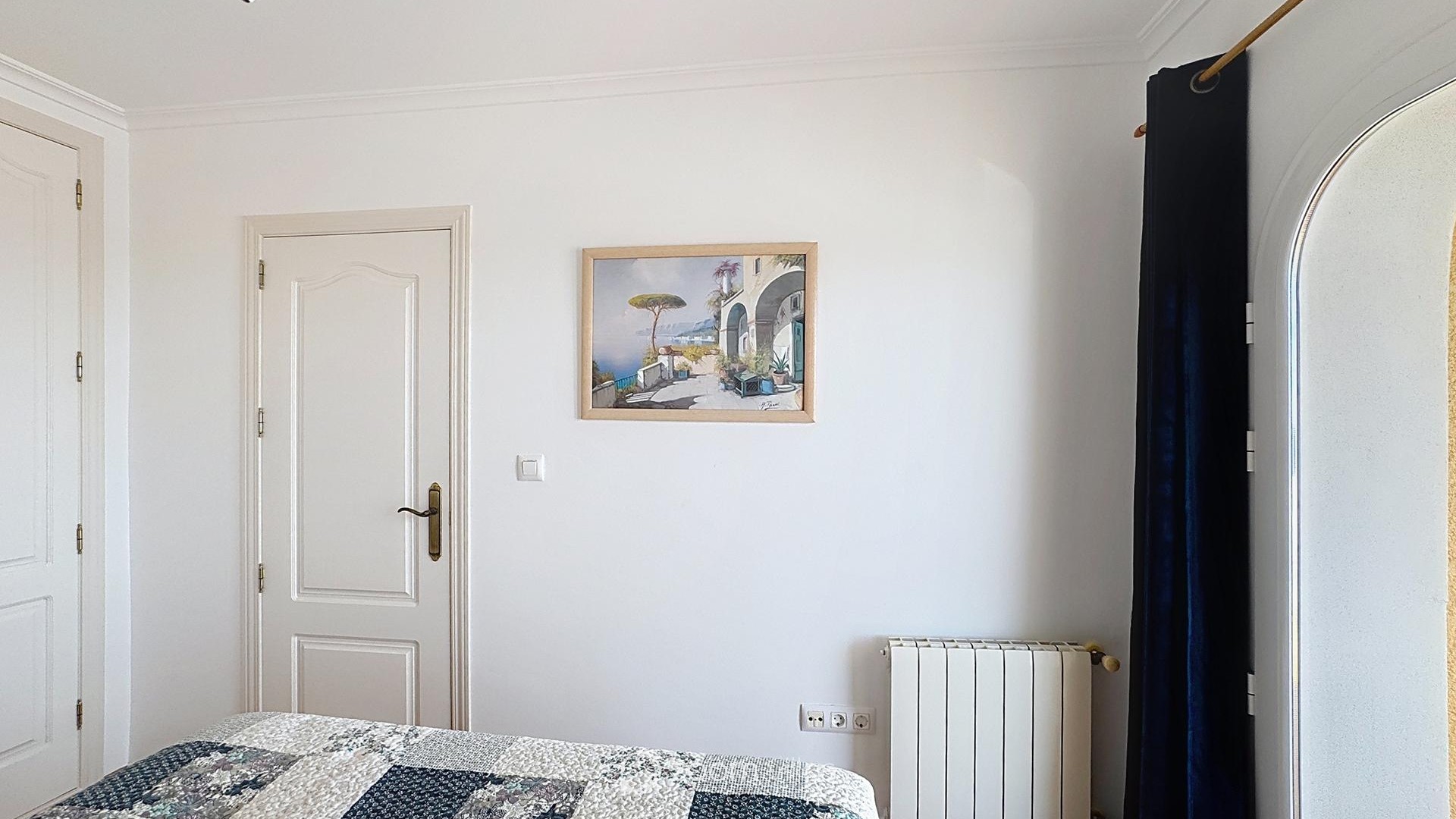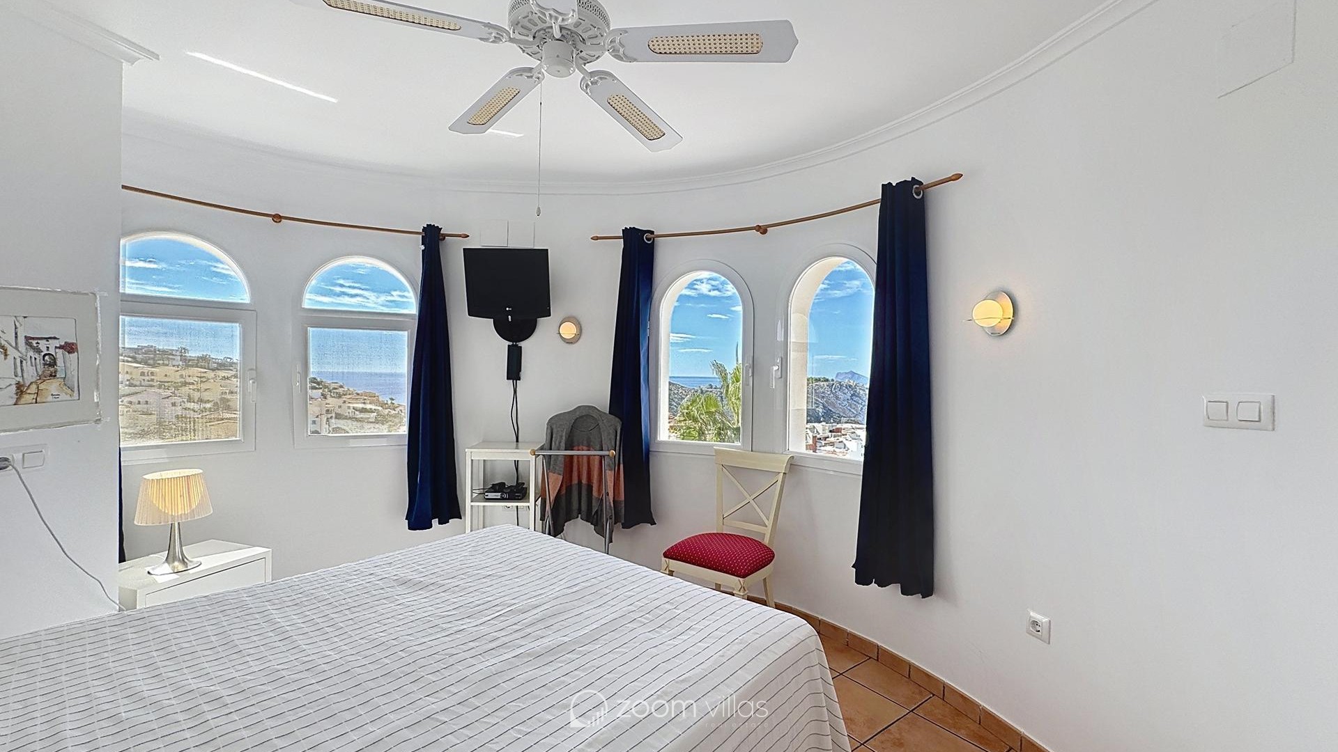 Upper floor - On this level there is a master bedroom suite with a dressing room, bathroom with shower and bathtub, and access to a terrace with stunning views of the sea and the Peñón de Ifach in Calpe.