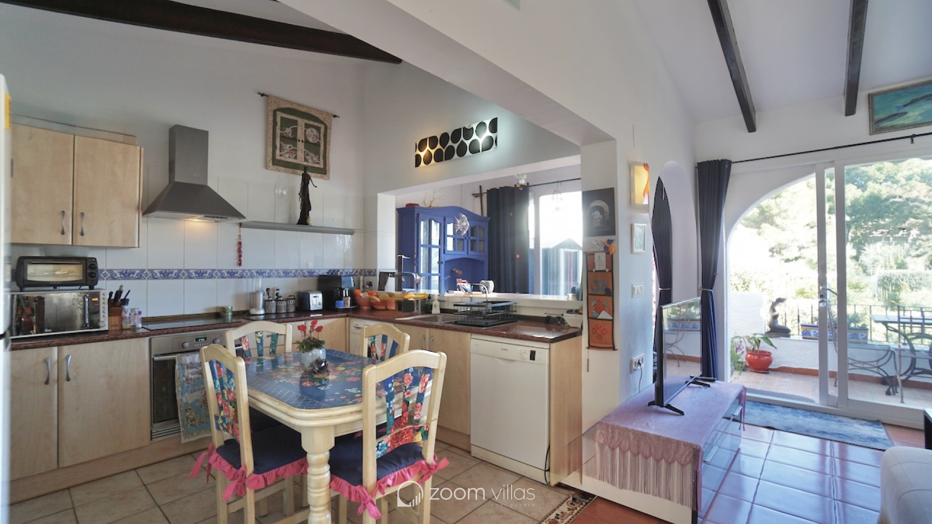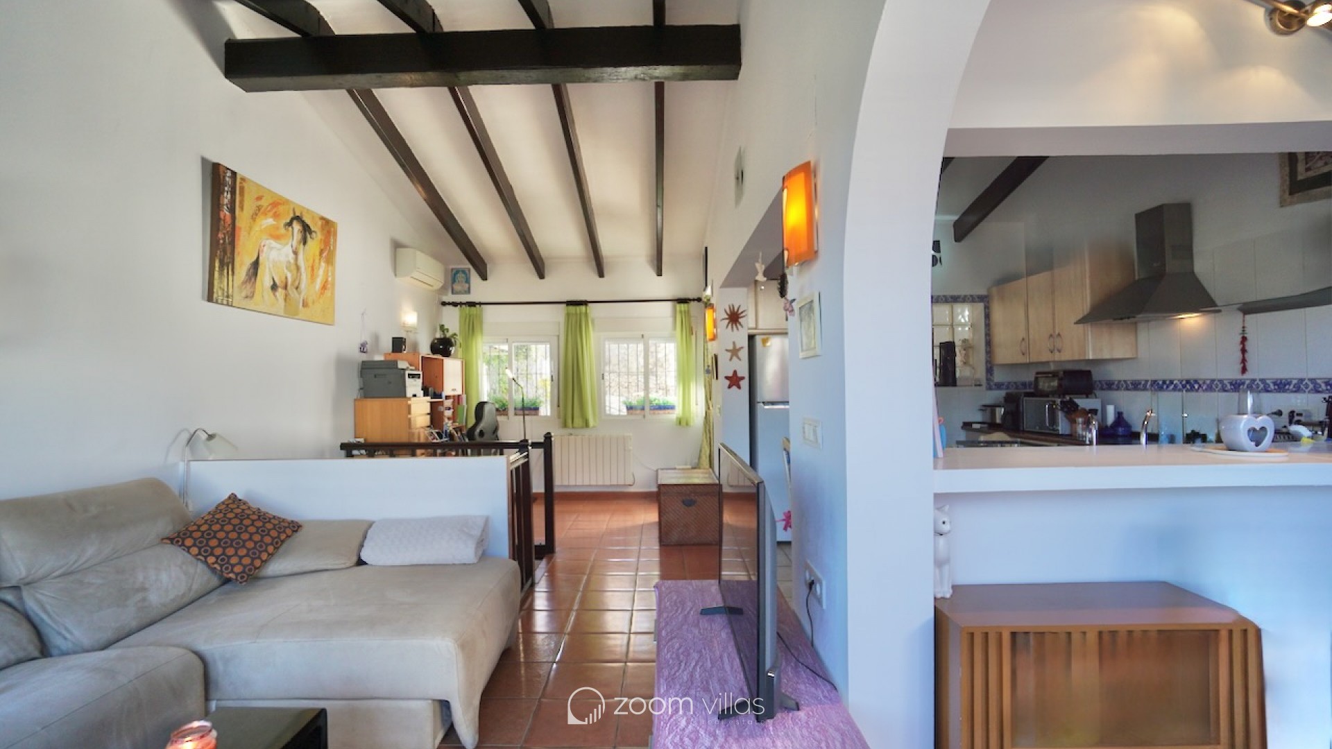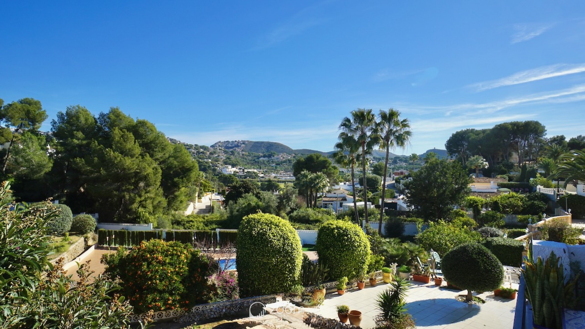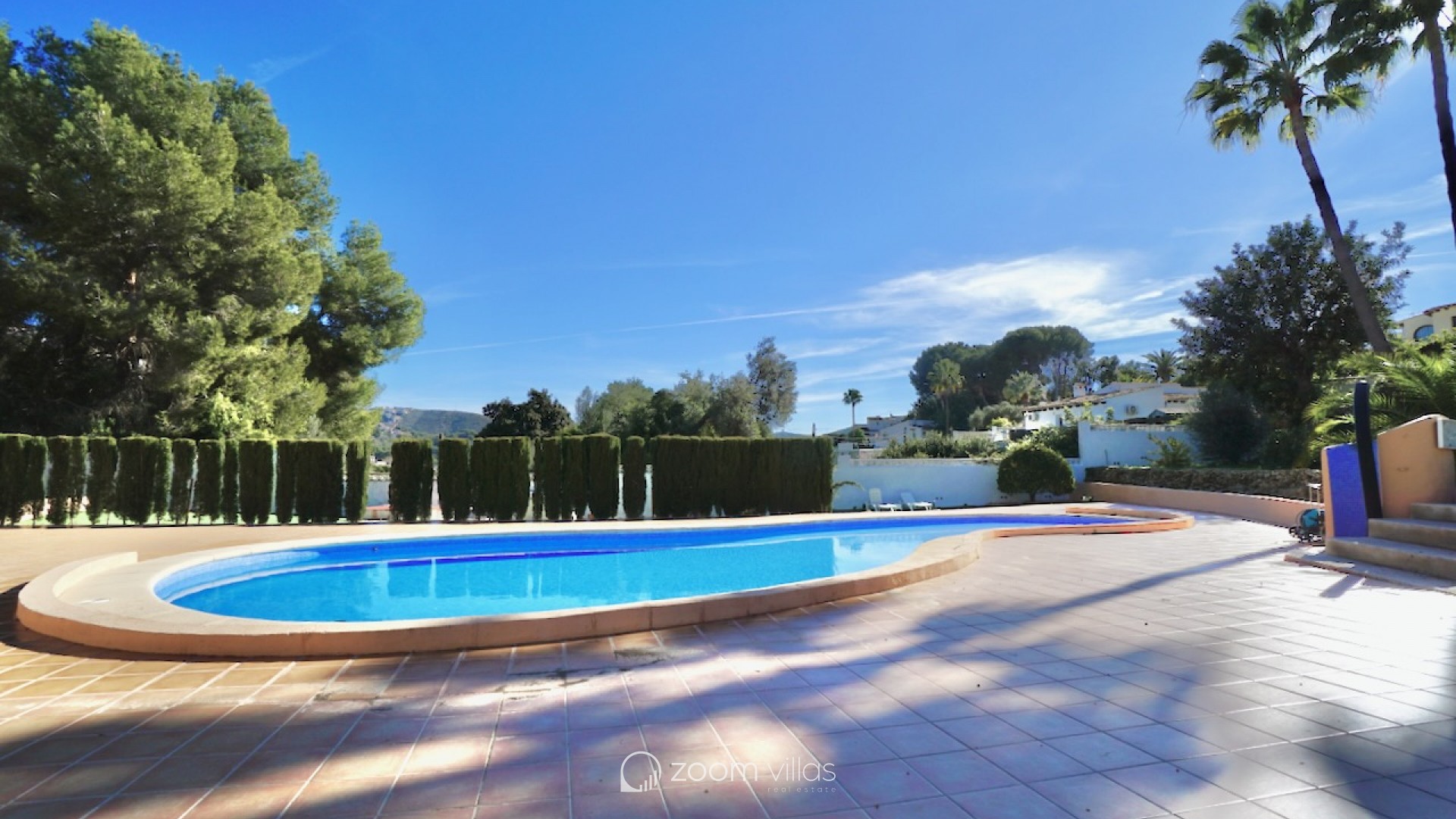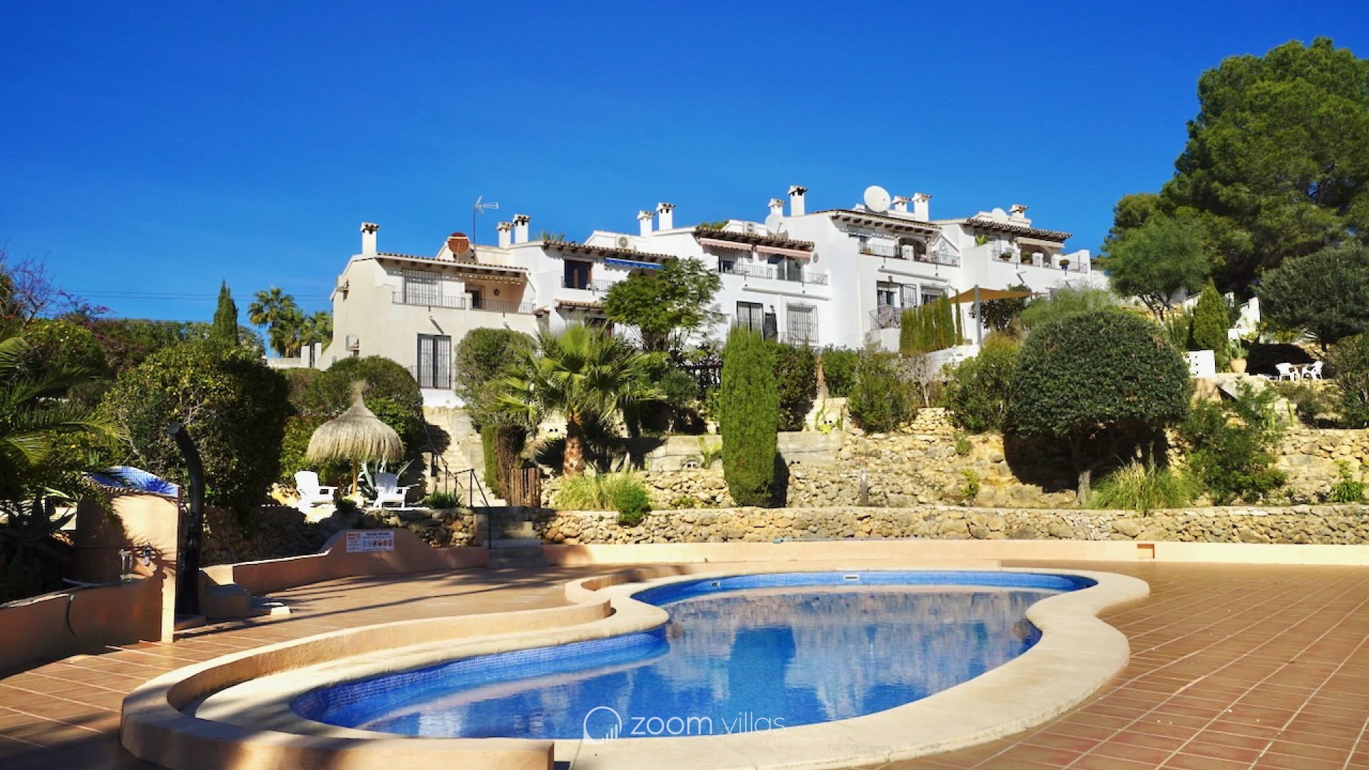 The property welcomes you on the upper level, where you enter a bright open-plan kitchen and living area filled with natural daylight thanks to its east-facing orientation. Large sliding doors connect the living space directly to a private balcony, creating a pleasant extension of the living area and the perfect spot to enjoy breakfast in the morning sun. From the living area, a staircase leads to the lower level, where you will find two comfortable bedrooms. One bedroom features opening doors with direct access to the communal terrace, allowing you to step outside and enjoy the outdoor space and nearby communal swimming pool. The second bedroom is fitted with a built-in wardrobe. This level also includes two bathrooms and a large indoor storage room, providing excellent flexibility and making it ideal for use as a home office, hobby room or additional functional space, depending on your needs. The property offers enjoyable outdoor living with access to a spacious communal terrace on the lower level. The surrounding semi-sloping plot is easy to maintain and complements the quiet residential setting. Additional features include private parking and a large well-maintained communal swimming pool, perfect for cooling off during the warmer months. All essential services are located within 600 metres, while the town centre and beaches are just 1.8 km away, offering an excellent balance between tranquillity and convenience. Built in 1987 in a traditional style, this bungalow is ideal as a holiday home or a comfortable permanent residence. It also offers a great opportunity for buyers looking for a property with potential to modernise or personalise in one of Moraira’s most desirable residential areas. Key features Walking distance to services: 600mWalking distance to Sea & Moraira centre: 1.8kmAirconditioning H/CBeautiful open views from living area and balconyLarge communal swimming pool with spacious sun terracePrivate parkingPotential to modernise or personalise