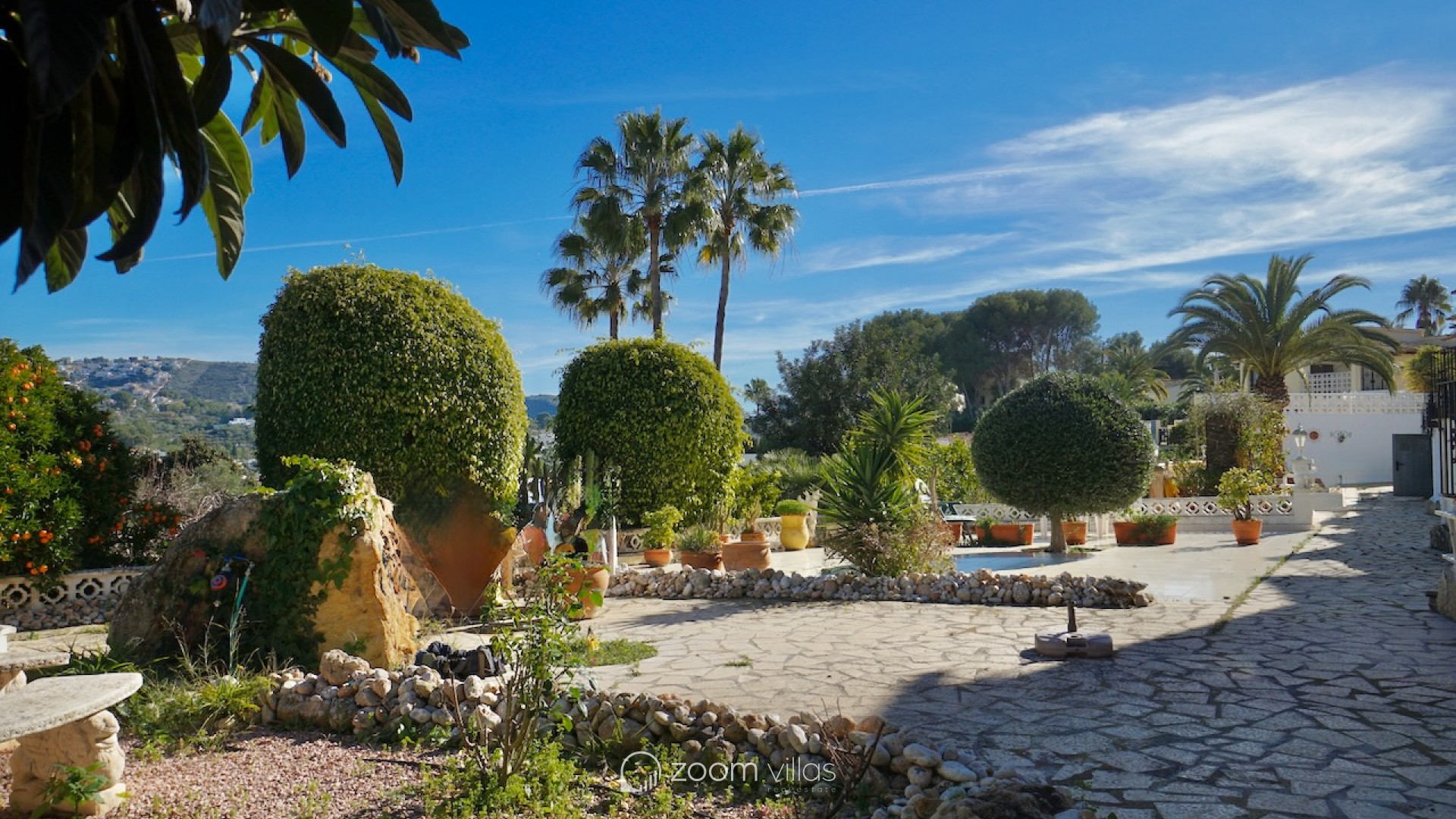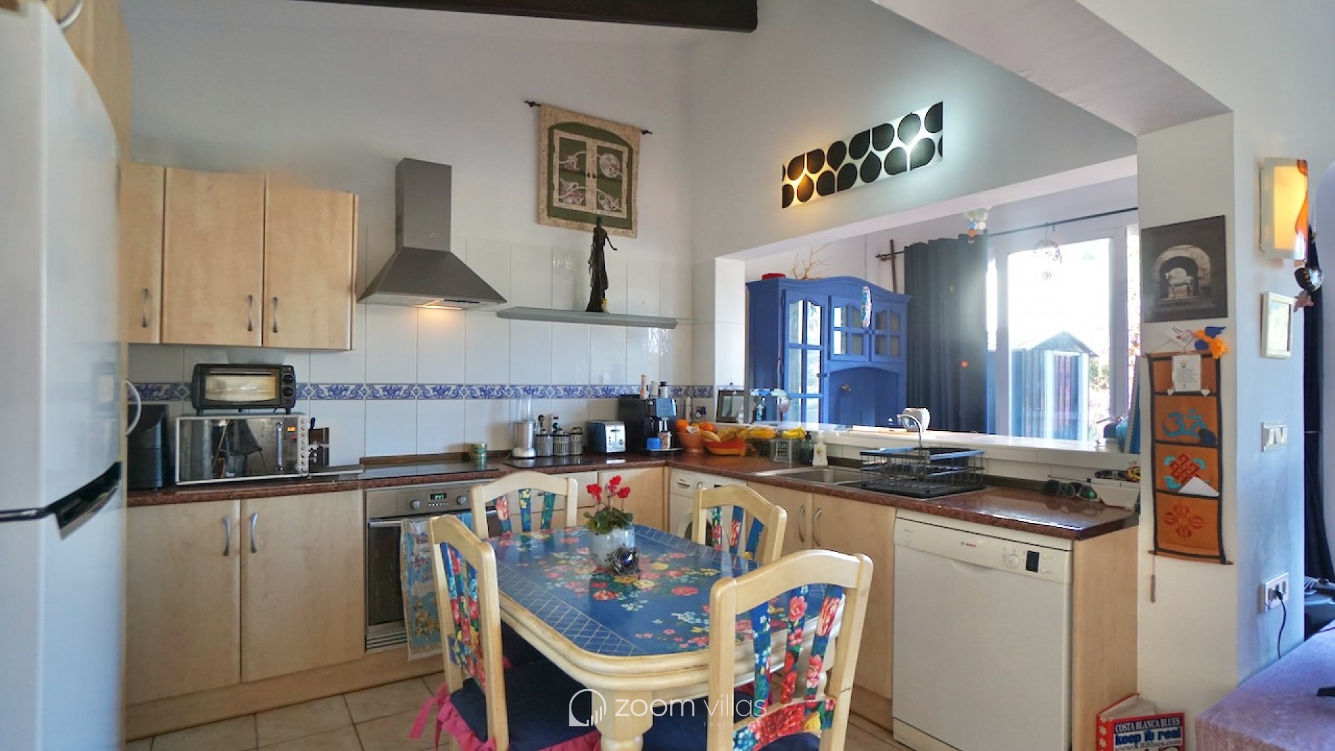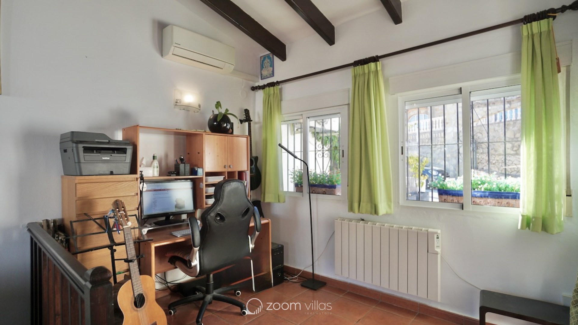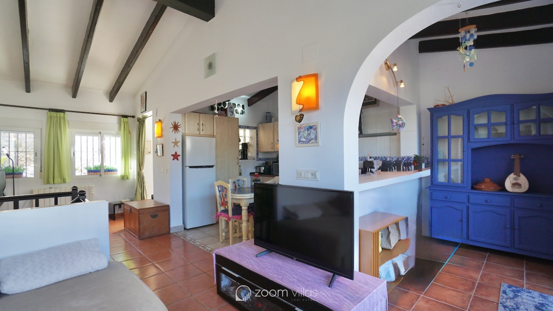 The property welcomes you on the upper level, where you enter a bright open-plan kitchen and living area filled with natural daylight thanks to its east-facing orientation. Large sliding doors connect the living space directly to a private balcony, creating a pleasant extension of the living area and the perfect spot to enjoy breakfast in the morning sun. From the living area, a staircase leads to the lower level, where you will find two comfortable bedrooms. One bedroom features opening doors with direct access to the communal terrace, allowing you to step outside and enjoy the outdoor space and nearby communal swimming pool. The second bedroom is fitted with a built-in wardrobe. This level also includes two bathrooms and a large indoor storage room, providing excellent flexibility and making it ideal for use as a home office, hobby room or additional functional space, depending on your needs. The property offers enjoyable outdoor living with access to a spacious communal terrace on the lower level. The surrounding semi-sloping plot is easy to maintain and complements the quiet residential setting. Additional features include private parking and a large well-maintained communal swimming pool, perfect for cooling off during the warmer months. All essential services are located within 600 metres, while the town centre and beaches are just 1.8 km away, offering an excellent balance between tranquillity and convenience. Built in 1987 in a traditional style, this bungalow is ideal as a holiday home or a comfortable permanent residence. It also offers a great opportunity for buyers looking for a property with potential to modernise or personalise in one of Moraira’s most desirable residential areas. Key features Walking distance to services: 600mWalking distance to Sea & Moraira centre: 1.8kmAirconditioning H/CBeautiful open views from living area and balconyLarge communal swimming pool with spacious sun terracePrivate parkingPotential to modernise or personalise