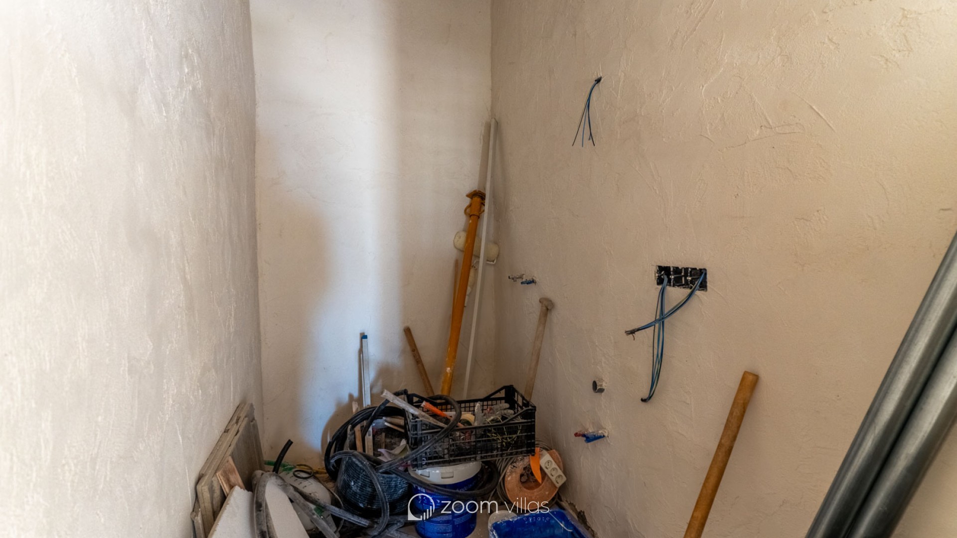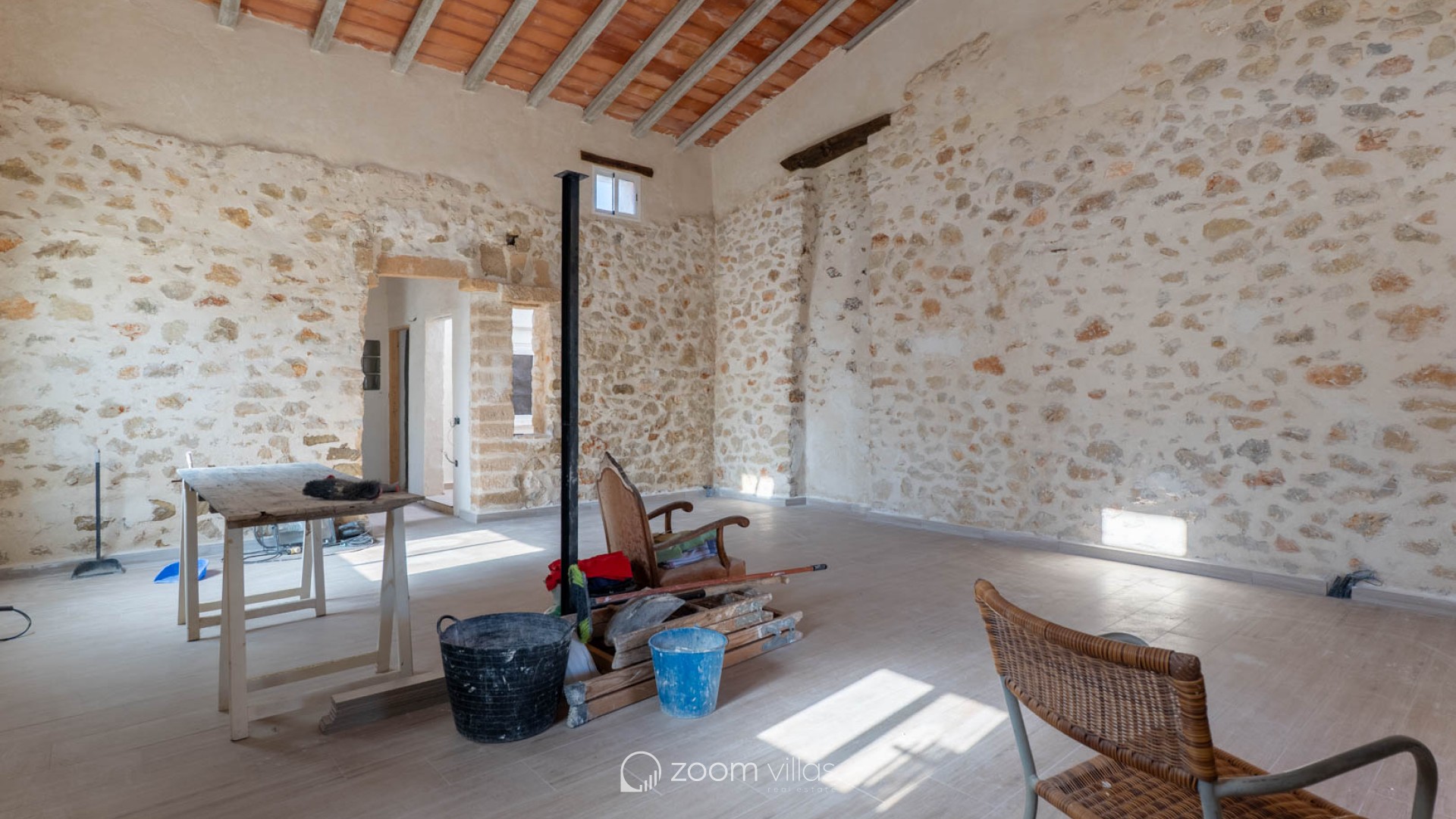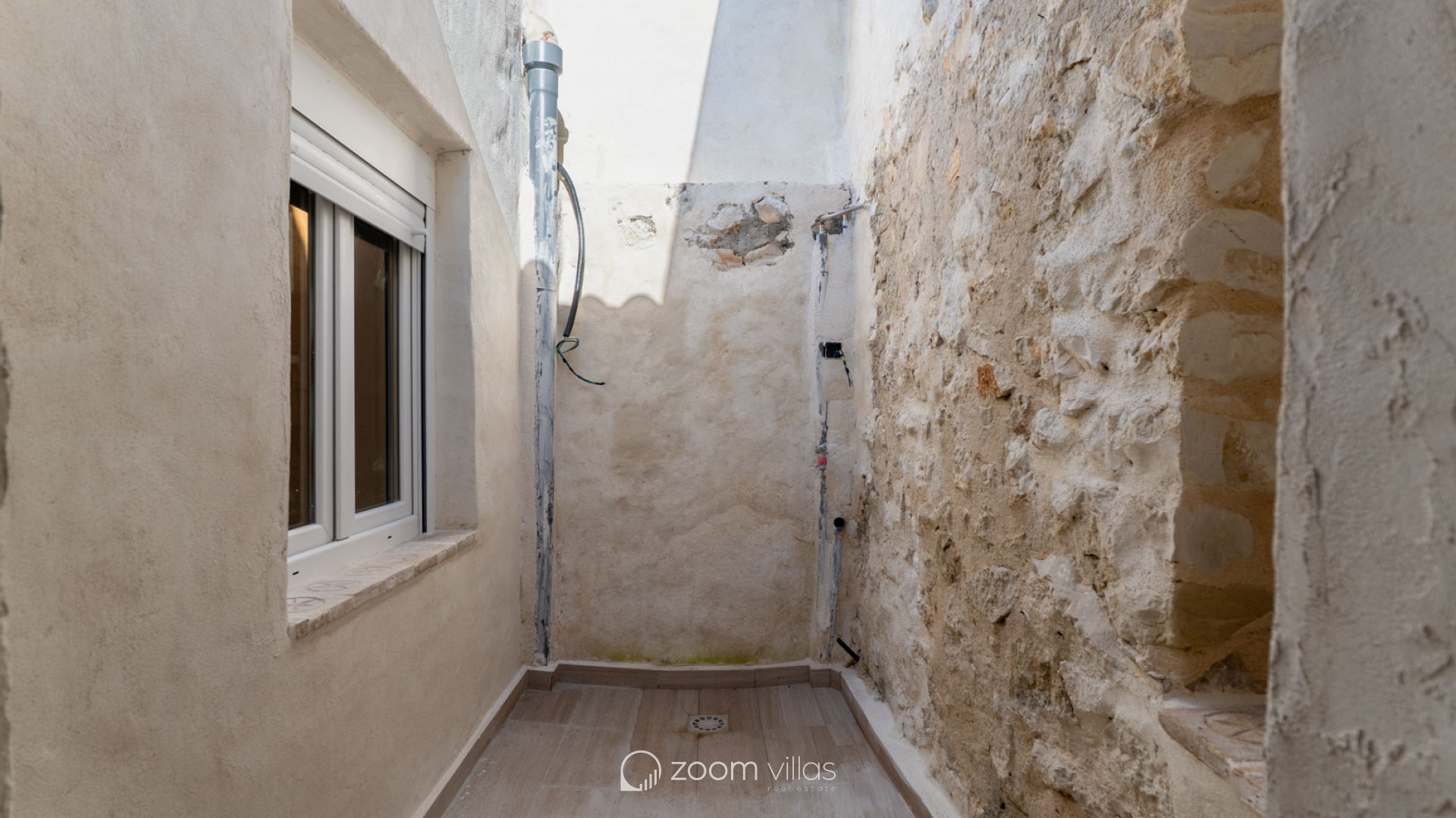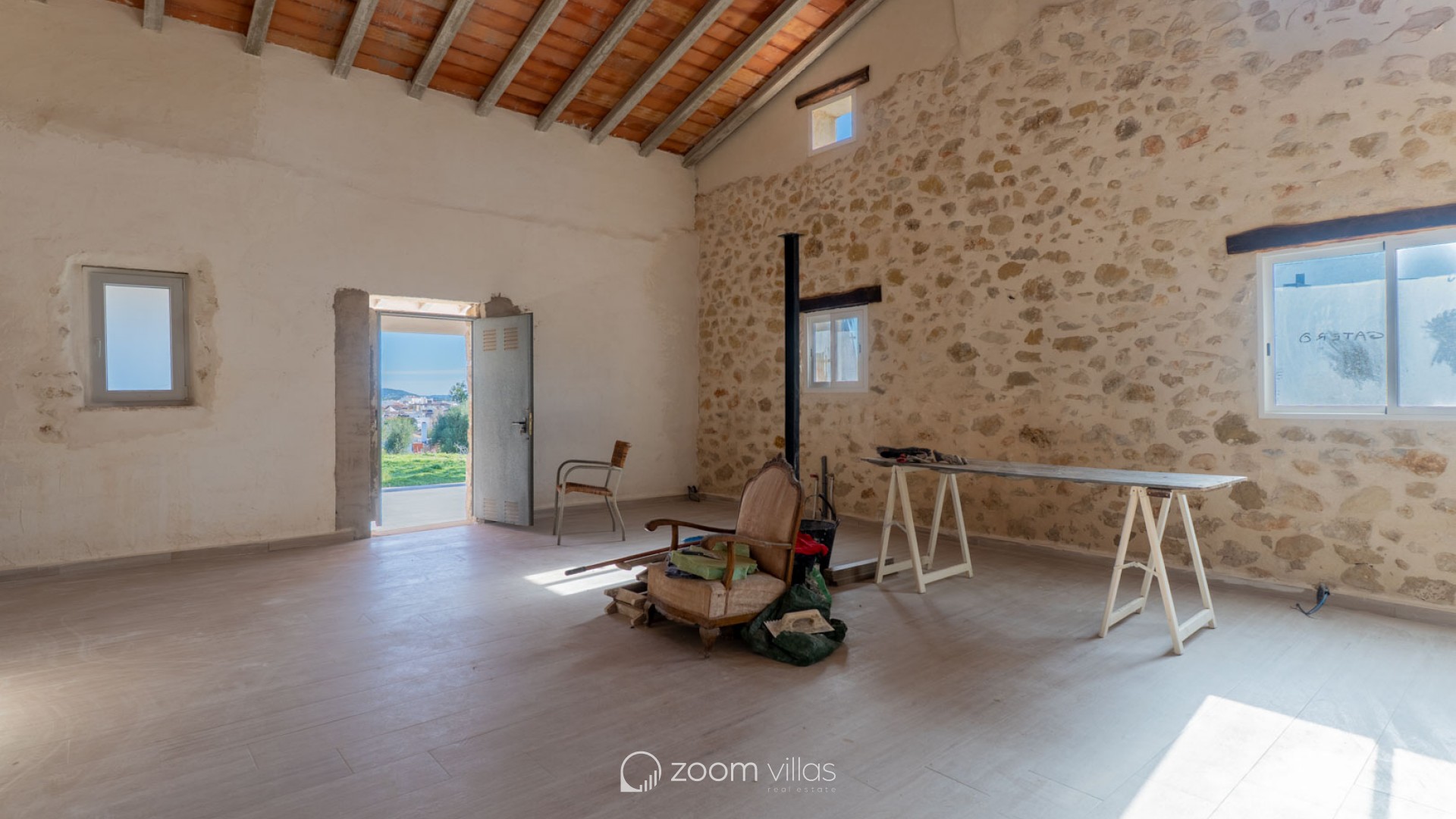 The house has been extended and partially renovated, preserving the original character of the building. It features a main living area where the dry stone walls have been retained, adding authenticity and charm. The roof has been completely renovated and raised to a height of 9 meters, allowing for the possibility of creating an attic or additional living space.