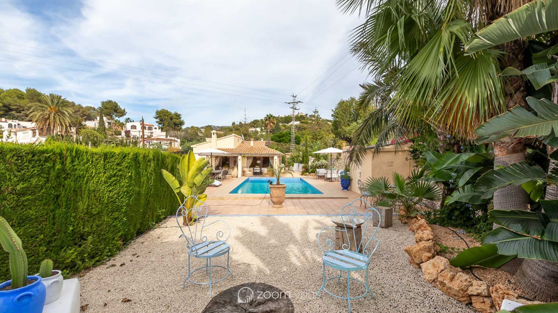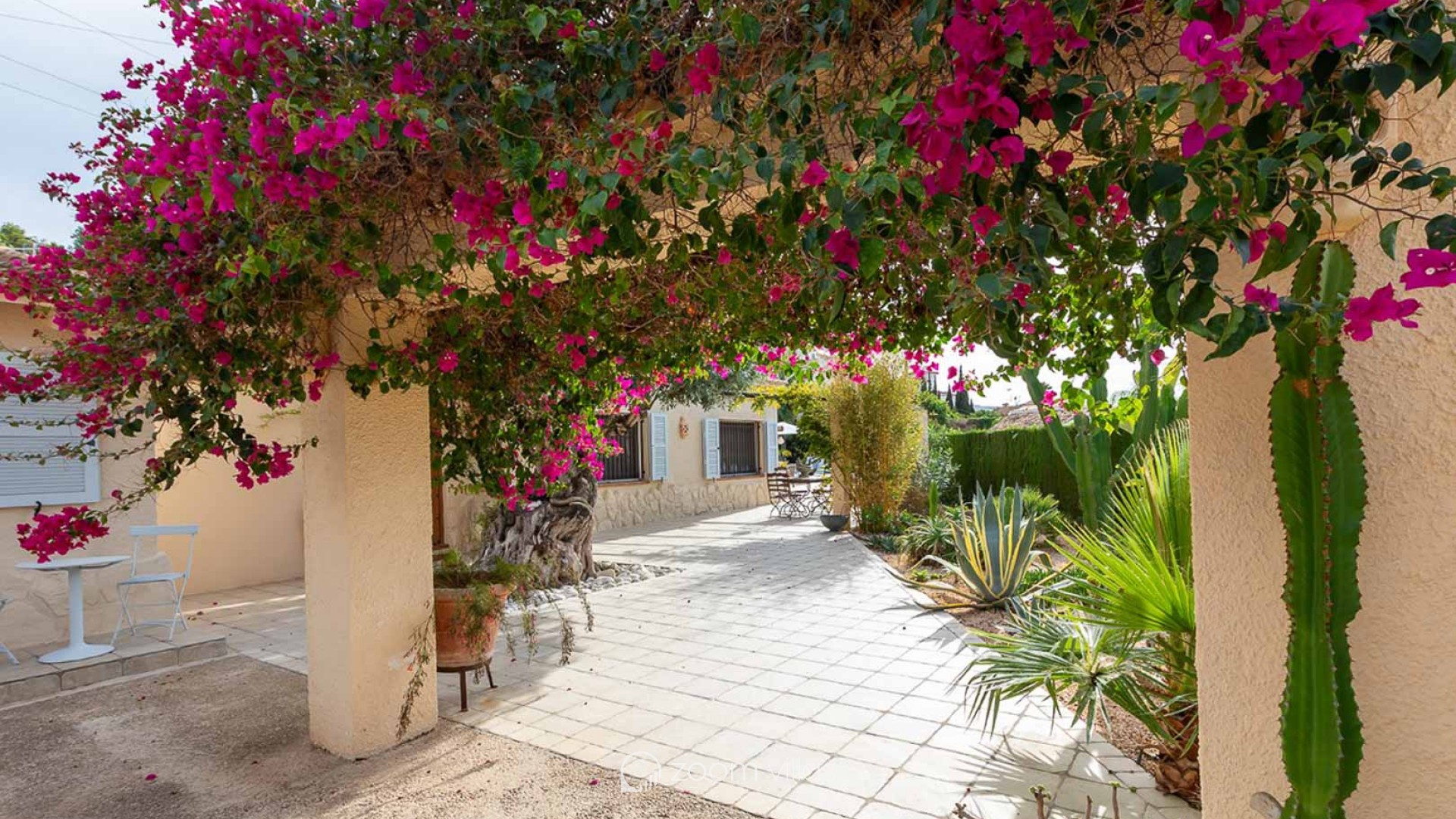 In one of the most sought after areas of Moraira, in the quiet area of Paichi, lies this wonderful single storey villa, elegantly renovated and ready to move into. On a completely flat plot of 1325 m², this property offers a haven of peace and privacy, with charming nooks and crannies to enjoy the sun all day long. With a surface area of 167 m², the villa has been designed to offer a comfortable and functional lifestyle. Its interior combines the rustic charm of wooden details with modern and bright finishes, creating a warm and welcoming atmosphere. The spacious living room, equipped with air conditioning, integrates perfectly with the open-plan kitchen, a real dream for food lovers, equipped with state-of-the-art appliances and an open plan design that invites you to share special moments. The two bedrooms, both spacious and air-conditioned, offer direct access to the living area, reinforcing the feeling of spaciousness and connection to the outside. The master bedroom also has a large and comfortable dressing room. The interior is completed by a modern bathroom, a guest toilet, and outside, an outdoor shower ideal for cooling off after a day at the pool. The outdoor area is a real gem: a covered terrace, perfect for al fresco dining, opens onto a beautiful swimming pool with Roman-style access, surrounded by a low-maintenance garden, carefully landscaped to complement the serene surroundings. In addition, the property has a separate 16 m² space with wired internet connection, currently used as an office, but easily convertible into a cosy guest flat. There is private parking for three vehicles, adding even more comfort. Located just one kilometre from the nearest supermarket and a mere four minute drive from the golden beaches of Moraira, this villa offers a perfect combination of tranquillity, privacy and easy access to all amenities. A unique opportunity to live the authentic Mediterranean lifestyle, either as a permanent residence or as an exclusive holiday home, a villa to fall in love with at first sight!