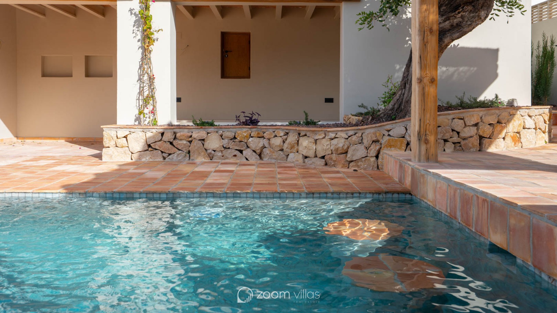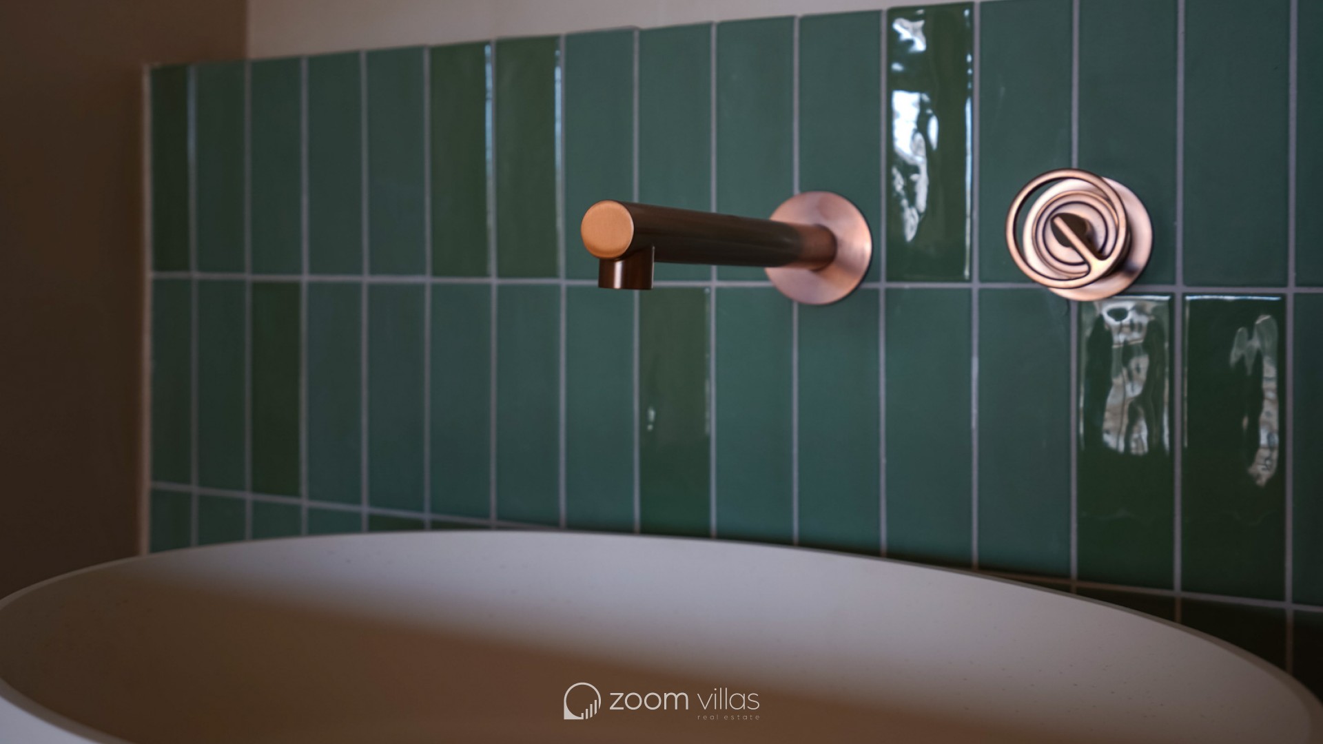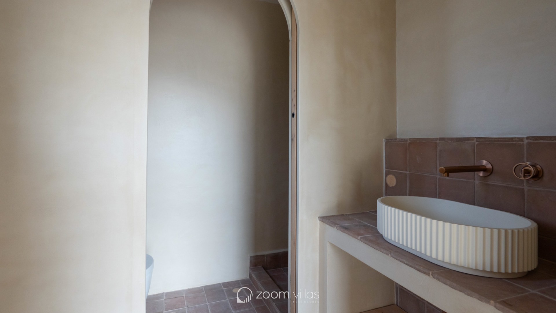 Throughout the living areas and bedrooms, fixed furniture and accents in MATTEO BRIONNI clay, solid oak doors and built-in wardrobes create a warm, natural atmosphere. The bathrooms are stylishly finished with high-quality sanitary fittings. Polished concrete floors run throughout the interior of the property, while terracotta tiles are used outdoors.