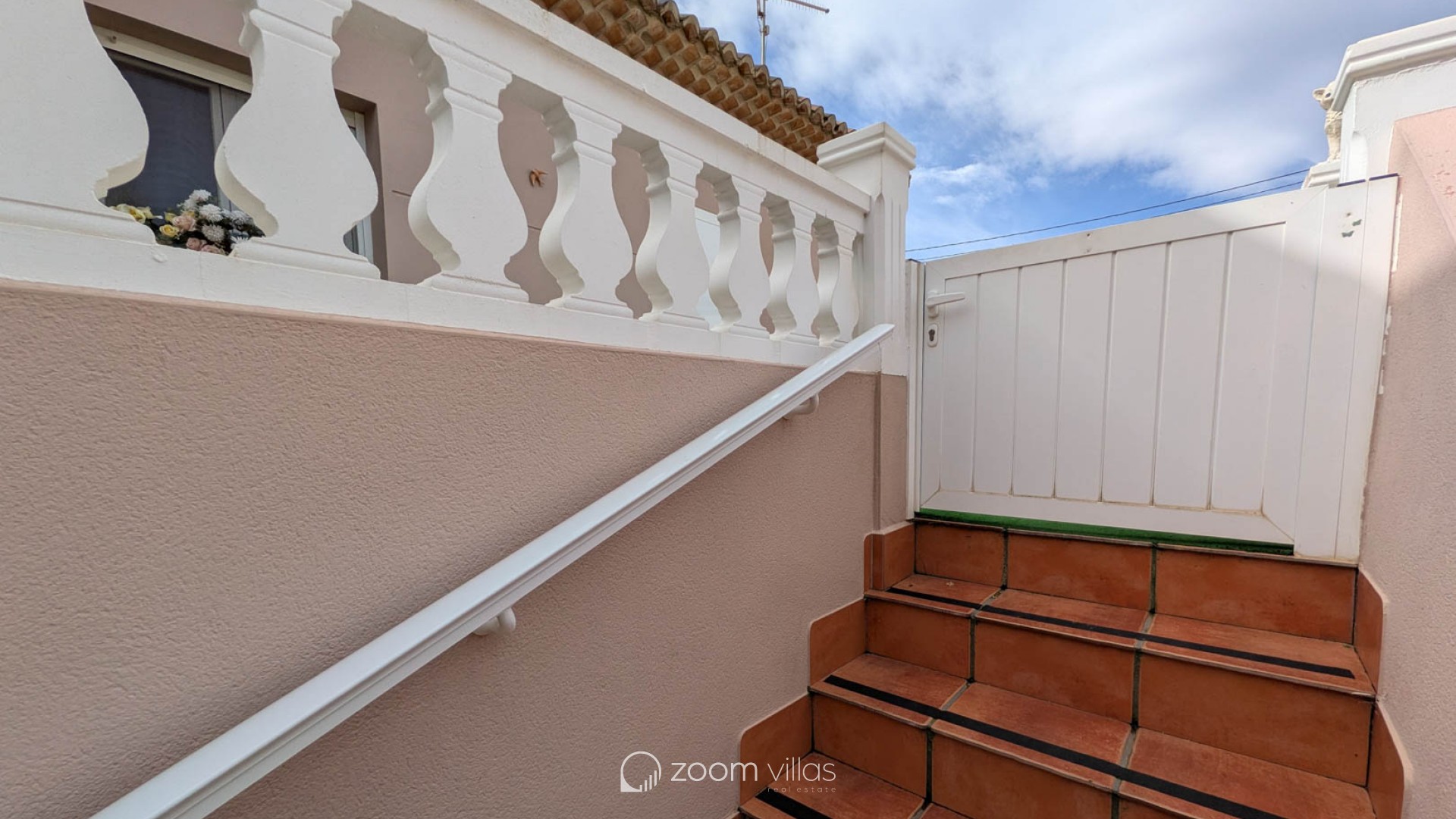 The property is located on the upper floor of a detached villa, offering privacy and tranquility. Access is via stairs leading to a spacious terrace that connects the storage/laundry room to the main entrance. From the entrance hall, the rooms are distributed as follows: three bedrooms (two doubles and one single, all with built-in wardrobes), a full bathroom, a separate kitchen, and a bright living-dining room with direct access to a stunning outdoor terrace, perfect for enjoying the Mediterranean climate, al fresco dining, and moments of relaxation.