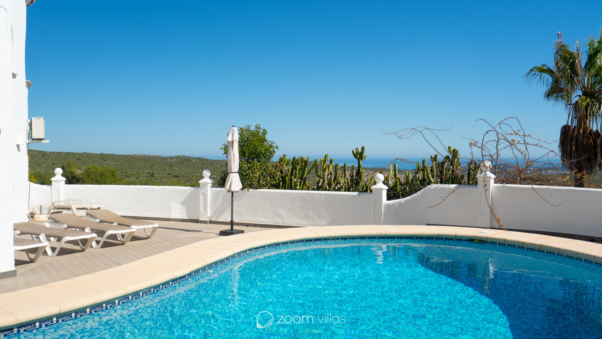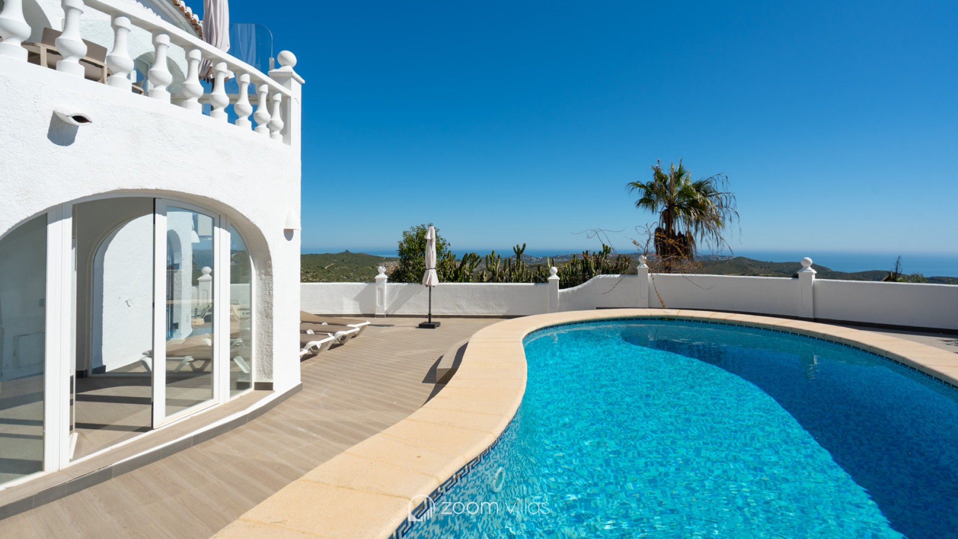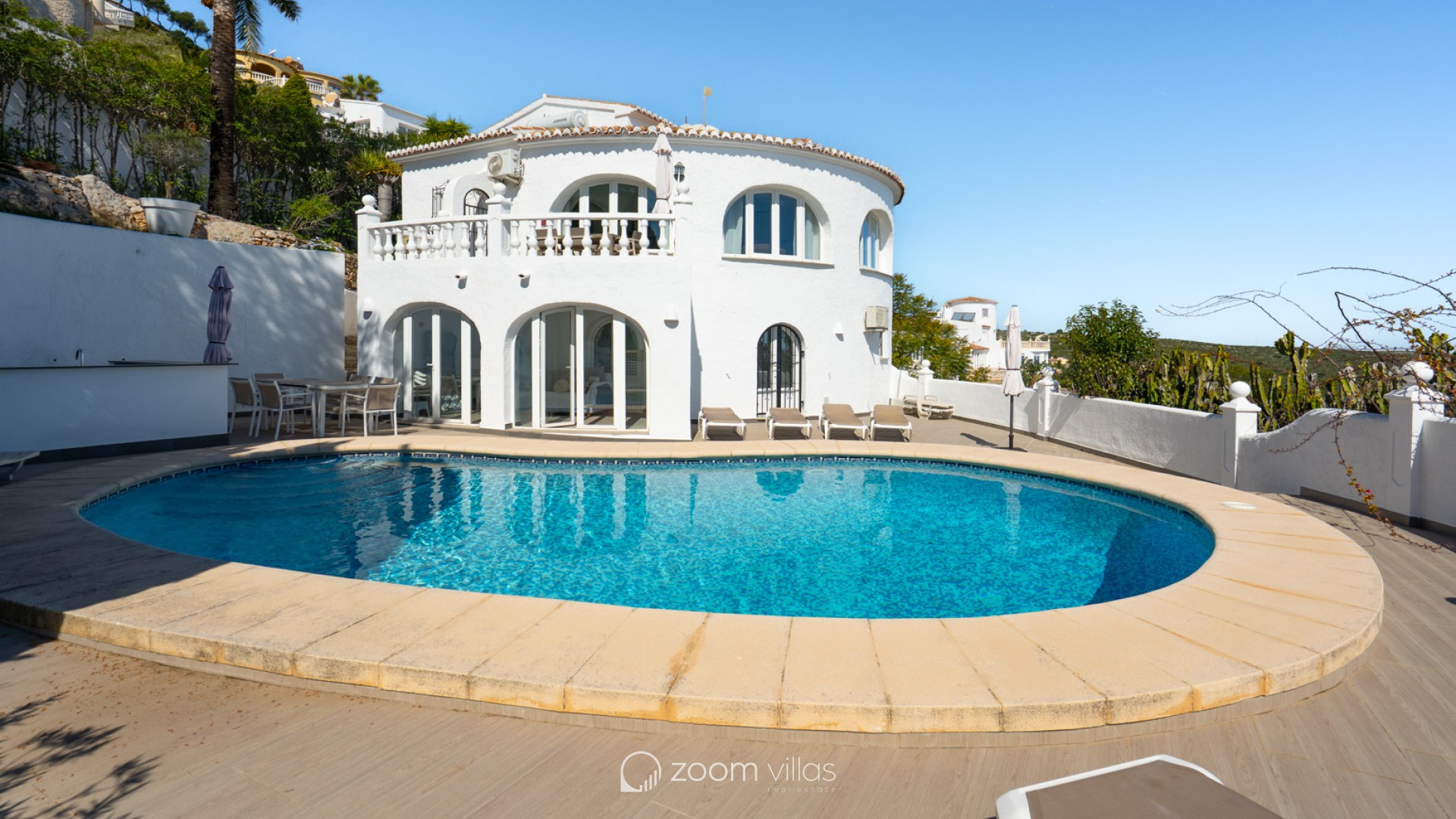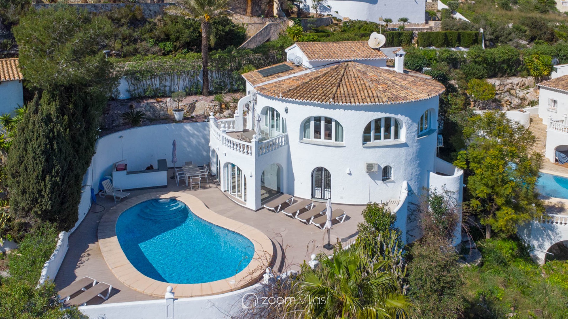 Beautiful traditional villa with panoramic sea views for sale in Cumbre del Sol This villa is located in the peaceful urbanisation of Cumbre del Sol and offers breathtaking views over the Granadella Natural Park, the impressive cliffs of Cumbre del Sol and the Mediterranean Sea. The property is distributed over two floors. The upper floor consists of a spacious living-dining room with fireplace and a fully equipped semi-open kitchen. From the living room there is access to a south-facing terrace, ideal for outdoor dining all year round. This level also features a spacious double bedroom and a bathroom. The lower floor hosts the master bedroom with en-suite bathroom and two double bedrooms sharing a bathroom. There is also a glazed naya with direct access to the swimming pool. The heated pool is surrounded by a spacious sun terrace with outdoor kitchen, perfect for enjoying the Mediterranean climate. The villa is further equipped with central heating via radiators, air conditioning in all rooms, shutters, solar panels for hot water and private parking. Cumbre del Sol is known for its peaceful surroundings, beautiful nature and excellent amenities, including an international school, supermarket and several restaurants. The villa is conveniently located just approx. 10 minutes from Moraira and Jávea, and a short distance from beaches and all necessary facilities.
