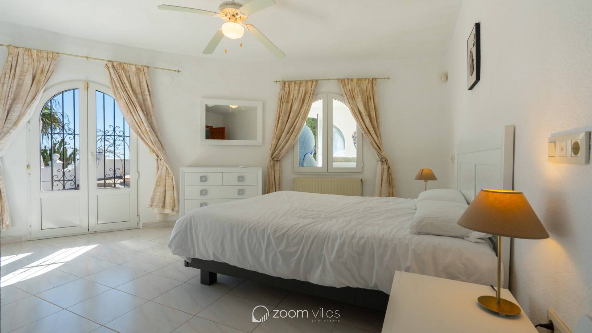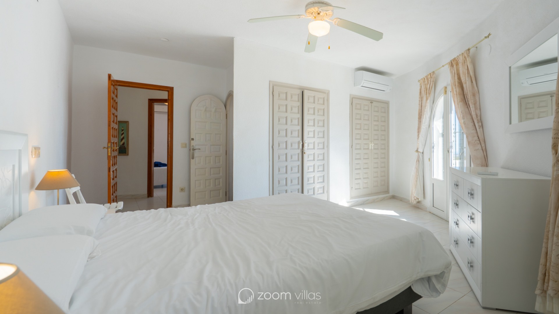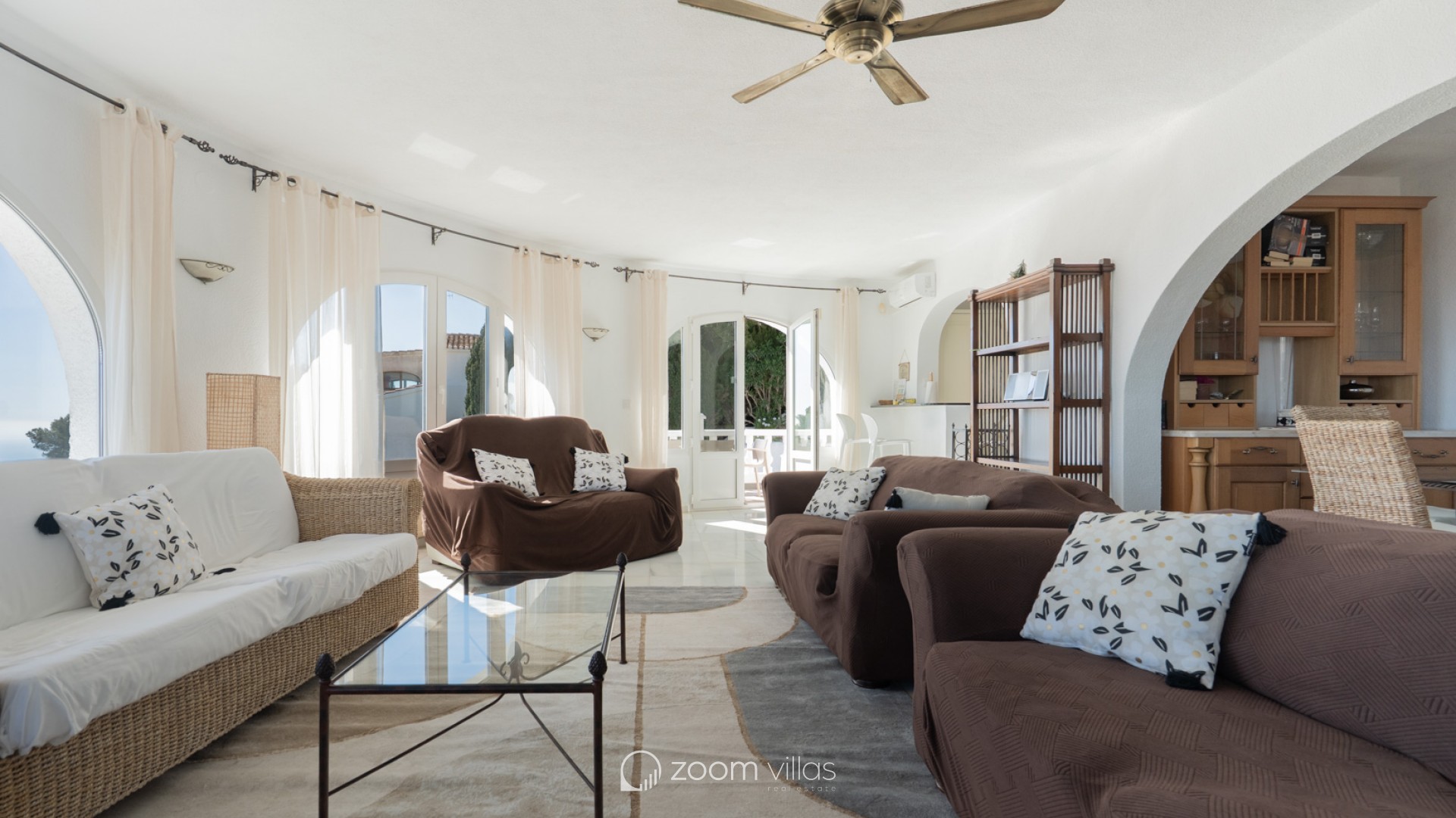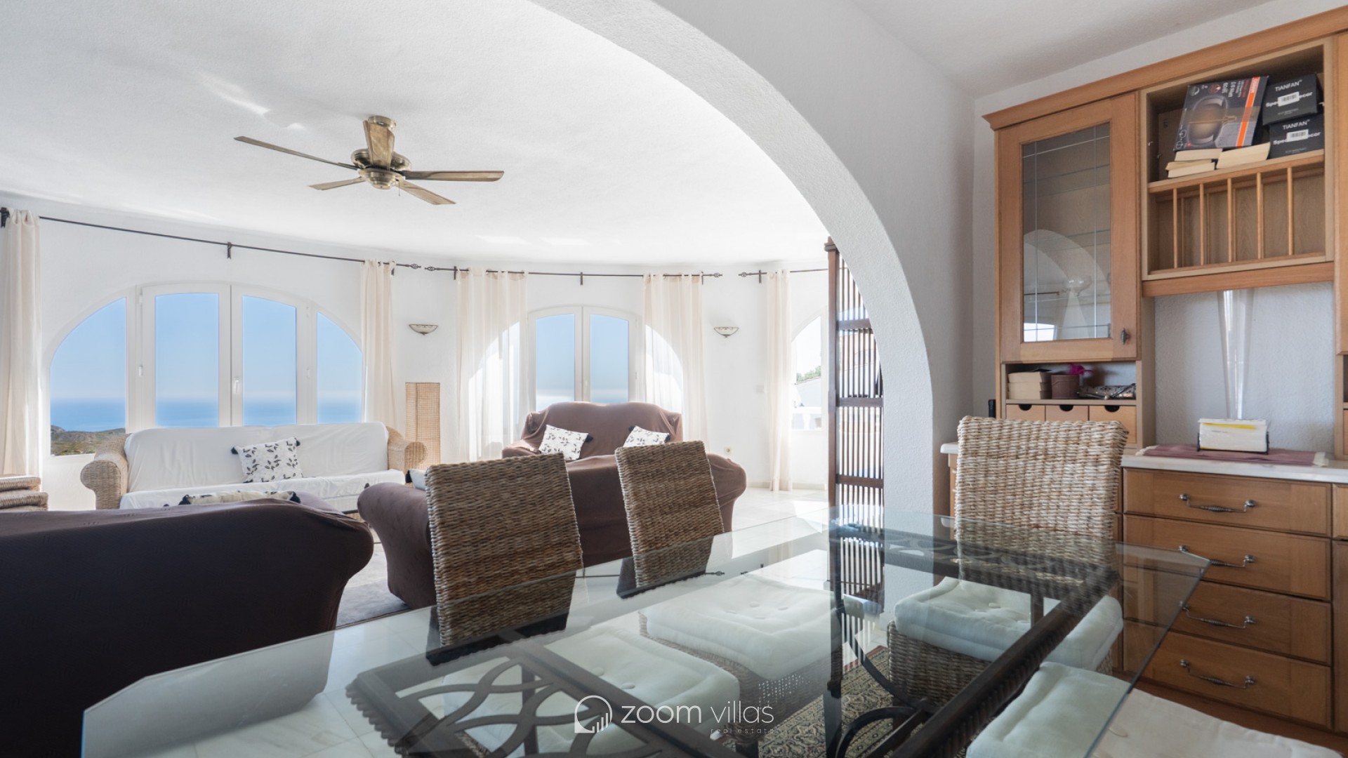 Beautiful traditional villa with panoramic sea views for sale in Cumbre del Sol This villa is located in the peaceful urbanisation of Cumbre del Sol and offers breathtaking views over the Granadella Natural Park, the impressive cliffs of Cumbre del Sol and the Mediterranean Sea. The property is distributed over two floors. The upper floor consists of a spacious living-dining room with fireplace and a fully equipped semi-open kitchen. From the living room there is access to a south-facing terrace, ideal for outdoor dining all year round. This level also features a spacious double bedroom and a bathroom. The lower floor hosts the master bedroom with en-suite bathroom and two double bedrooms sharing a bathroom. There is also a glazed naya with direct access to the swimming pool. The heated pool is surrounded by a spacious sun terrace with outdoor kitchen, perfect for enjoying the Mediterranean climate. The villa is further equipped with central heating via radiators, air conditioning in all rooms, shutters, solar panels for hot water and private parking. Cumbre del Sol is known for its peaceful surroundings, beautiful nature and excellent amenities, including an international school, supermarket and several restaurants. The villa is conveniently located just approx. 10 minutes from Moraira and Jávea, and a short distance from beaches and all necessary facilities.